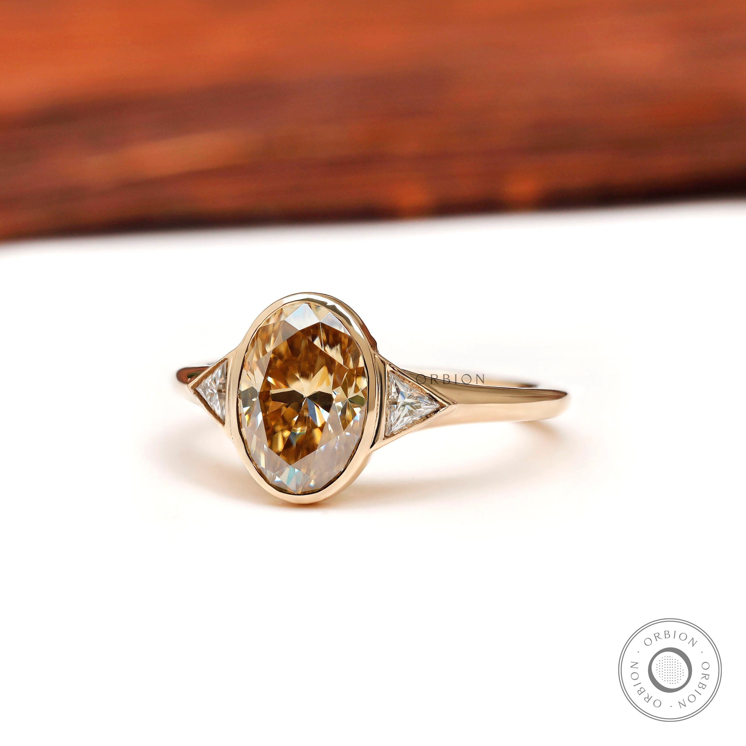 Oval Cut Champagne Moissanite Bezel Engagement Ring Three Stone Wedding Ring Color Moissanite Ring For Women Yellow Gold Anniversary Ring