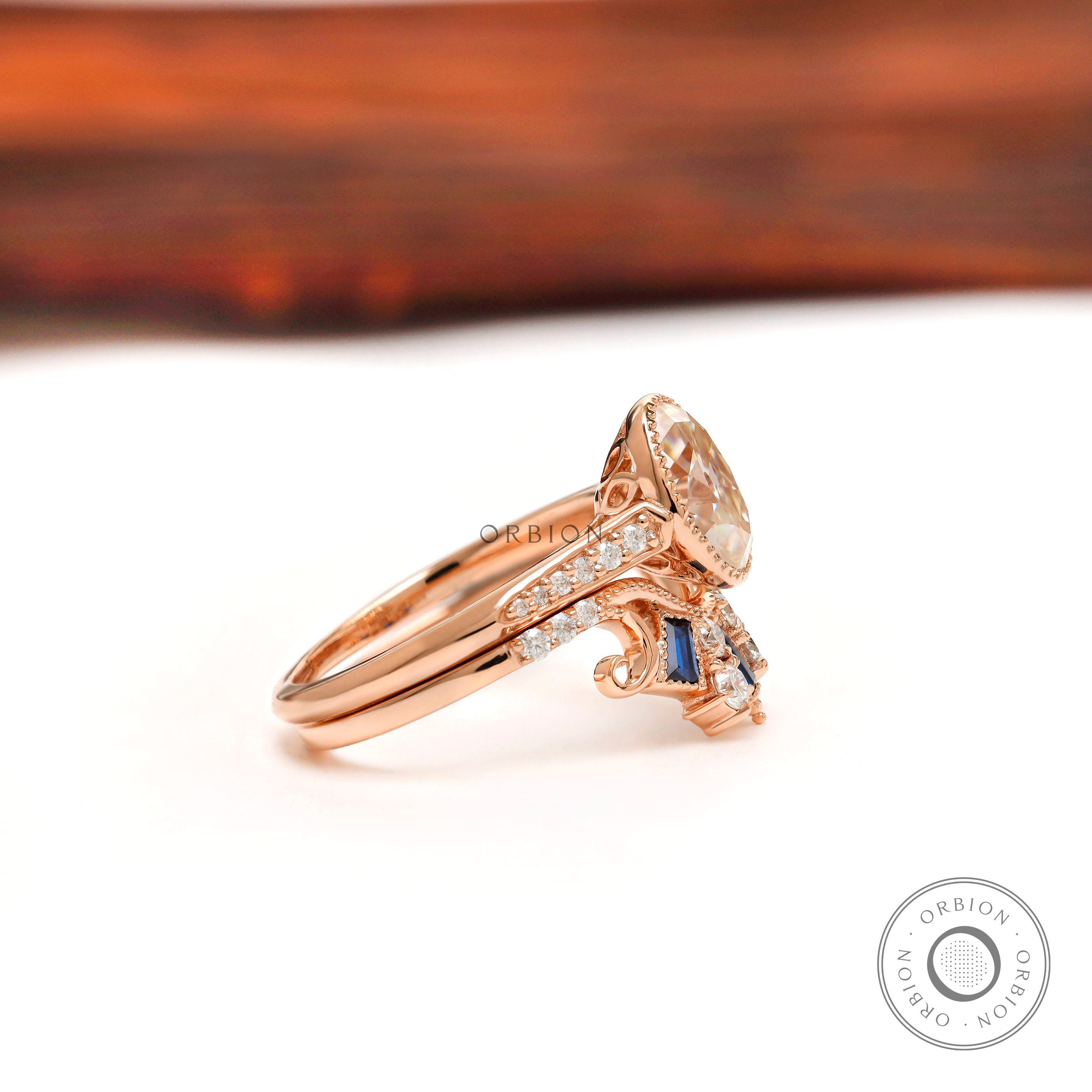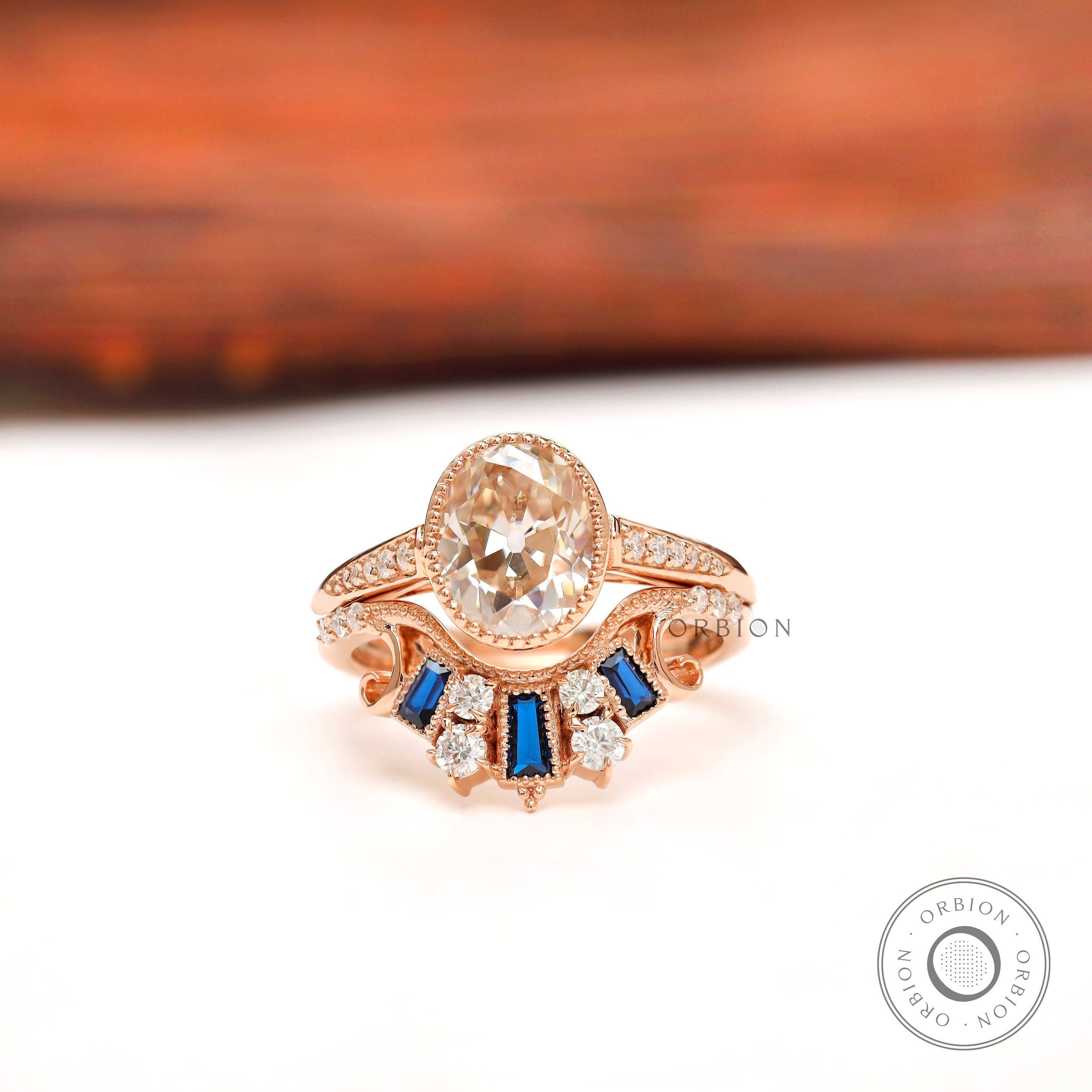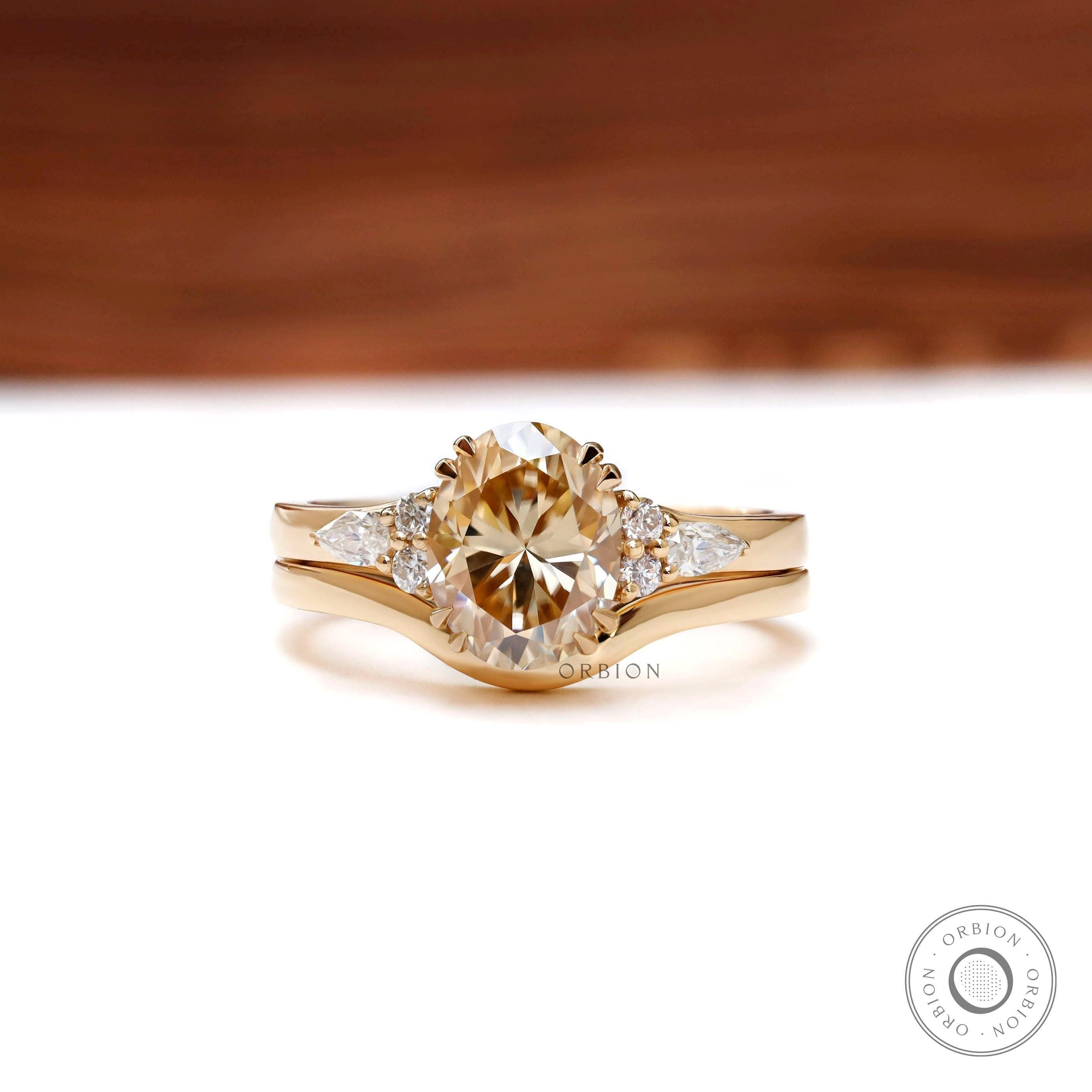 Oval Champagne Moissanite Ring Set, Oval Engagement Ring With Matching Band, Bridal Ring Set, Wedding Ring Set, Classic Curved Matching Band