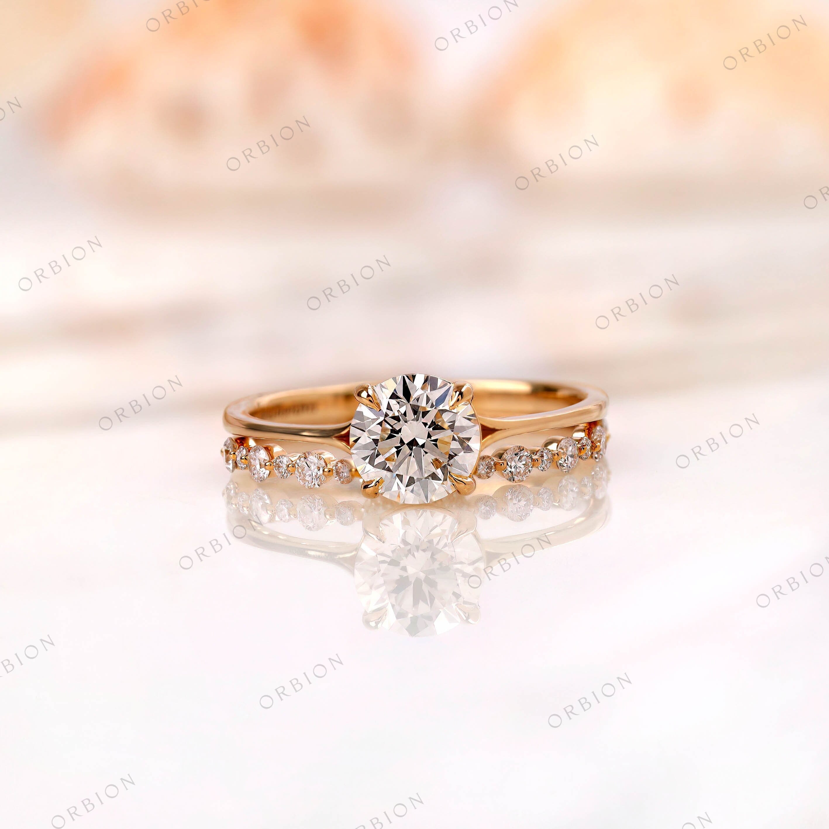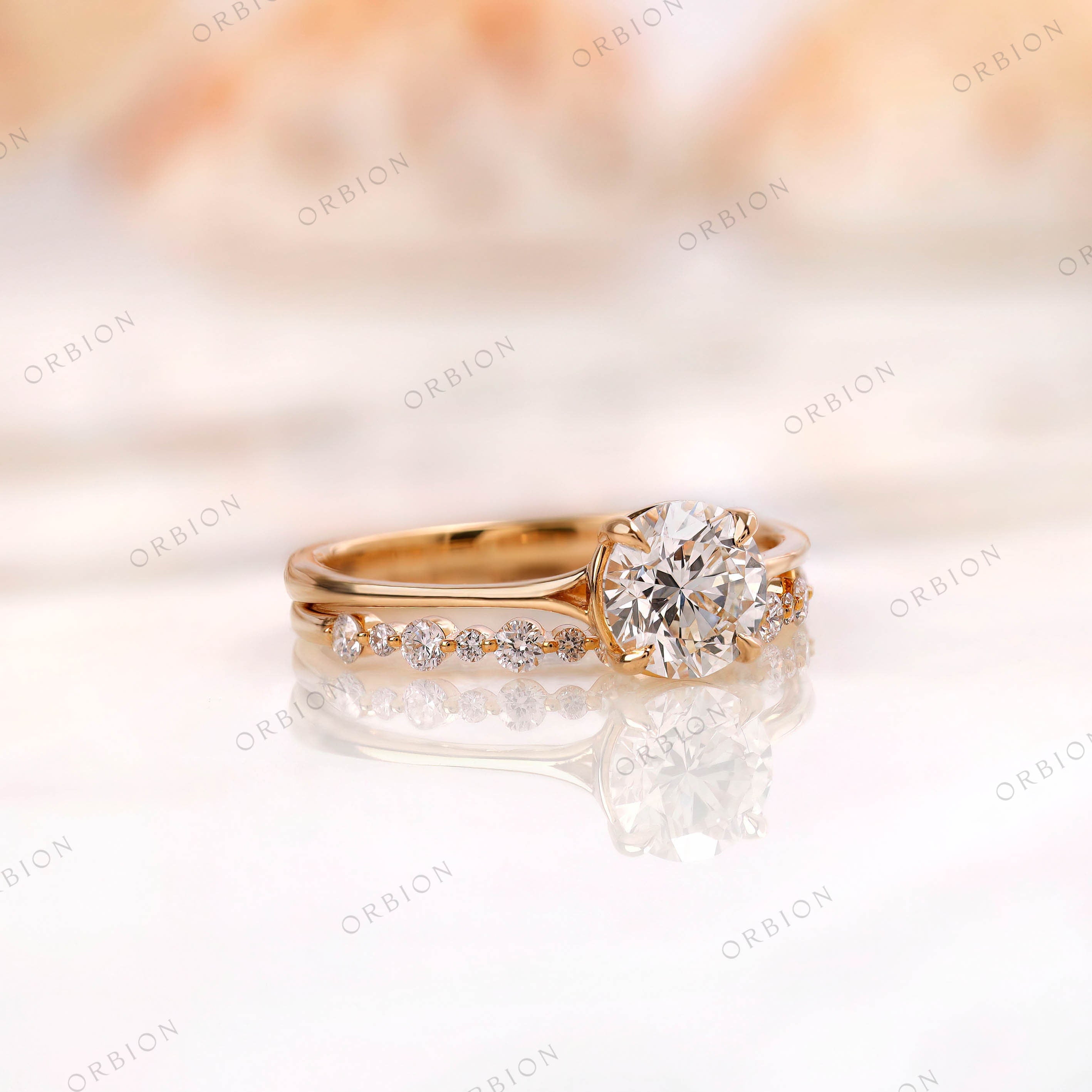 Round Lab Grown Diamond Engagement Ring, 14k Solid Gold Boho/Bohemian Ring, Stack Rings Set, Bridal Ring Set, Dainty Wedding Ring Set