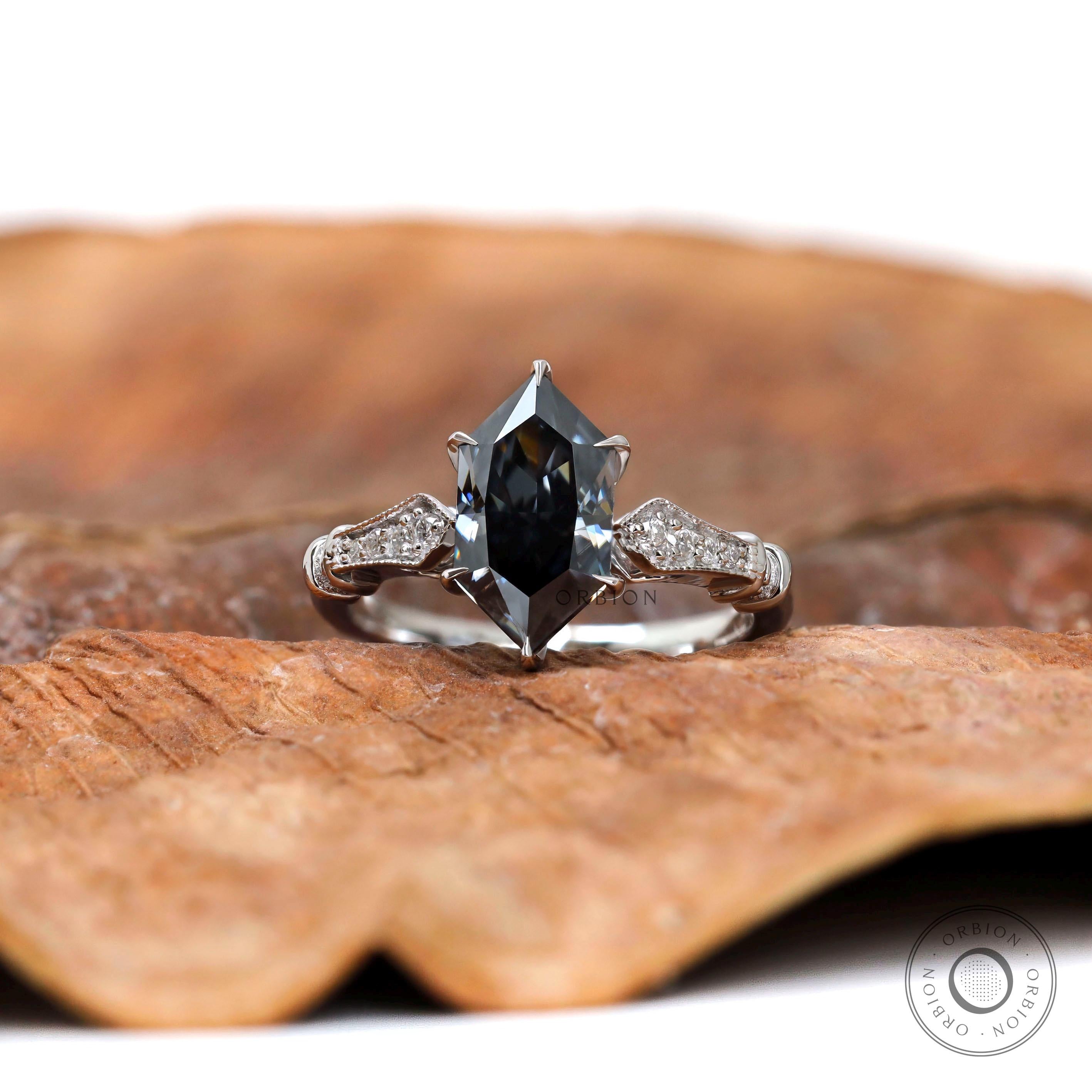 Step Cut Hexagon Dark Grey Moissanite Ring, Vintage Engagement Ring, 14K White Gold Art Deco Ring, Milgrain Promise Ring, Proposal Ring