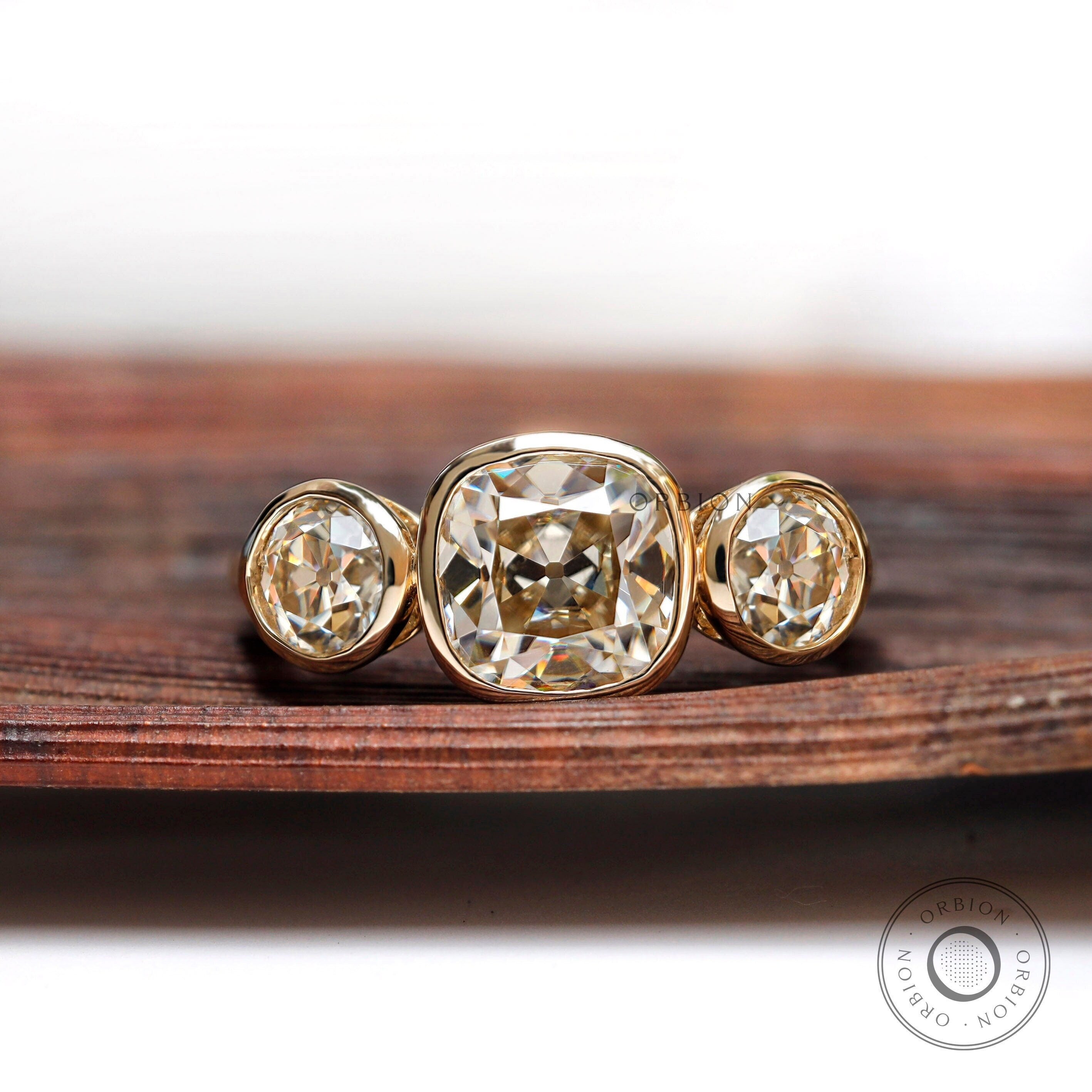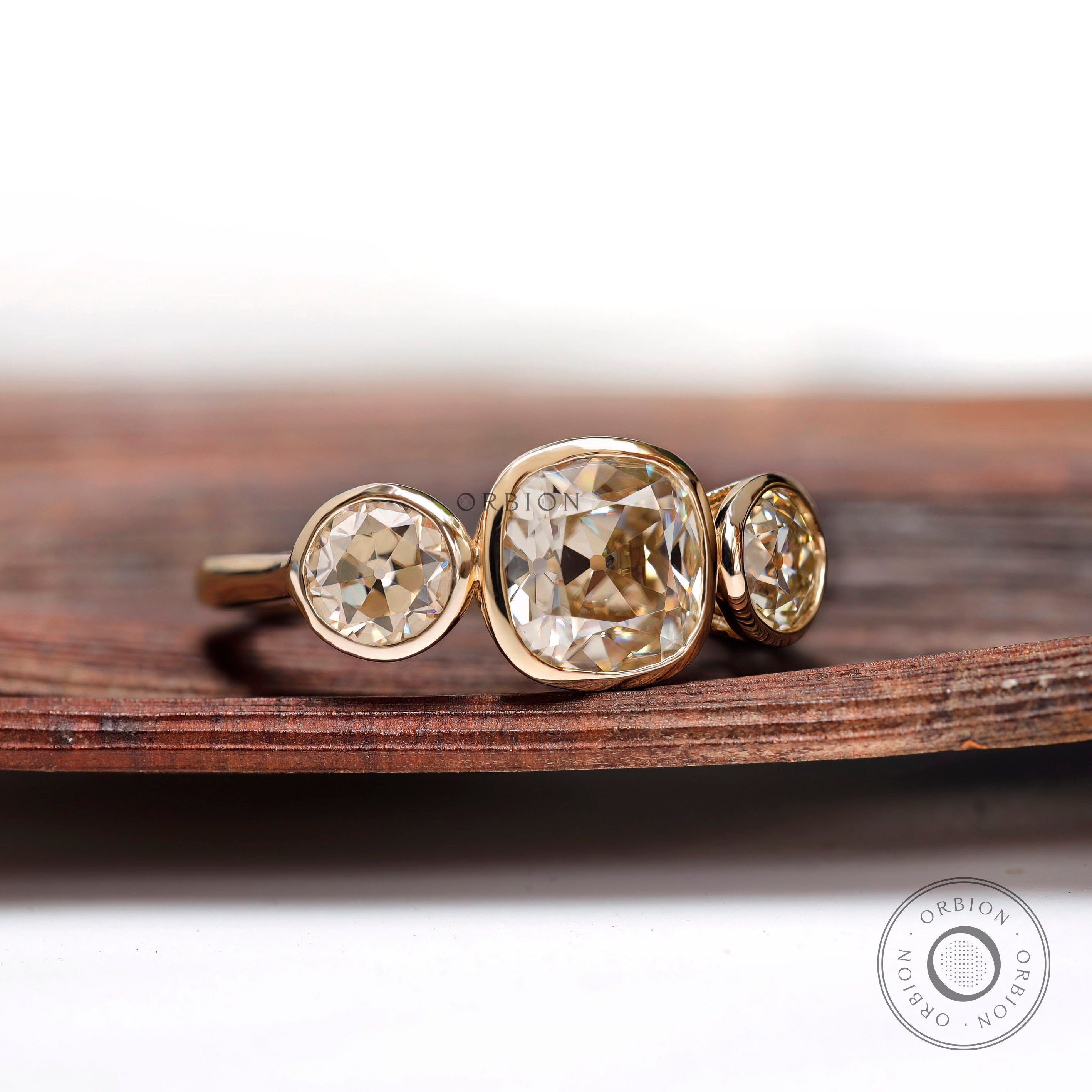 Three Stone Bezel Set Trilogy Champagne Moissanite Ring 3 Stone Vintage Ring Solid Gold Unique Color Moissanite Wedding Bridal Ring