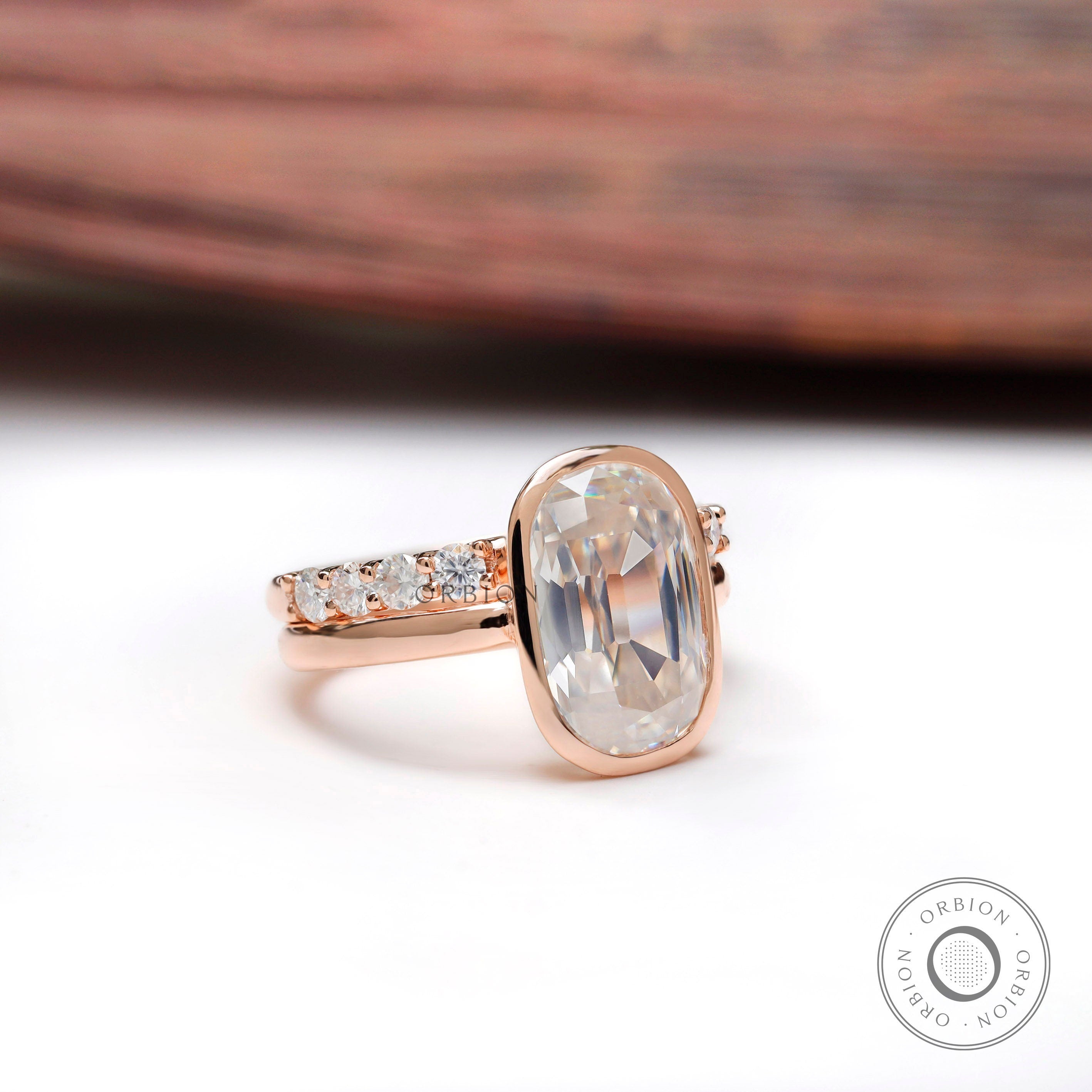 Oval Moissanite Engagement Ring Split Shank Half Bezel Old Mine Cut Floating Setting 14k Gold Statement Ring for Women Unique Design