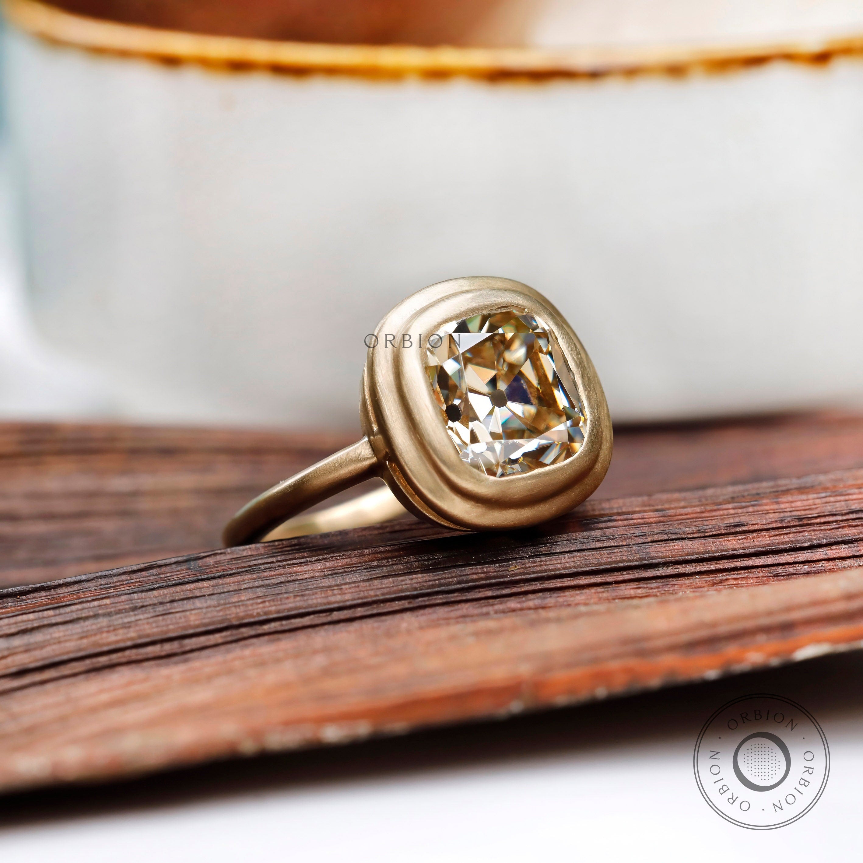 OMC Cushion Champagne Moissanite Engagement Ring Brushed Matte Finish Double Bezel Set Ring Vintage Solitaire Ring Color Moissanite Ring