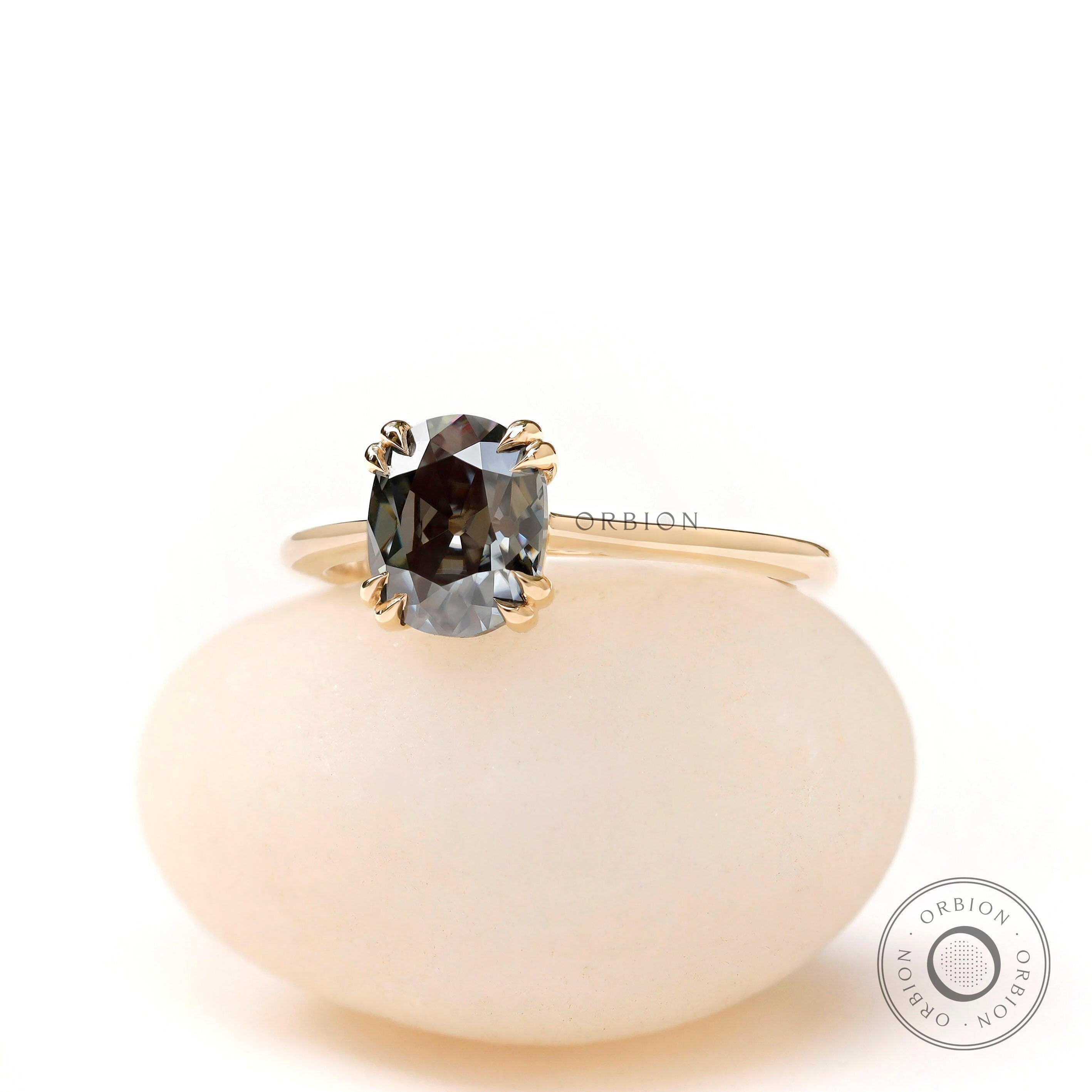 OMC Elongated Cushion Grey Moissanite Ring, Grey Stone Engagement Ring, Yellow Gold Rings For Women, Cathedral Ring Moissanite, Old Cut Ring