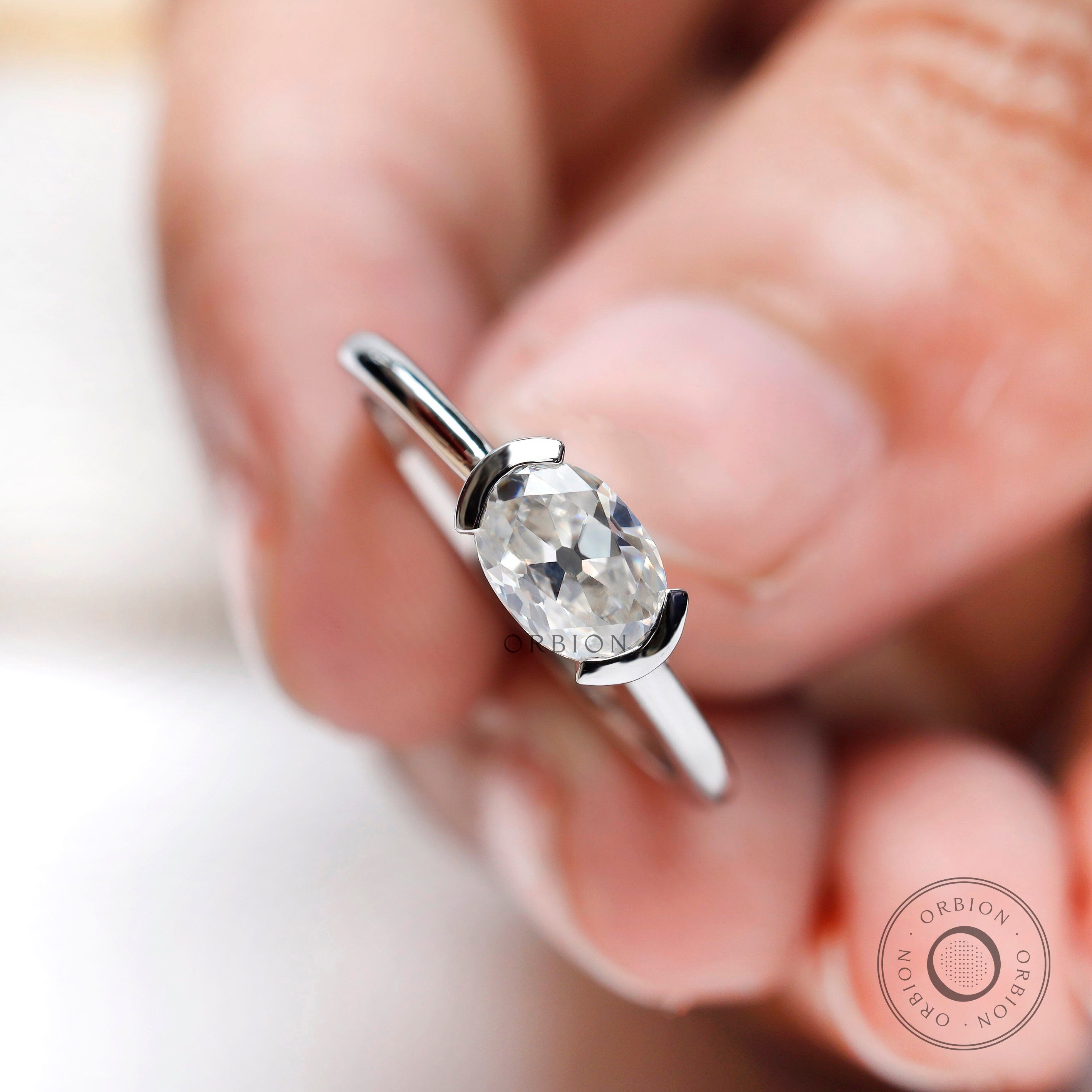 Oval Moissanite Ring, Old Mine Cut Ring, Half Bezel Engagement Ring, 14K White Gold Dainty East West Ring, Oval Promise Ring, Delicate Ring