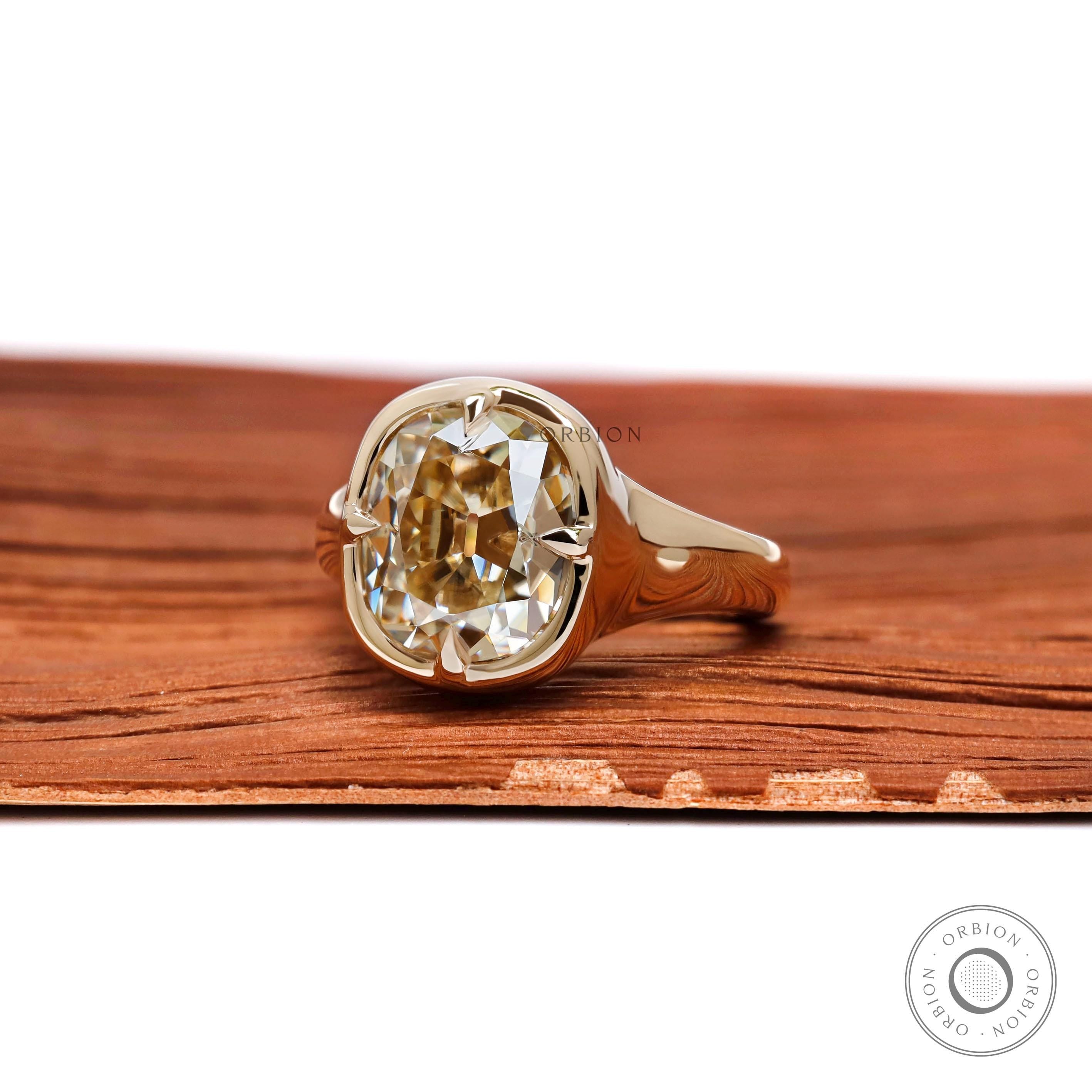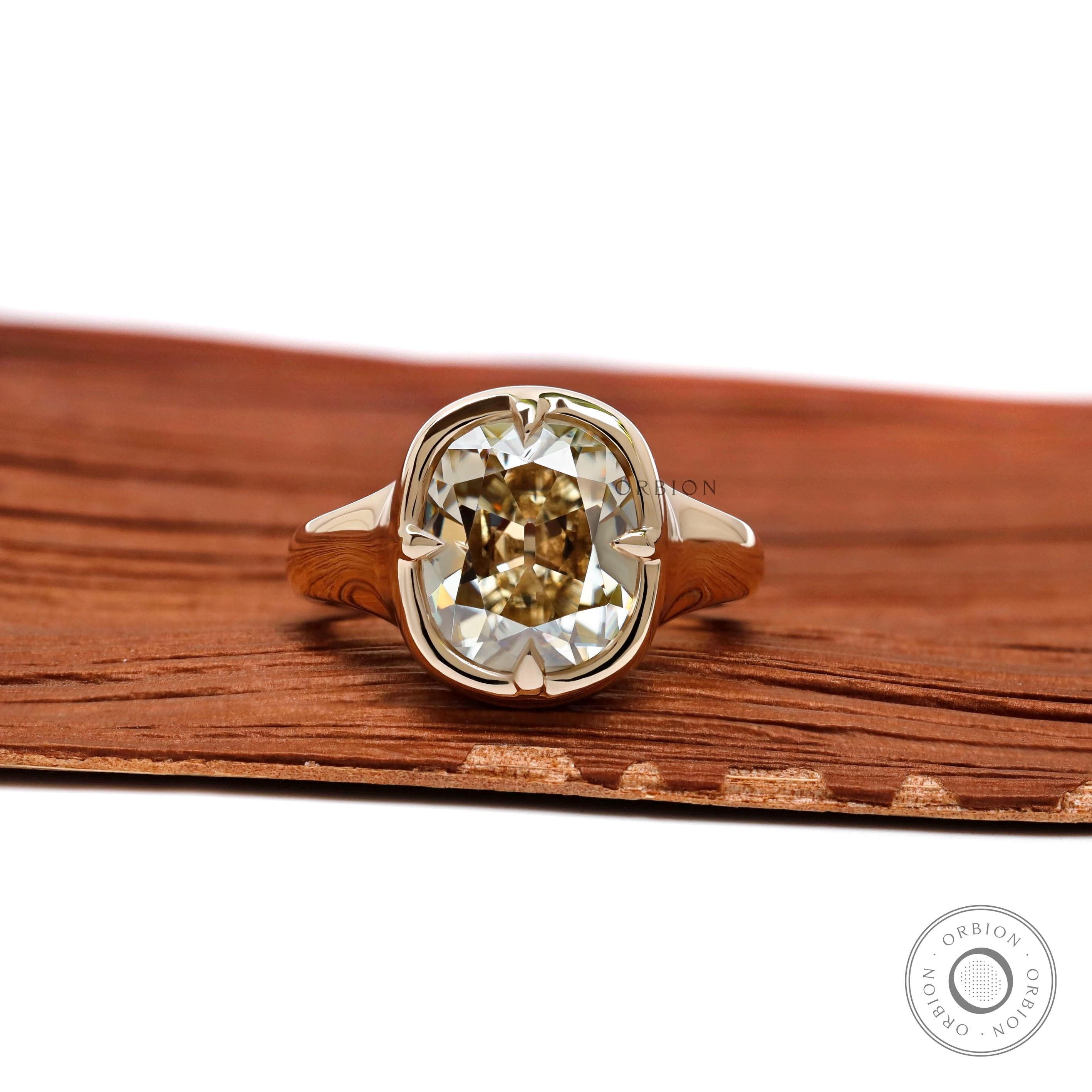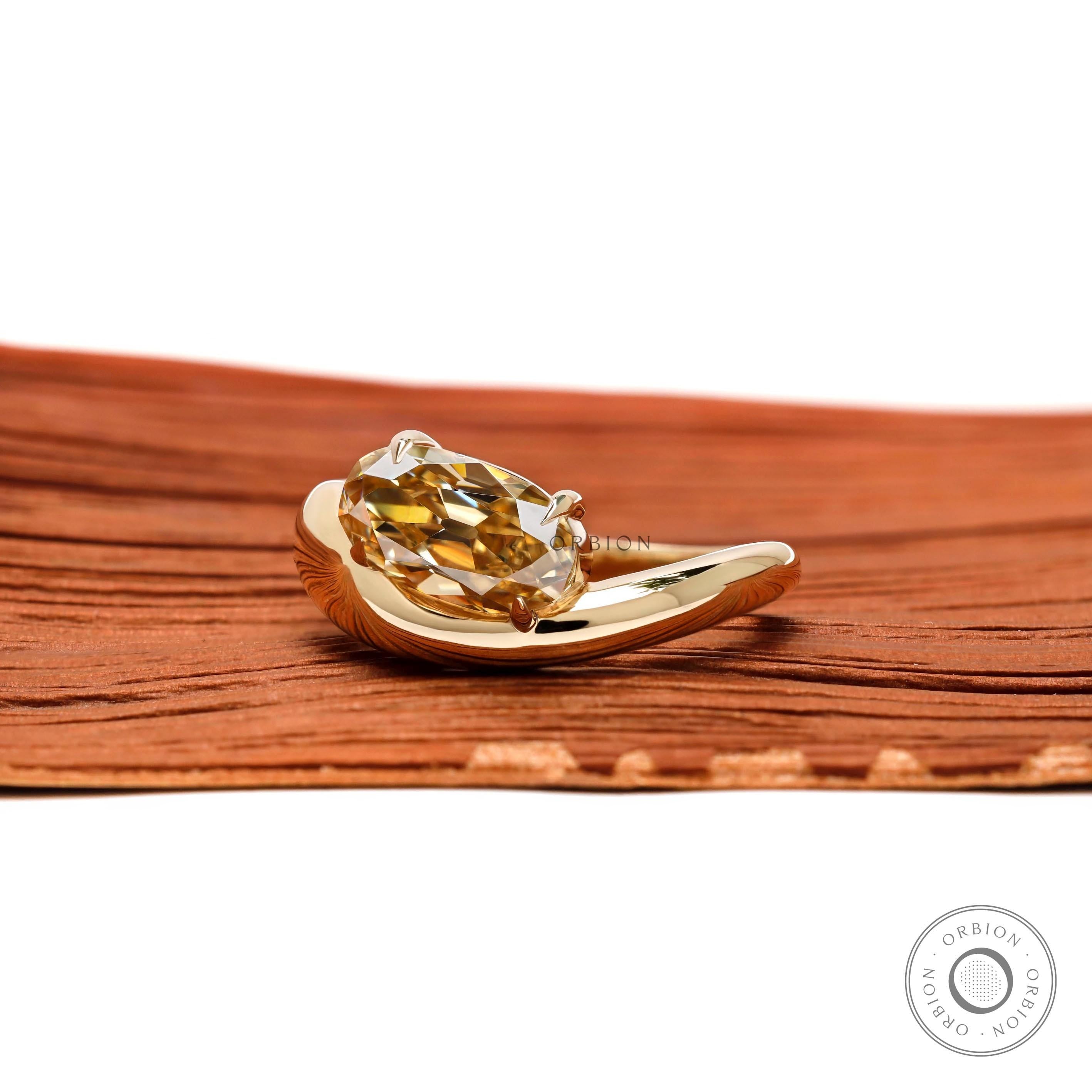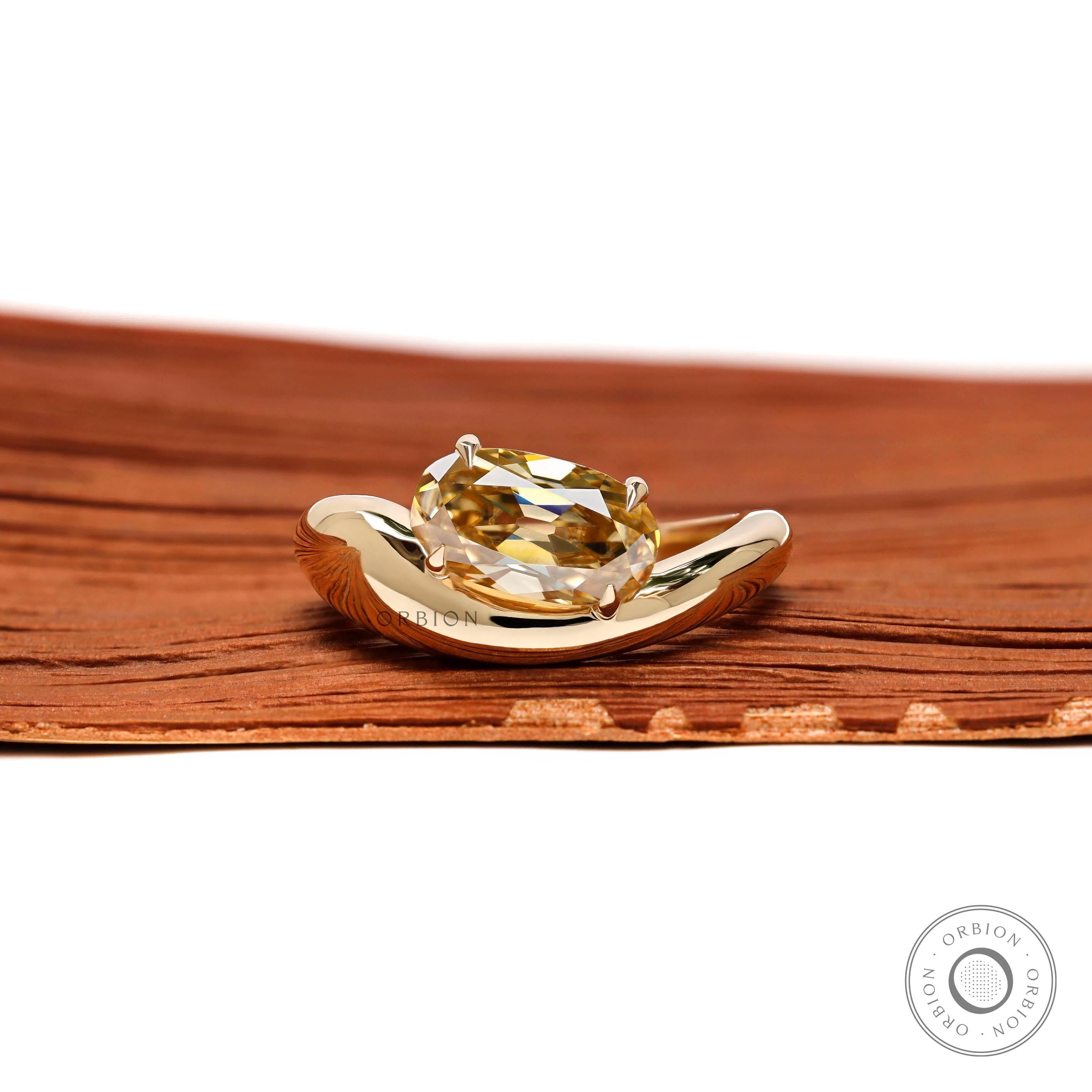 Modern Chunky Statement Ring, Old Mine Cut Elongated Oval Yellowish Champagne Moissanite Ring in 10K Yellow Gold, Champagne Wedding Ring