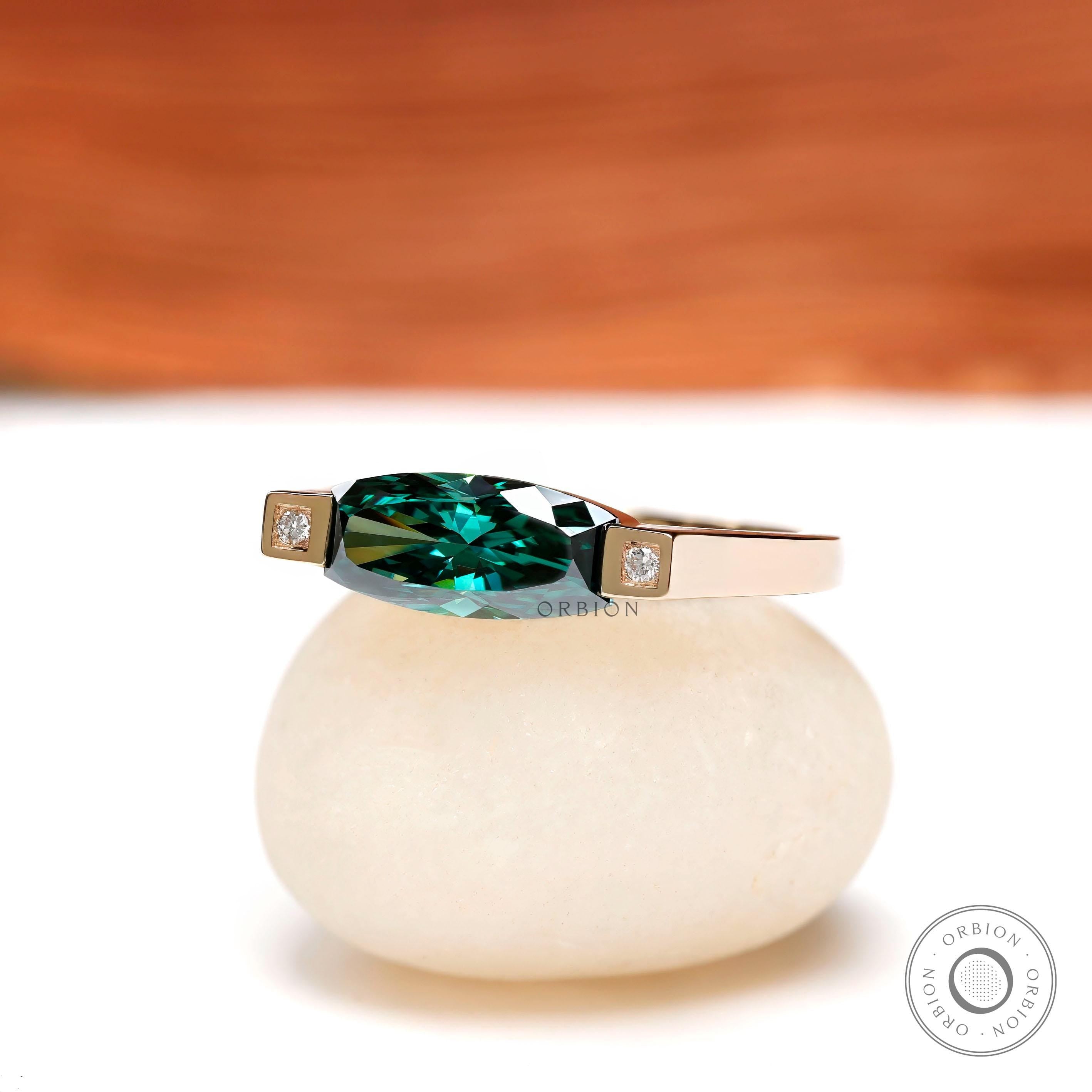 Chunky Yellow Gold Bridal Ring with Custom Cut Moissanite - Modern and Luxurious Statement Piece, Handcrafted Green Moissanite Ring