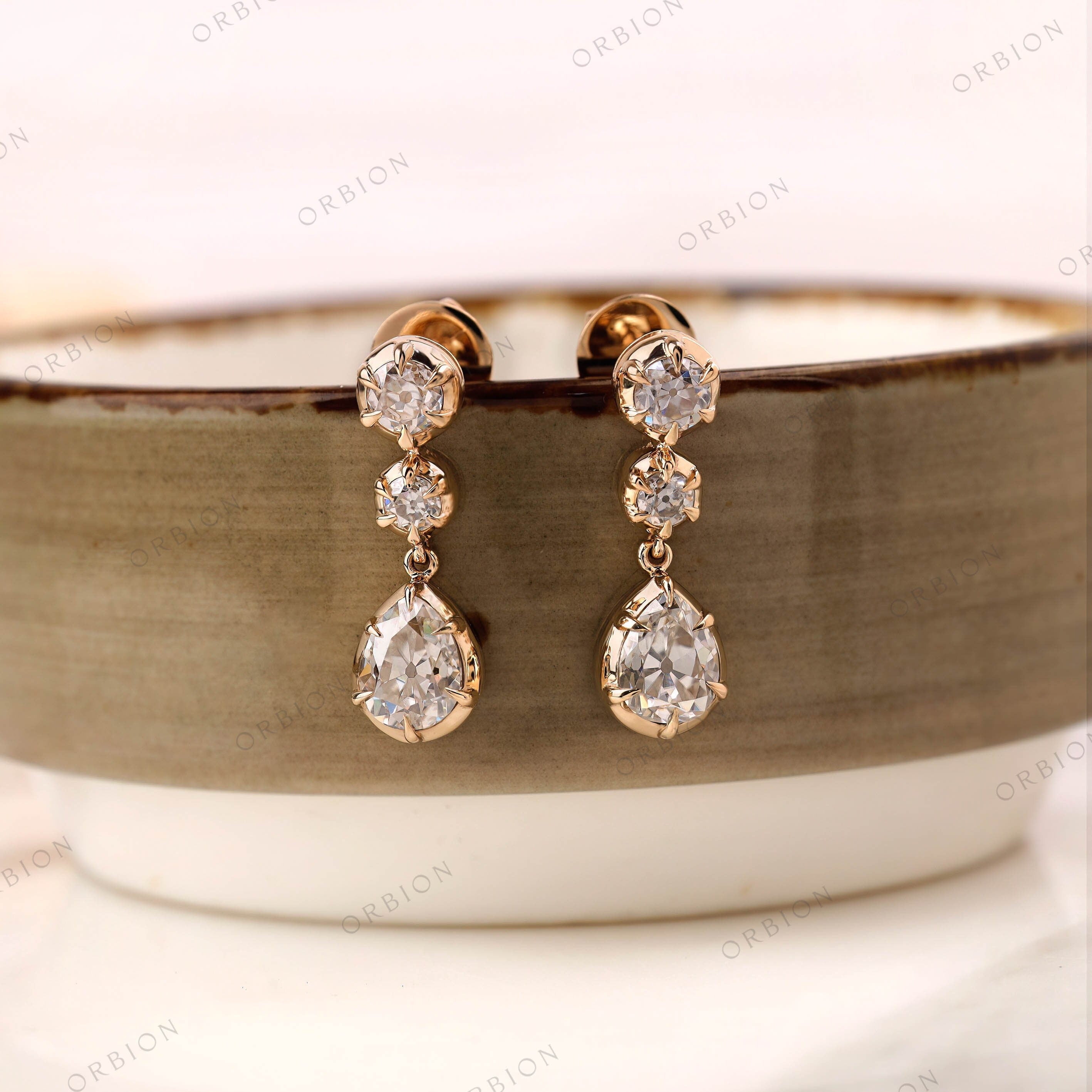Old Mine Cut Pear Shaped Dangle Earrings, 14K Solid Gold Dangle Drop Earrings, OEC Round Statement Earrings, Unique Teardrop Earrings