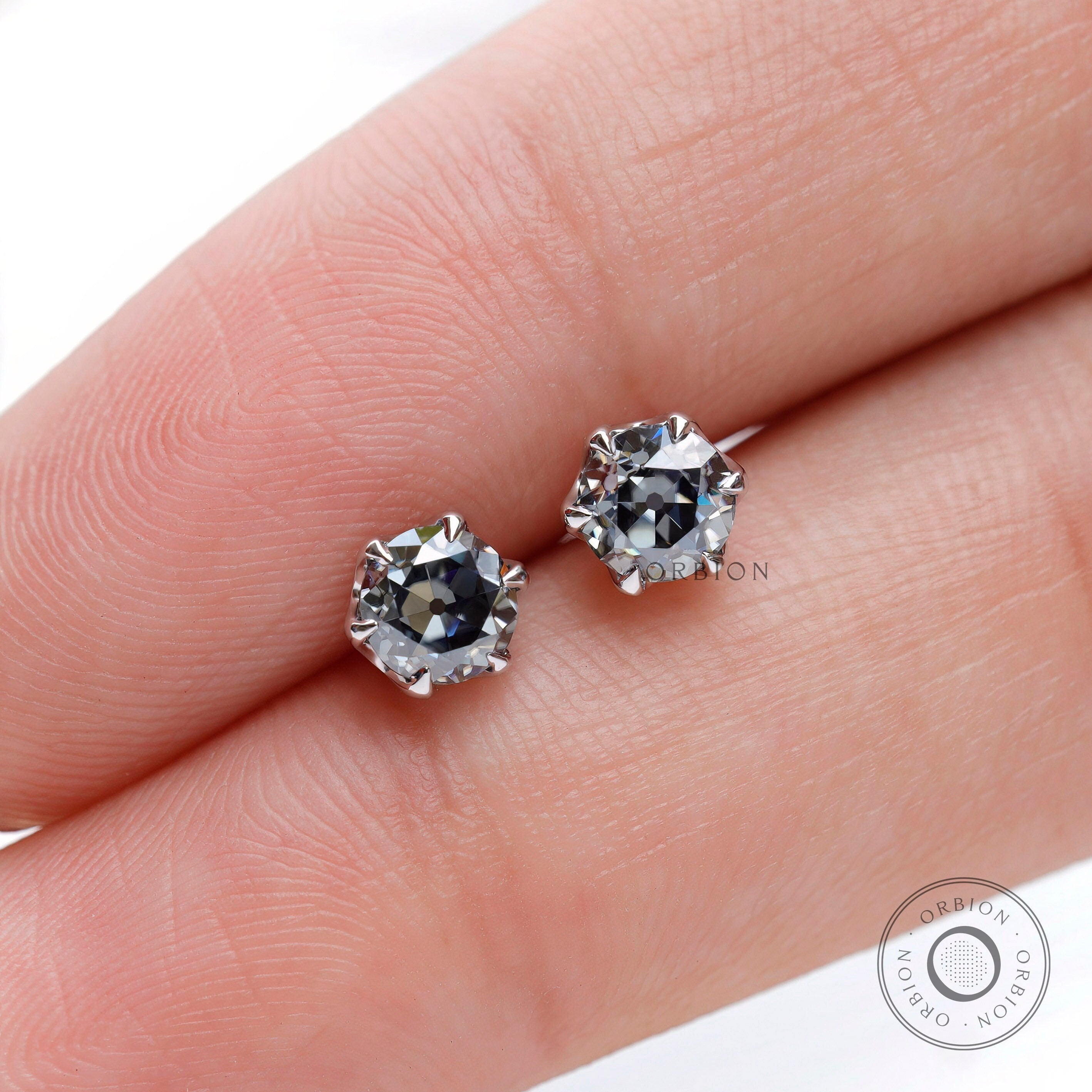 5 MM Old European Cut Grey Moissanite Stud Earrings, Unique White Gold Claw 6 Prong Studs, Delicate Minimalist Statement Earrings