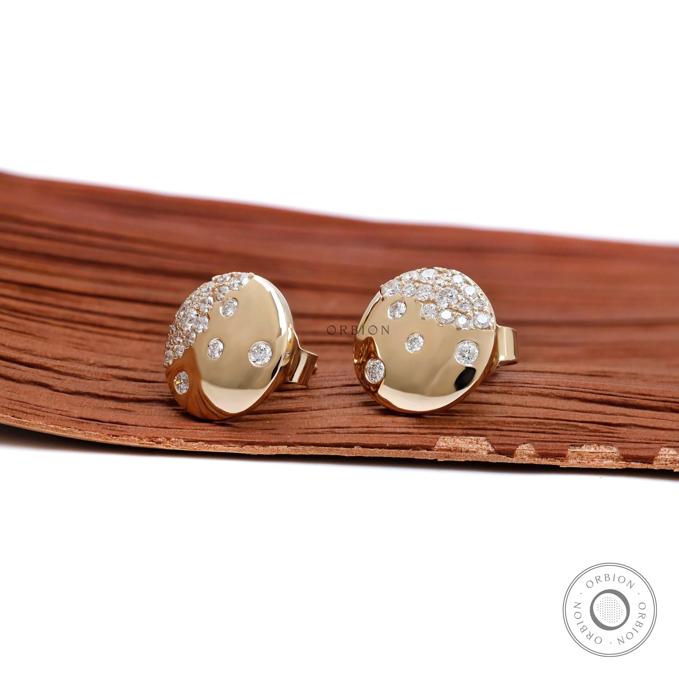 Flush Set Scattered Diamond Disc Stud Earrings, Unique Lab Grown Pushback Confetti Diamond Earrings, Solid Yellow Gold Snowfall Earrings