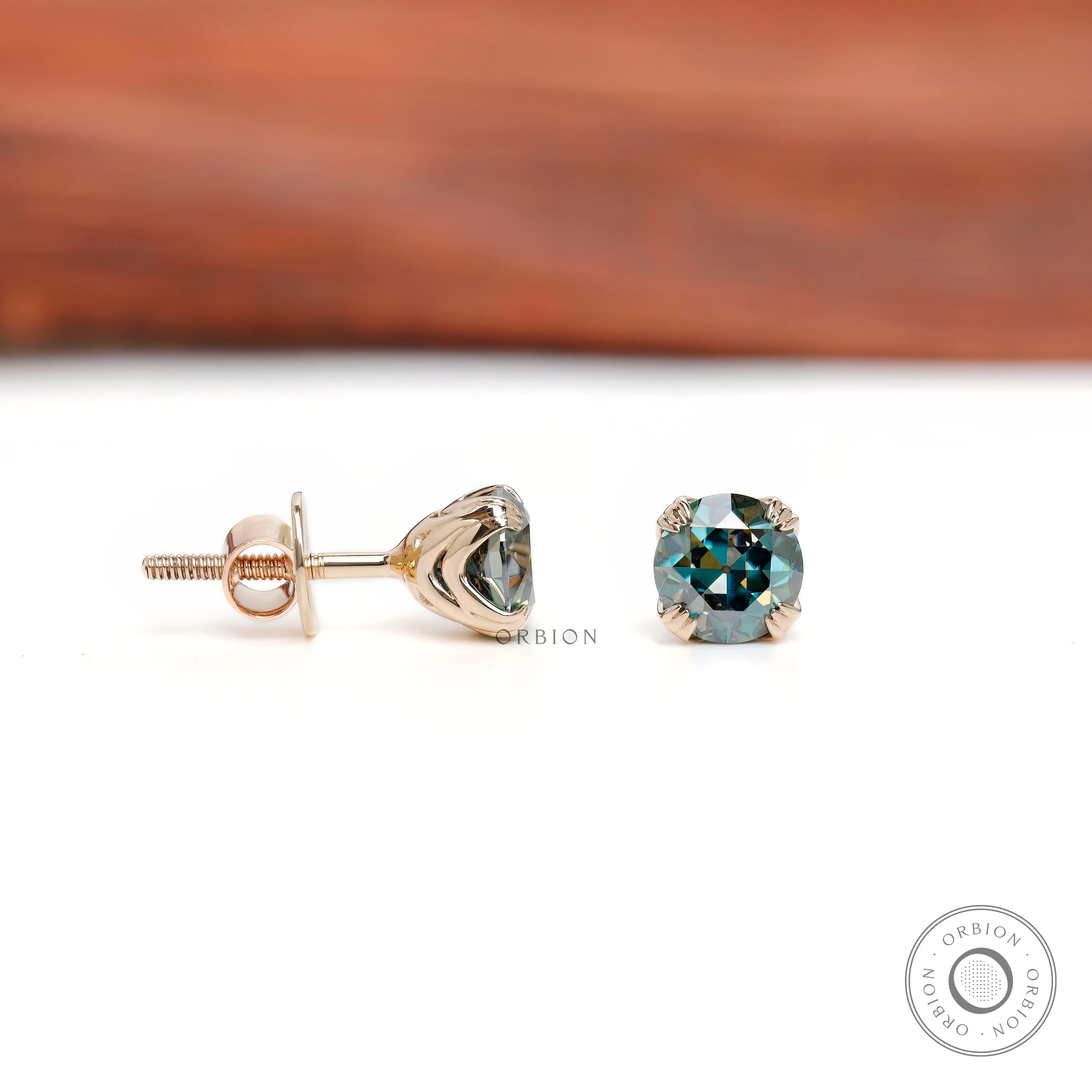 6 MM Old European Cut Blue-Green Moissanite Studs, Triple Claw Prong Studs, Tiny Vintage Style Statement Earrings, 14k Solid Yellow Gold