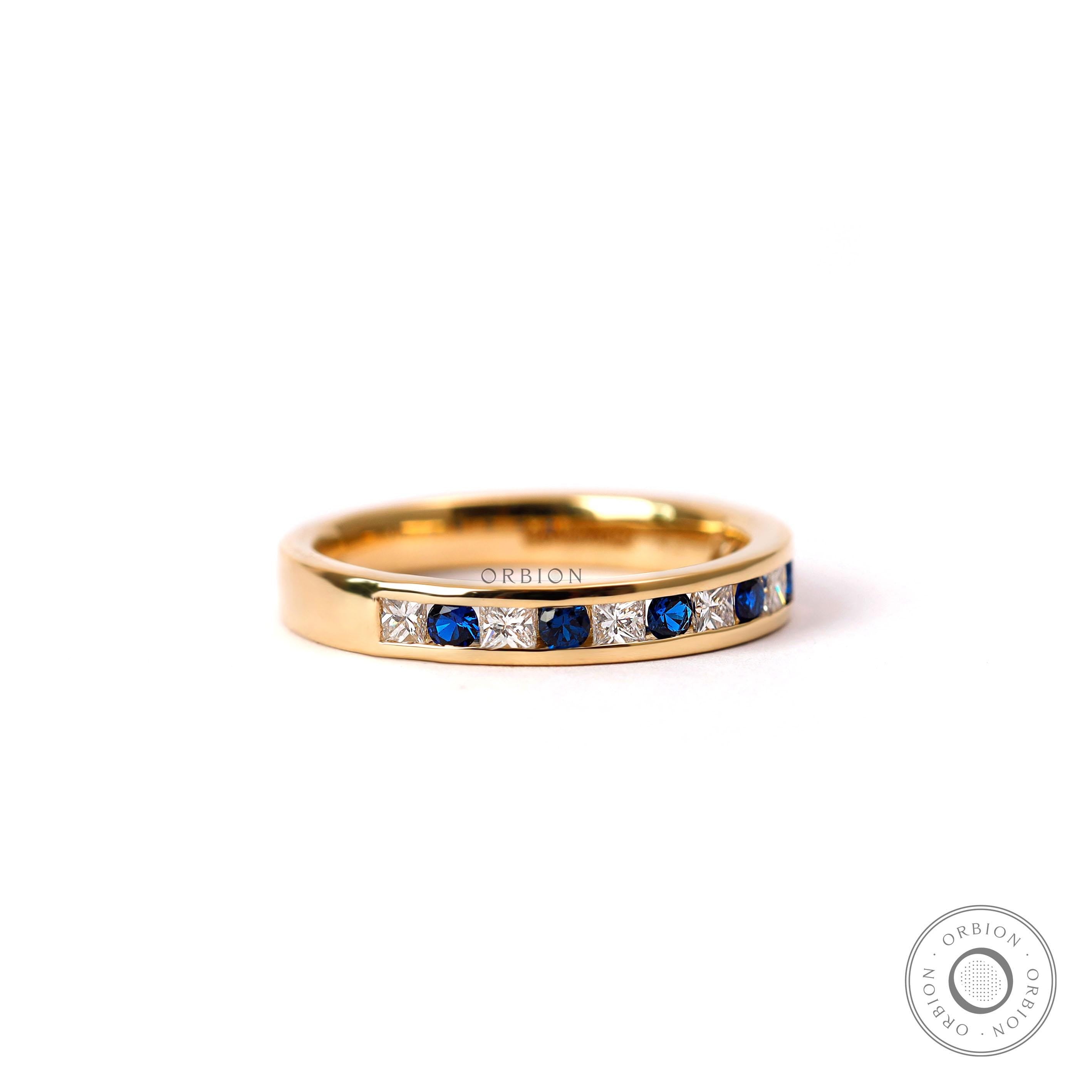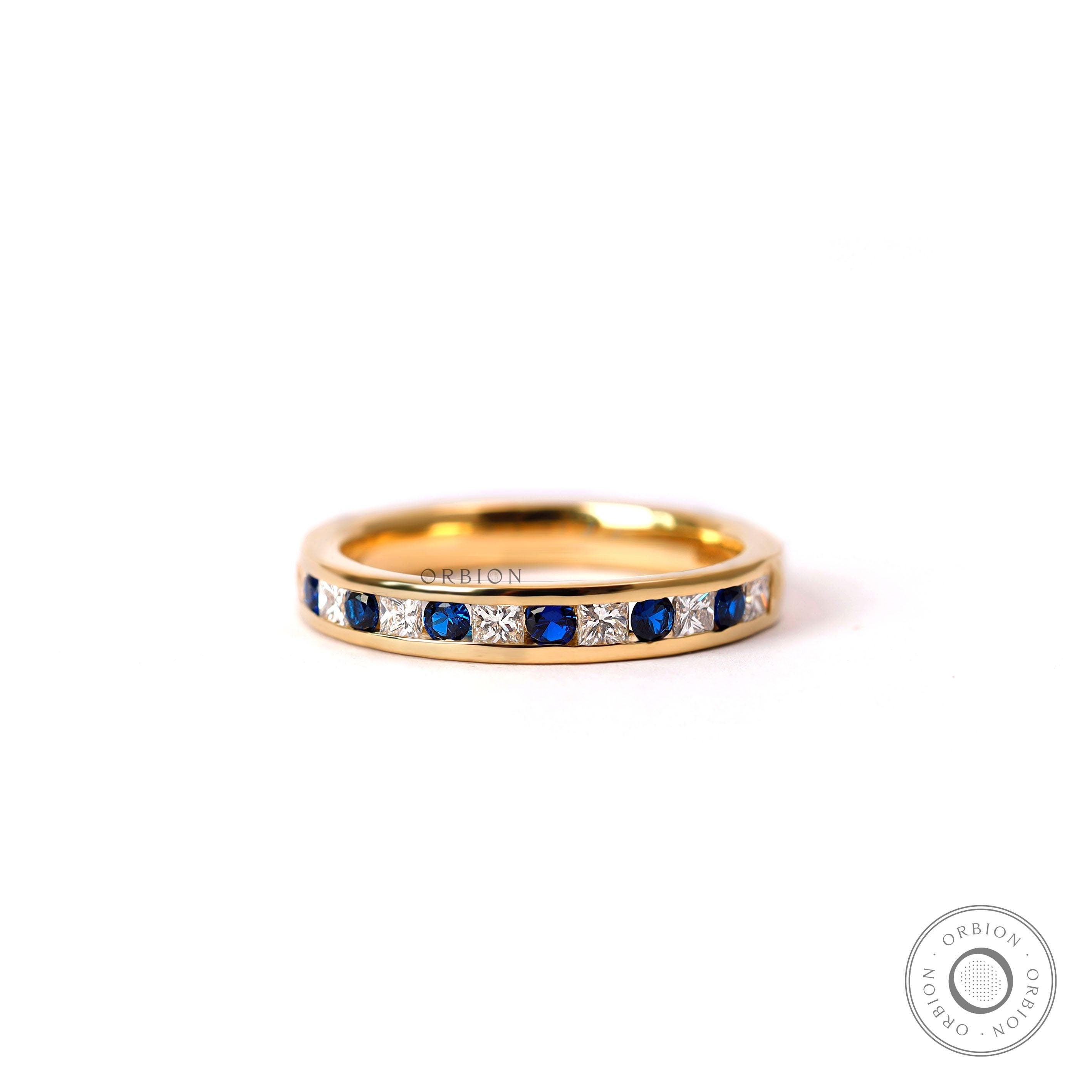 Channel Set Alternating Diamond And Sapphire Wedding Band In 14K Yellow Gold, Sapphire And Diamond Eternity Ring, Women Wedding Band