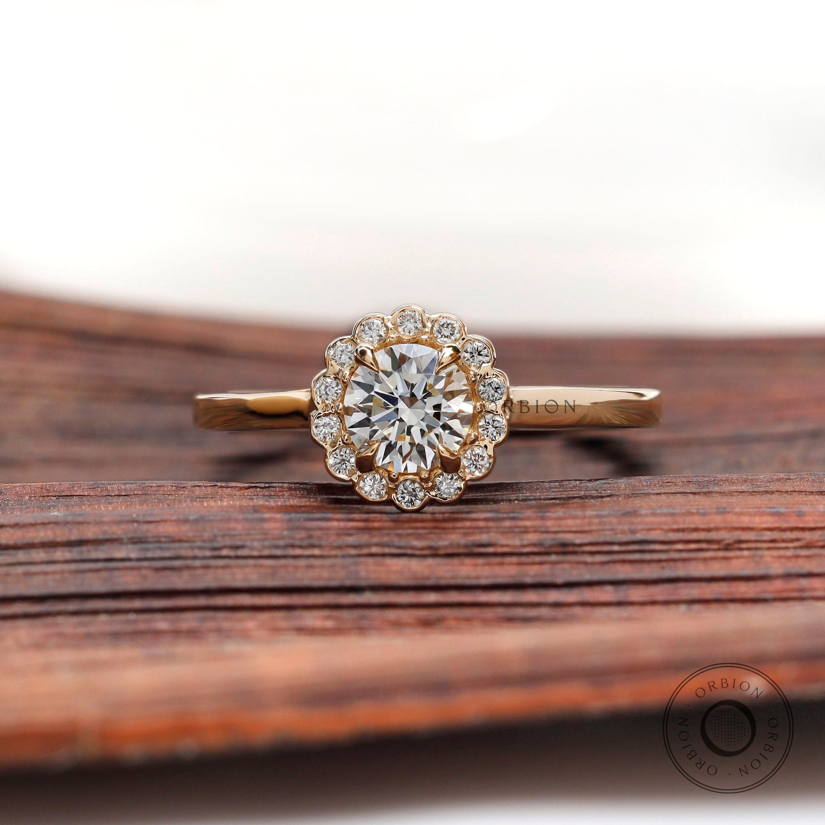 Round Lab Grown Diamond Halo Engagement Ring in 14k Yellow Gold Elegant Sunburst Diamond Ring Handcrafted Cathedral Shank Halo Blossom Ring