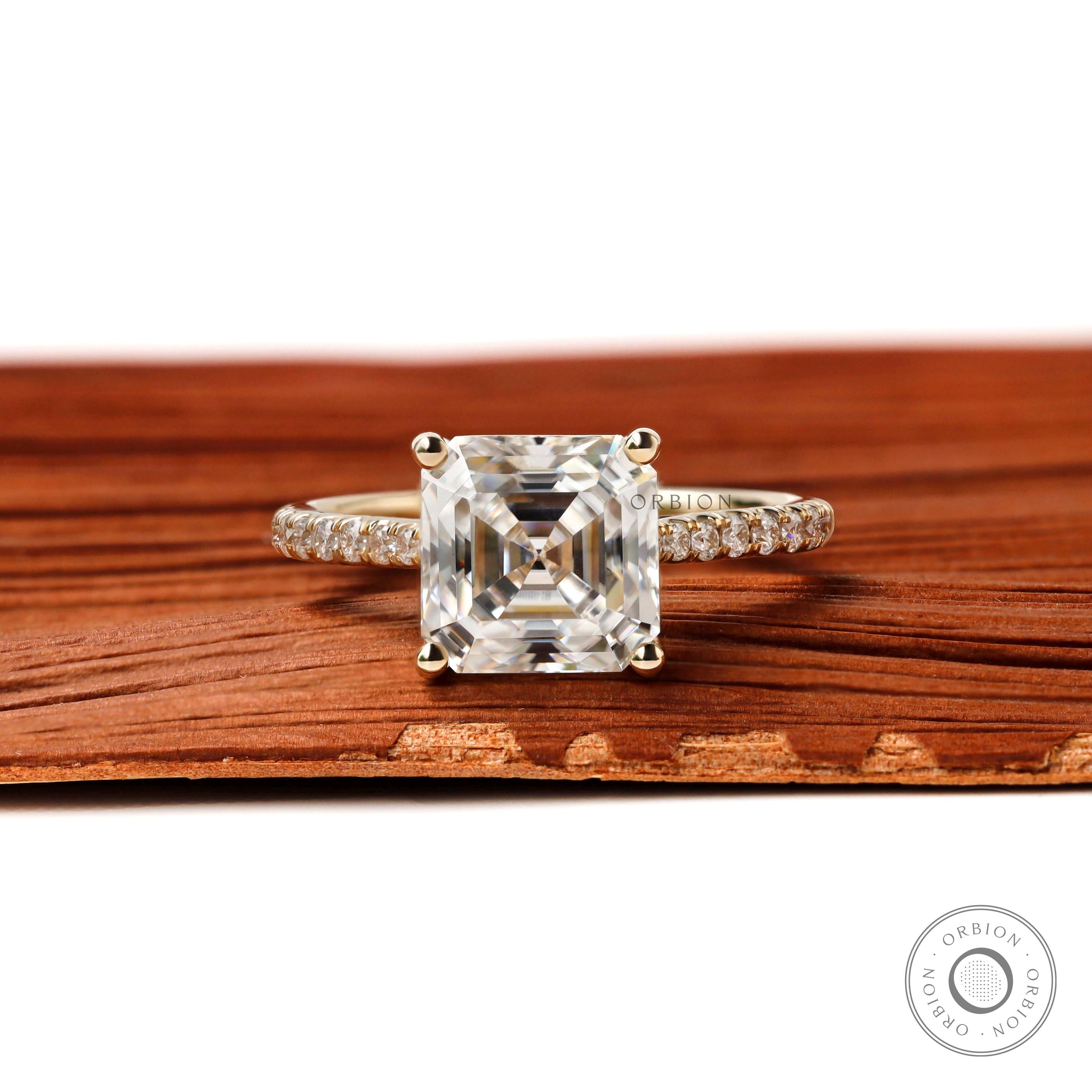 Asscher Cut Hidden Halo Moissanite Engagement Ring Solitaire 14k Yellow Gold Cathedral Step Cut Promise Wedding Anniversary Ring For Women