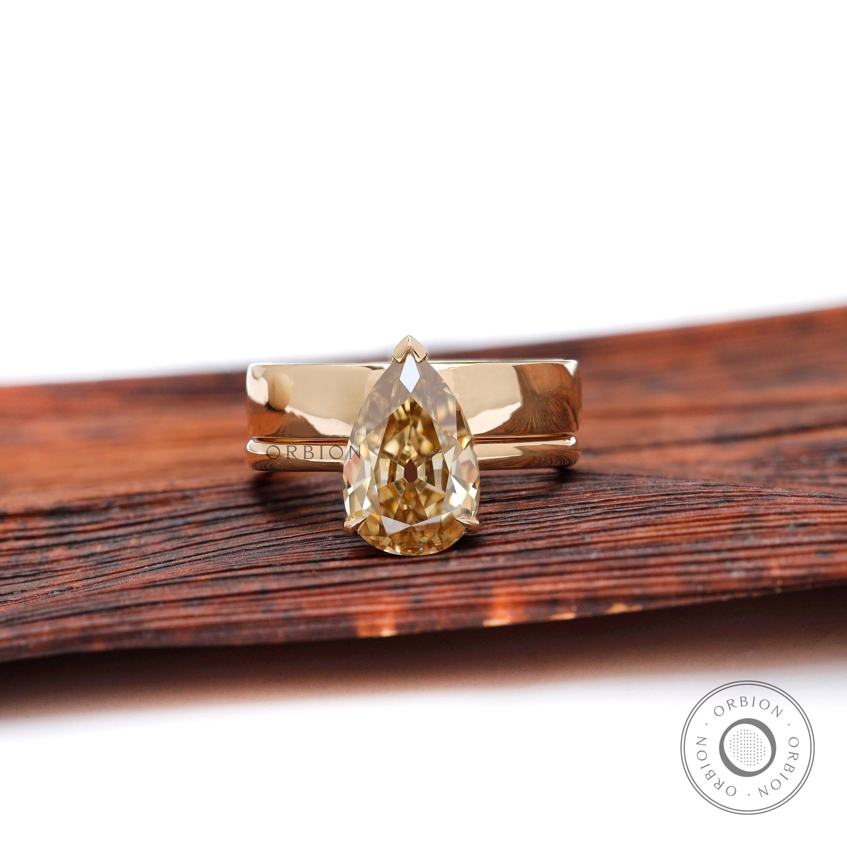 Pear Champagne Moissanite Thick Band Engagement Ring Set Hidden Halo Wedding Set Matching Plain Gold Wide Band 14k Yellow Gold Rings