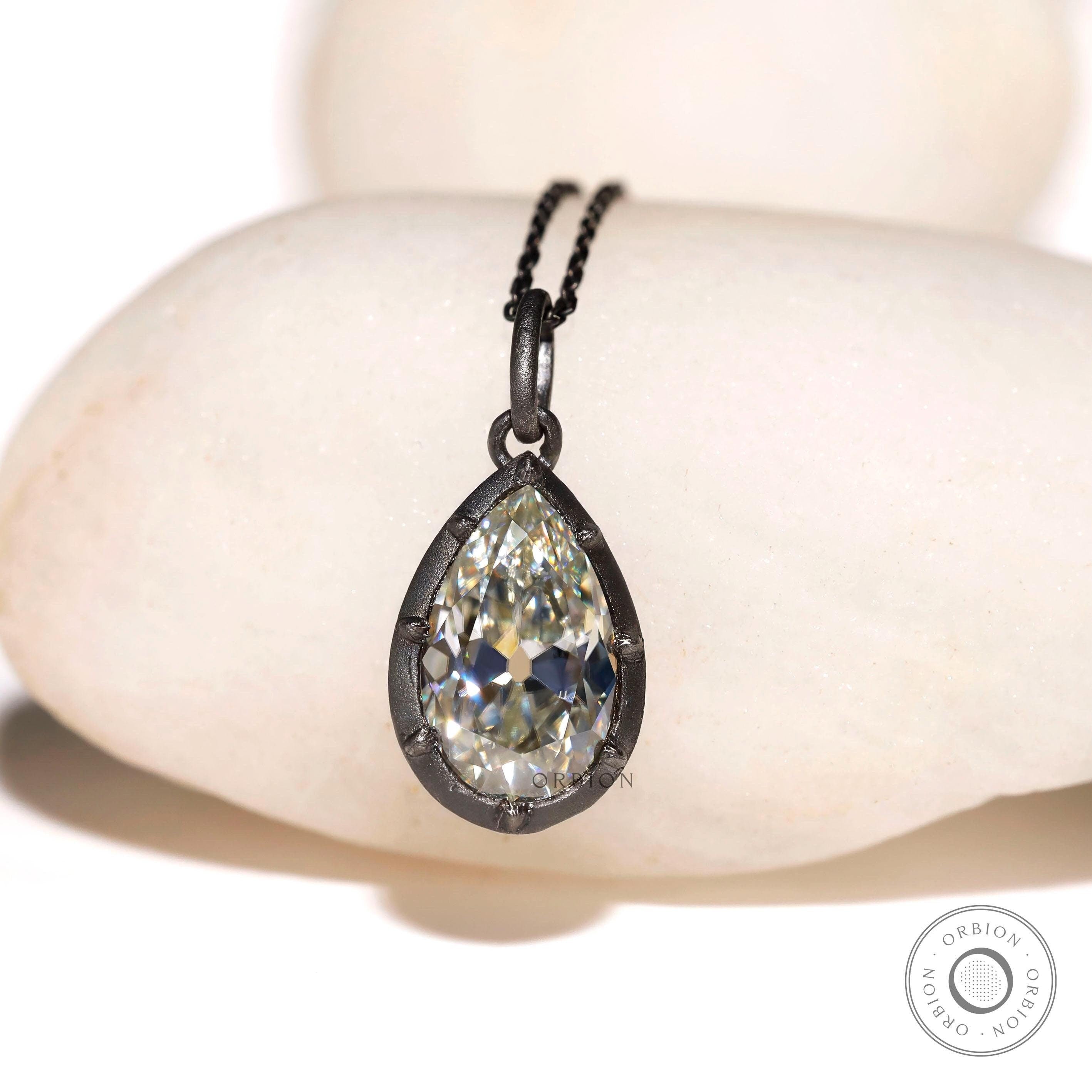 Old Mine Cut Pear Georgian Style Moissanite Pendant, Oxidised Sterling Silver Fine Matte Finish, Vintage Gold Pendant, Closed Bezel Pendant