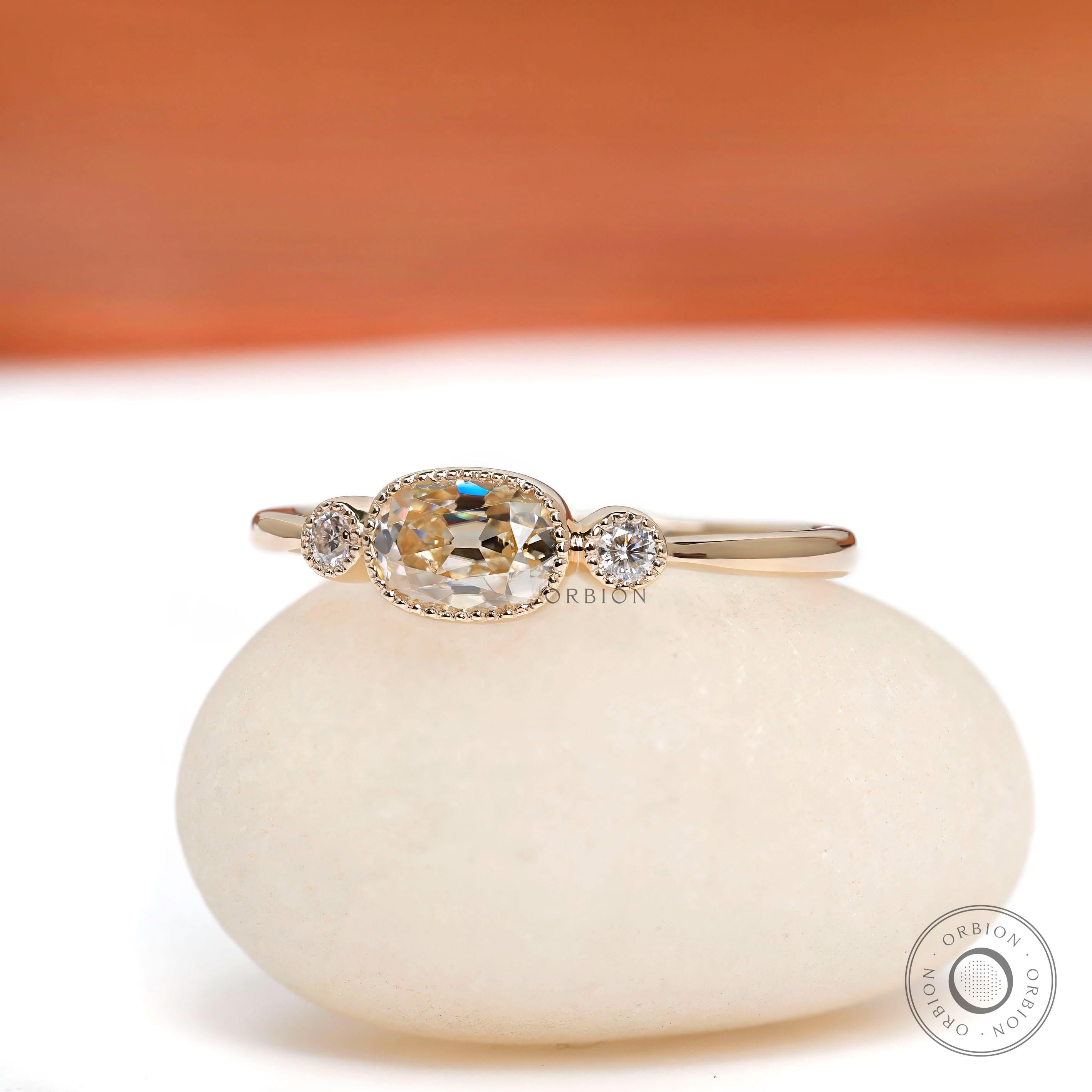 Three Stone Lab Grown Diamond Trilogy Engagement Ring OEC Moissanite Side Stones 14k Yellow Gold Georgian Style Antique Ring Women