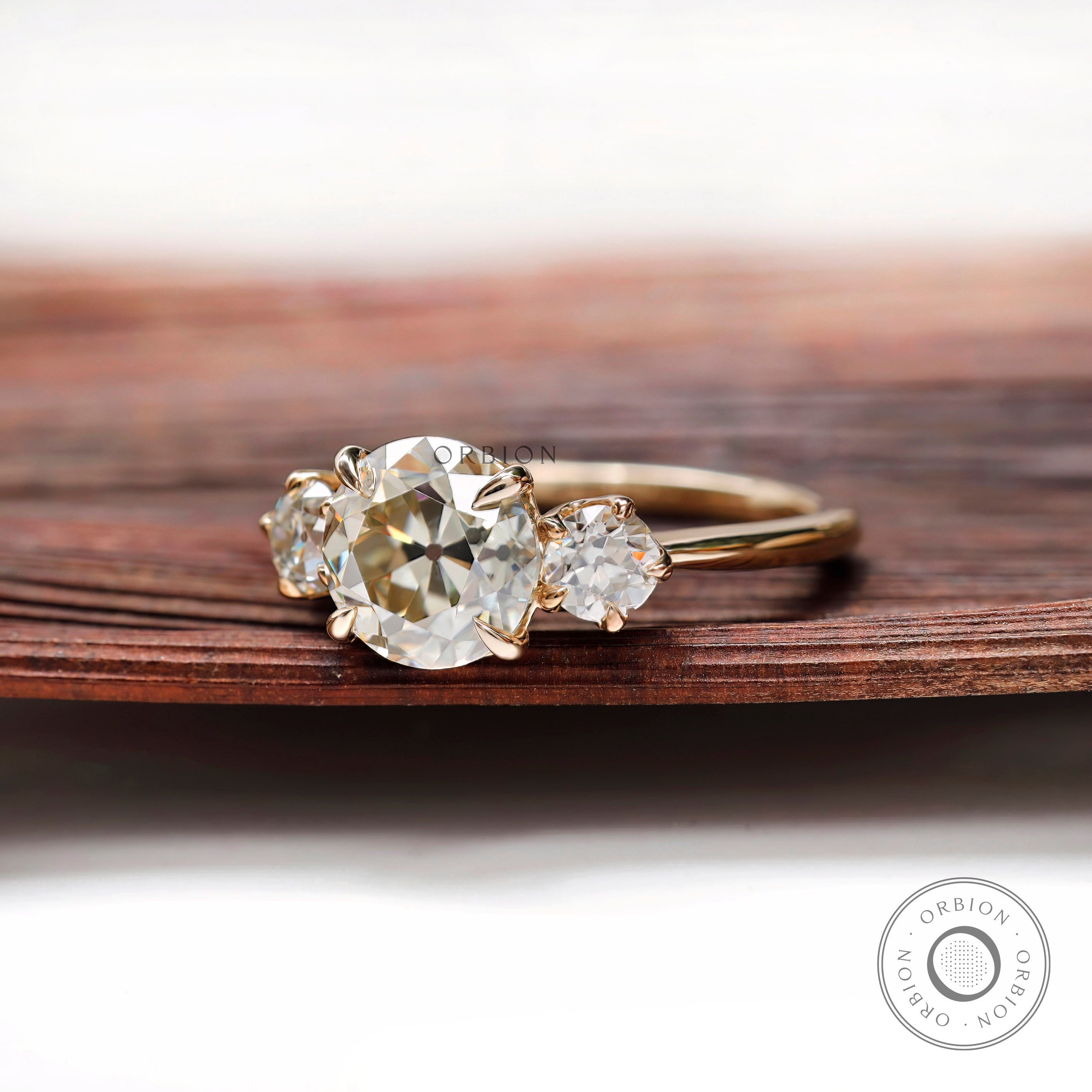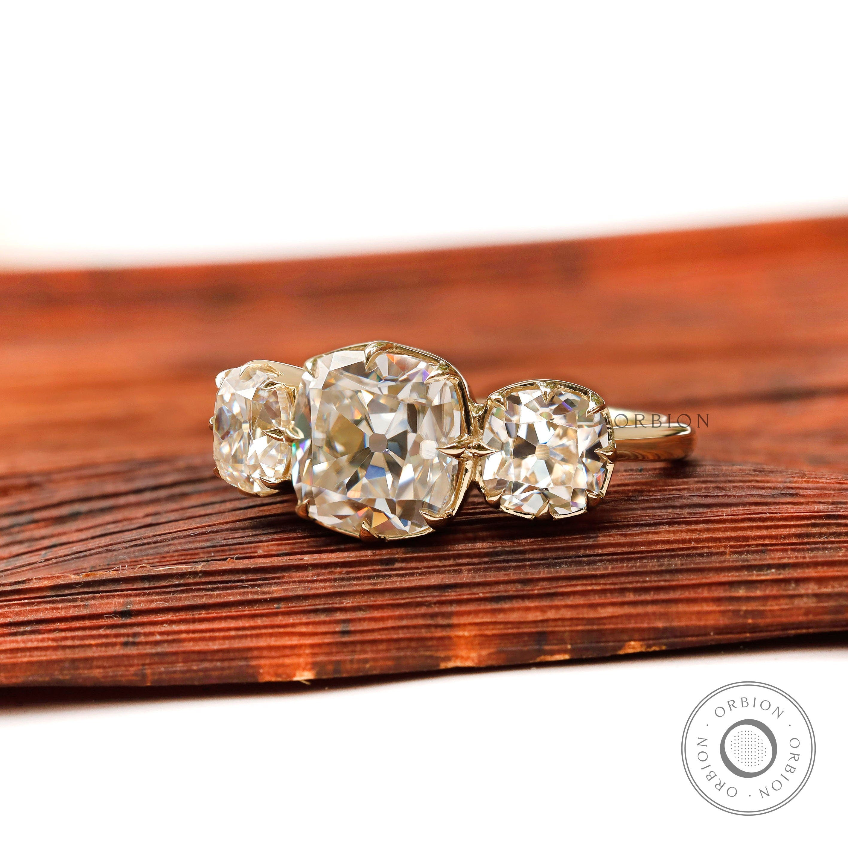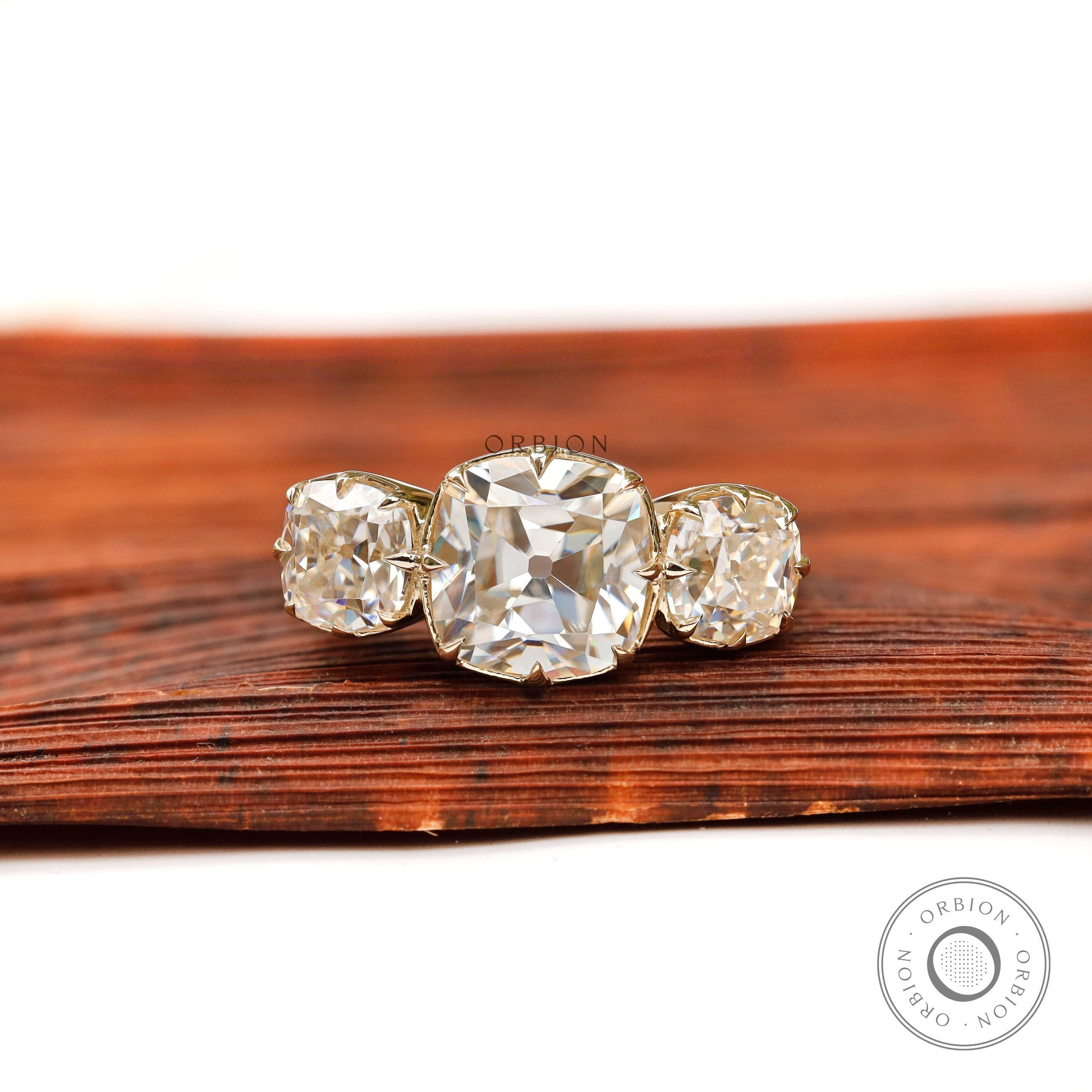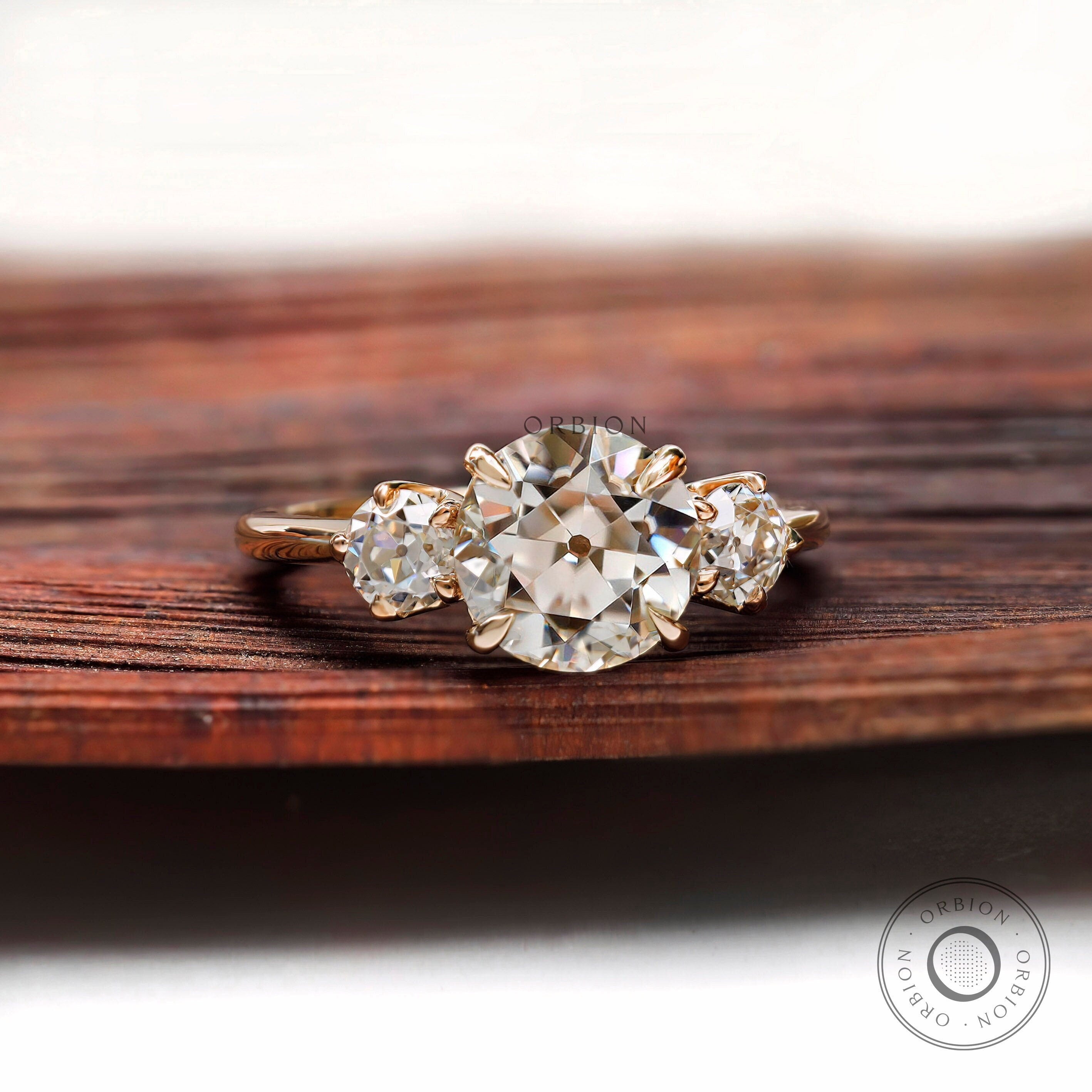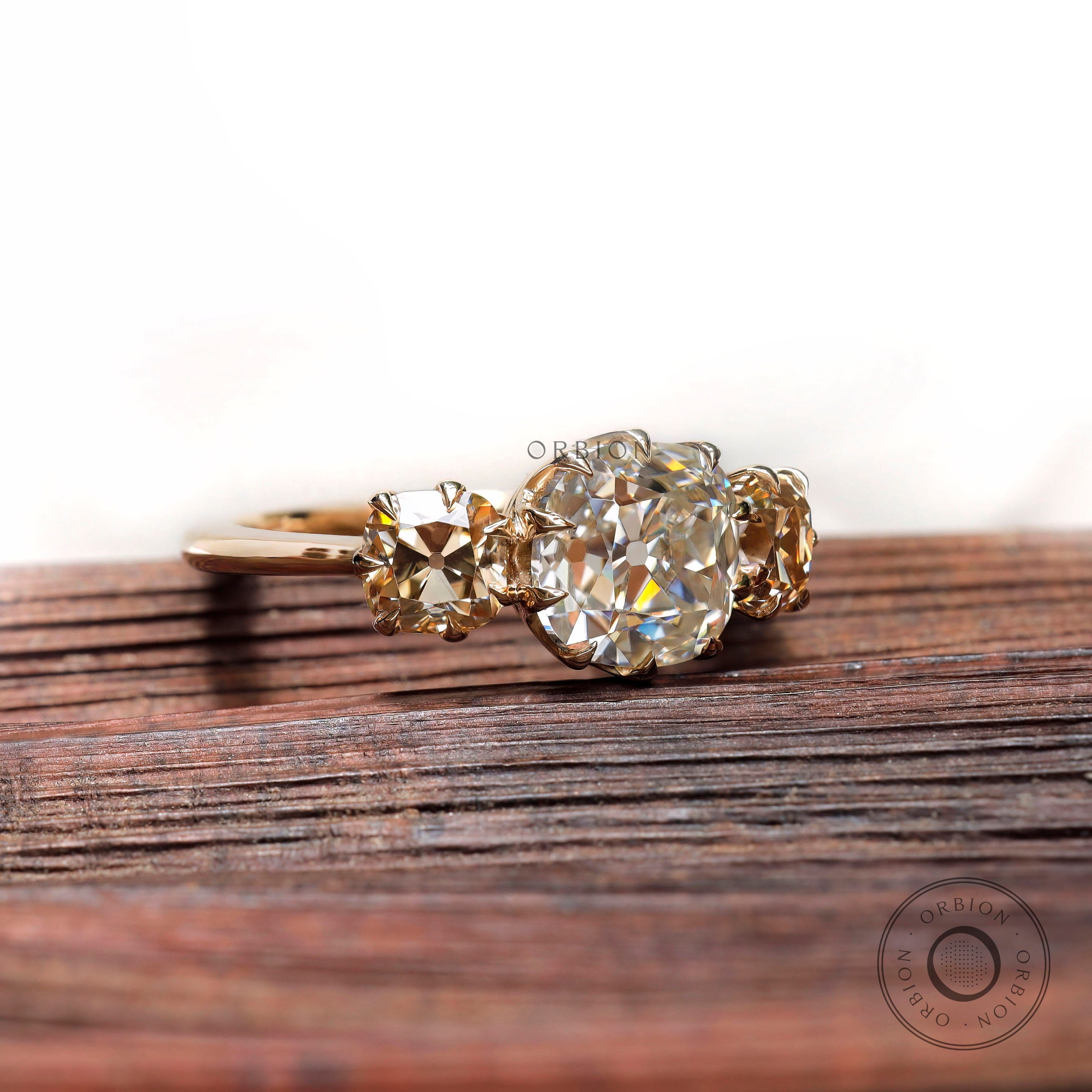 Three Stone Champagne Moissanite Vintage Engagement Ring OEC Georgian Three Stone Ring Antique Old Cut 3 Stone Ring 14k Yellow Gold
