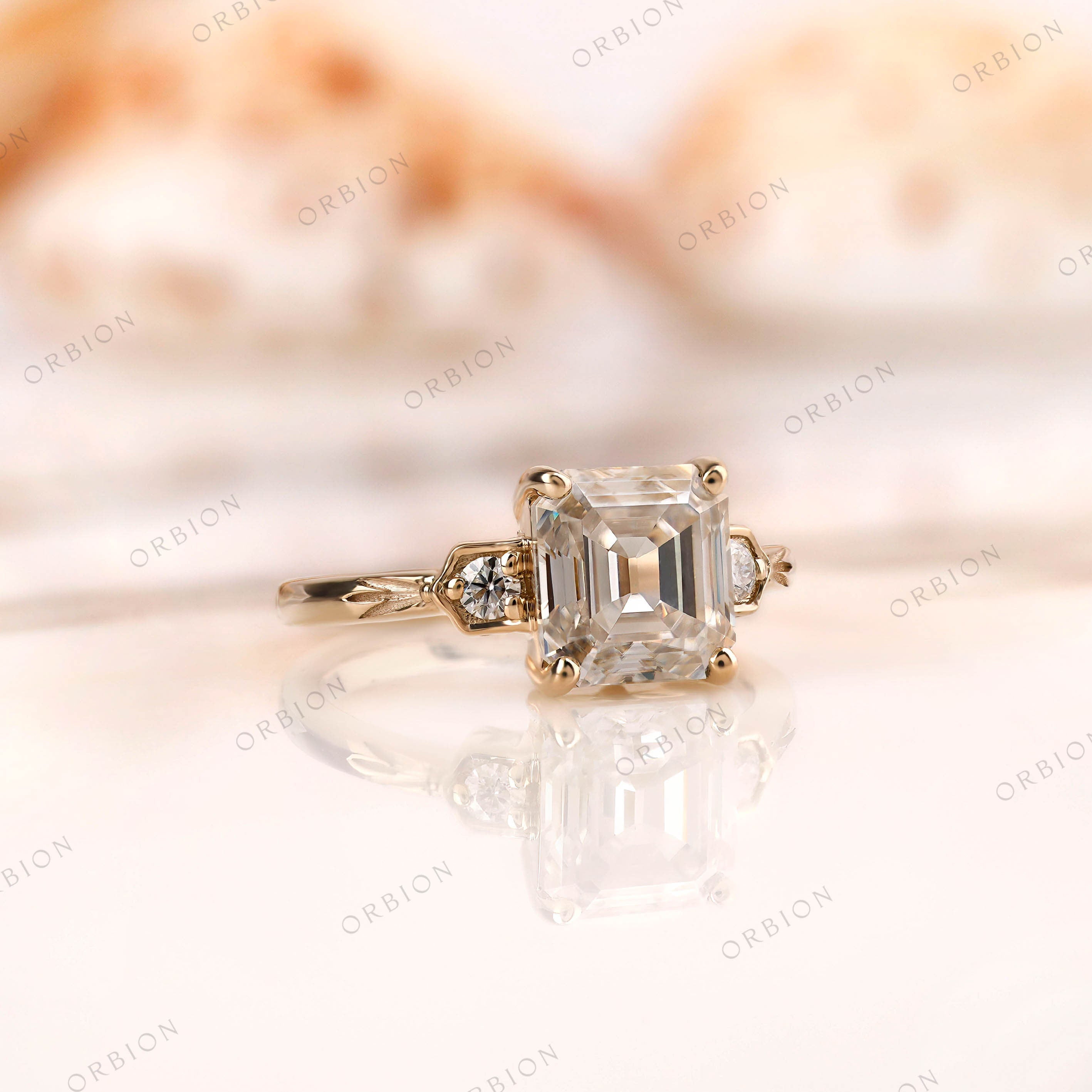 Asscher Three Stone Ring, Sun Motif Vintage Style Moissanite Engagement Ring, 14K Gold Art Deco Floral Motif Engraved Ring, Promise Ring