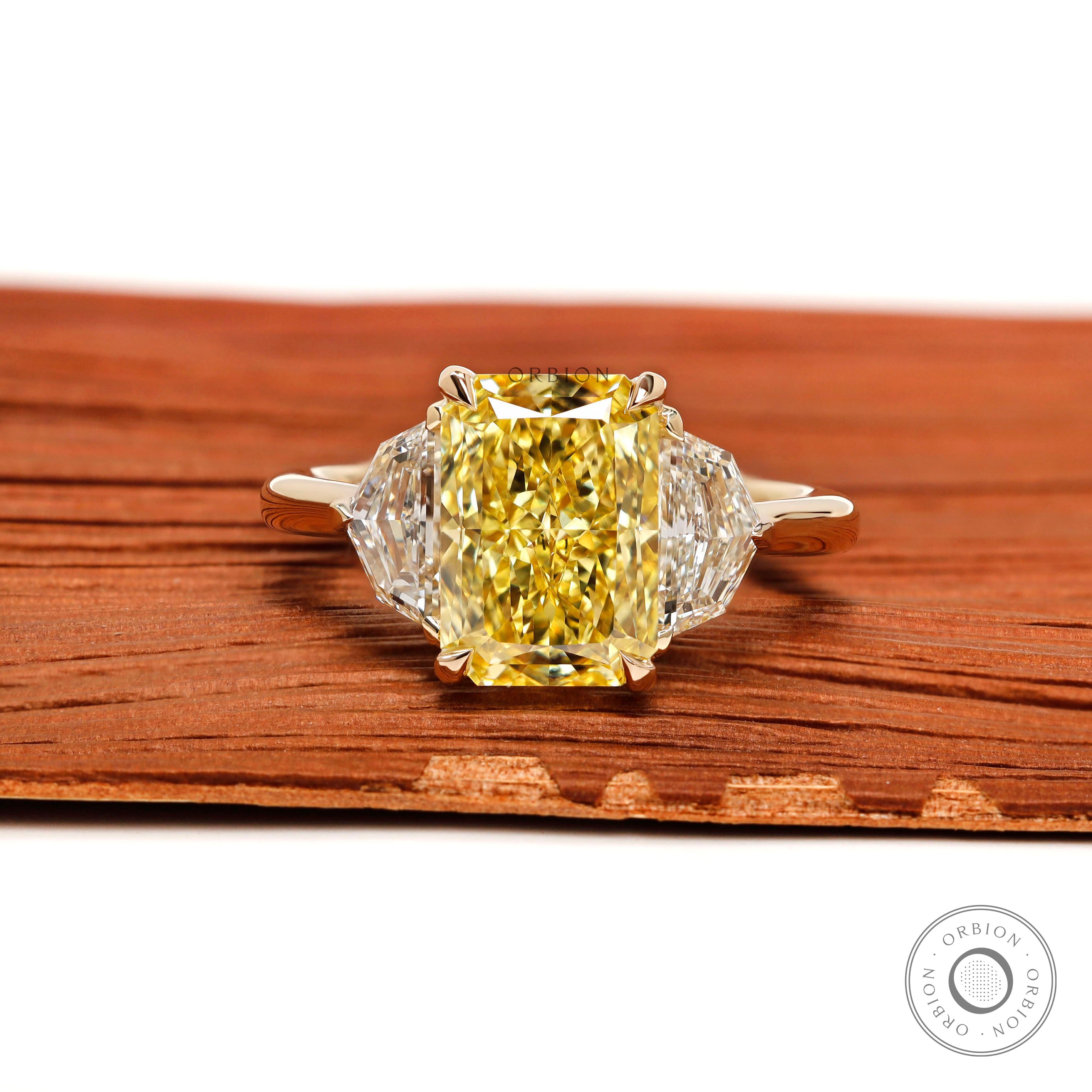 Three Stone Radiant Cut Yellow Lab Diamond Wedding Engagement Ring With Epaulette And Pear Side Stones 14k Yellow Gold Cathedral Bridal Ring
