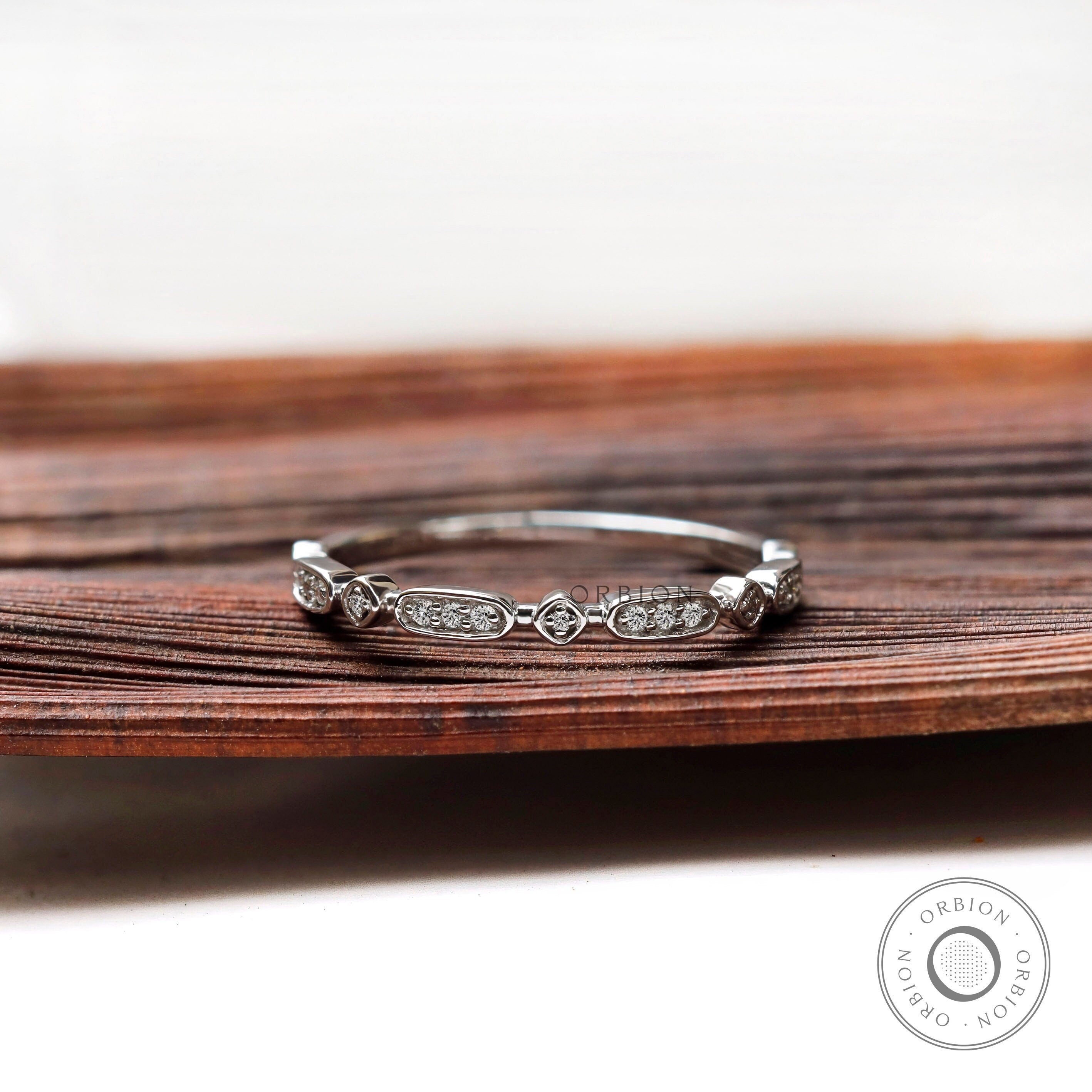 Geometric Moissanite Wedding Band, 14K White Gold Antique Wedding Band, Thin Stacking Band, Dainty Diamond Band, Minimalist Band Ring