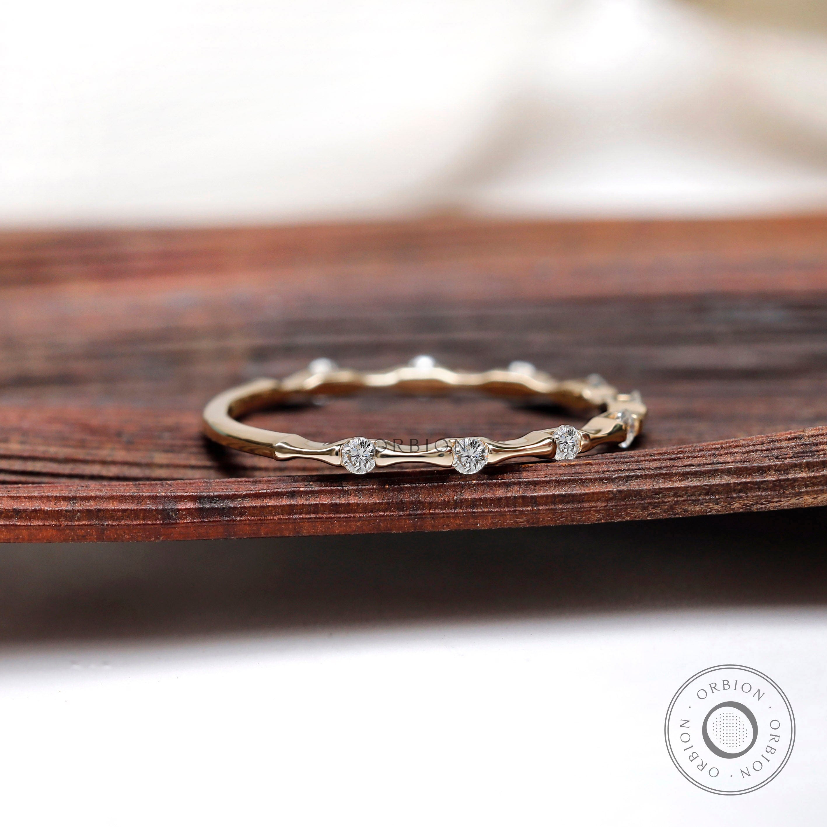 Modern Style Minimalist Bamboo Ring, 14K Solid Gold Stacking Moissanite Wedding Band Women, Dainty Thin Gold Nature Inspired ring