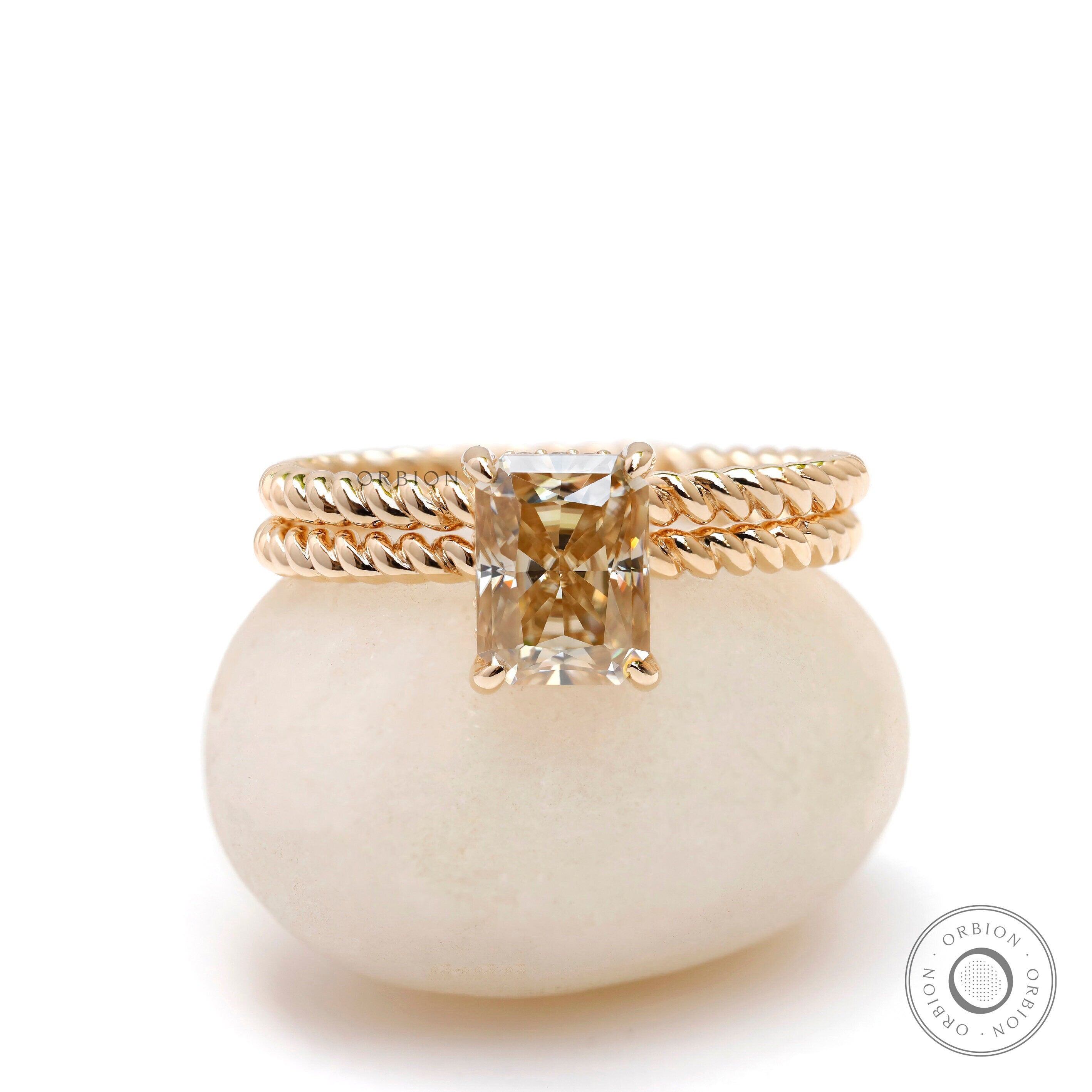 Fall in love with this captivating 1.7 carat champagne radiant cut moissanite bridal set, featuring a breathtaking engagement ring and a beautifully twisted matching band. Crafted in solid 14K gold, this romantic two-piece set combines elegance, modern style, and timeless sparkle perfect for celebrating your forever.