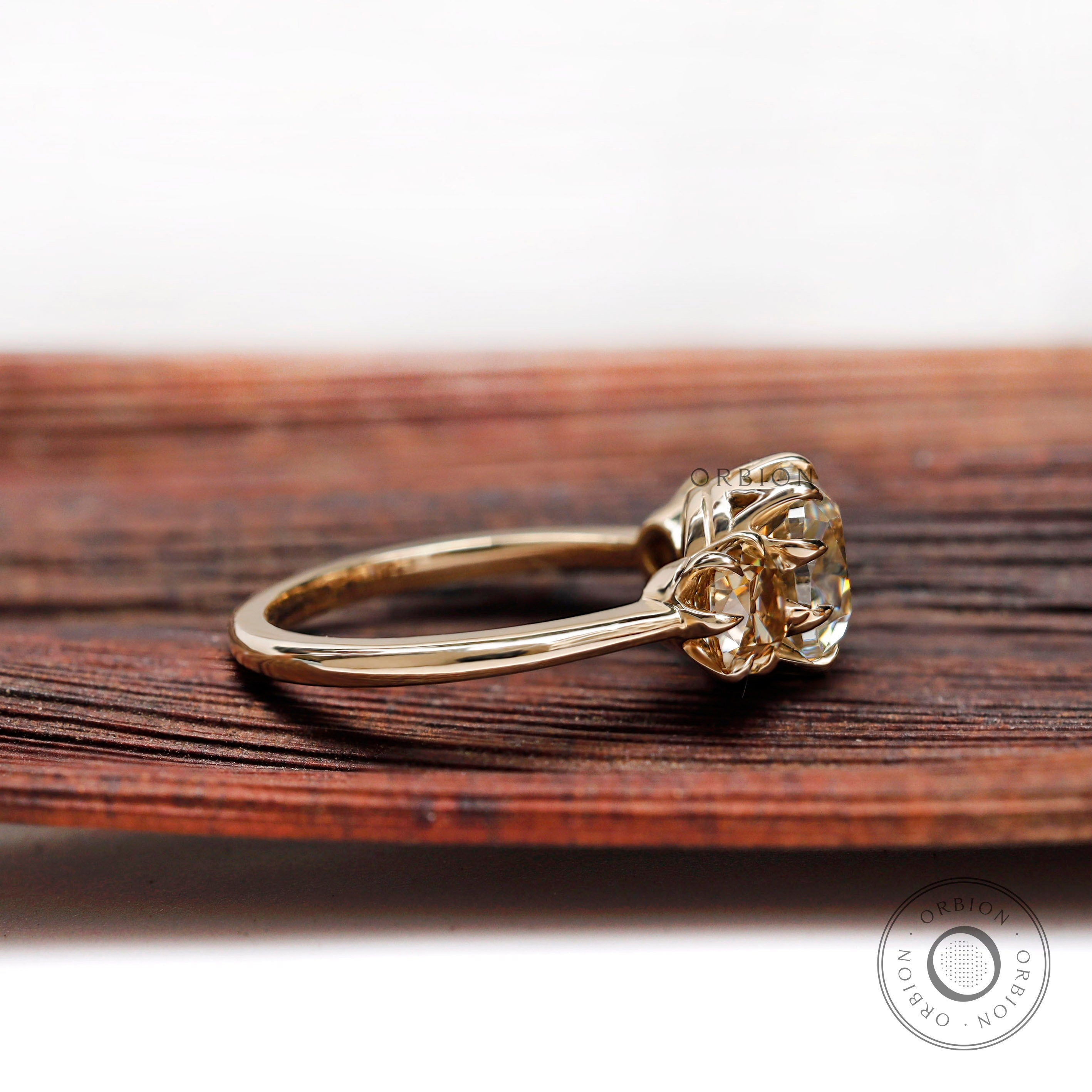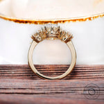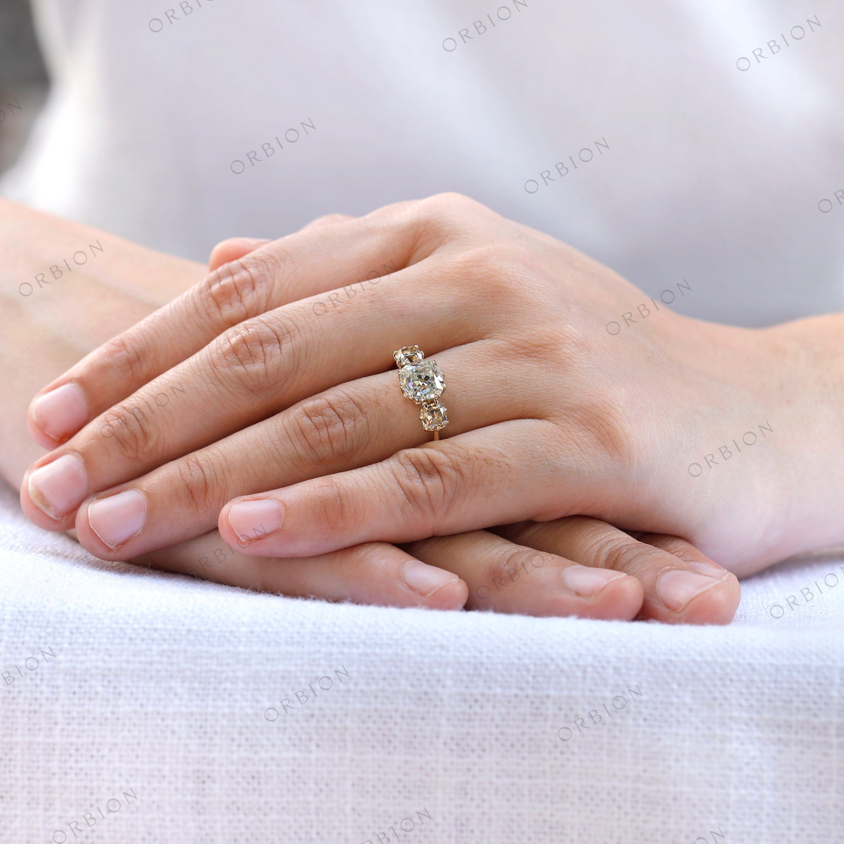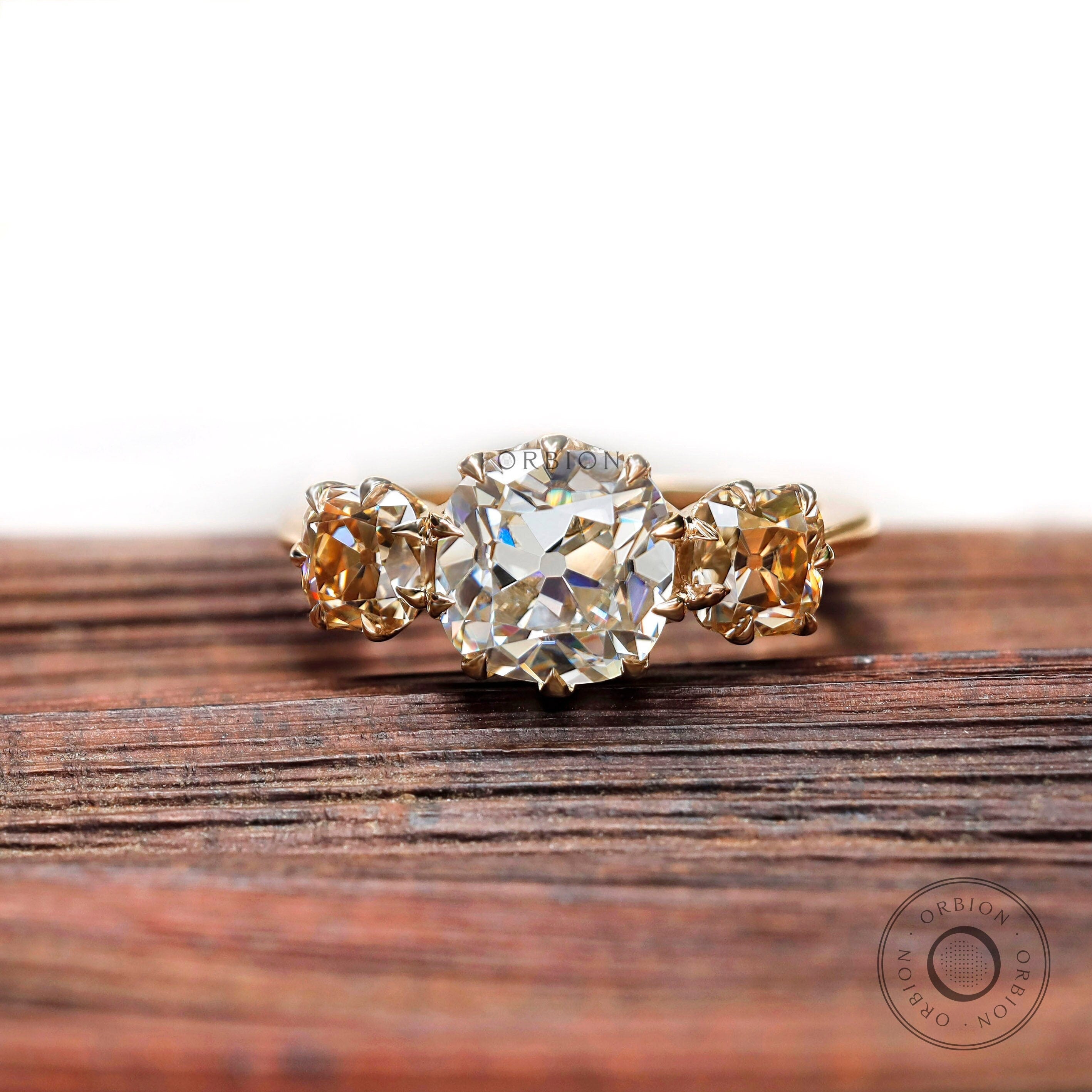 Discover the stunning 3 Stone Vintage Style Ring, featuring a 2.5 carat white Old Mine Cut Cushion diamond set in the center with 10 claw prongs and two Champagne Old Mine Cut Cushion diamonds on either side. The unique design, includes the thick bridge carved craved from the middle upon which the prongs rest upon, making it a timeless addition to your vintage jewelry collection.