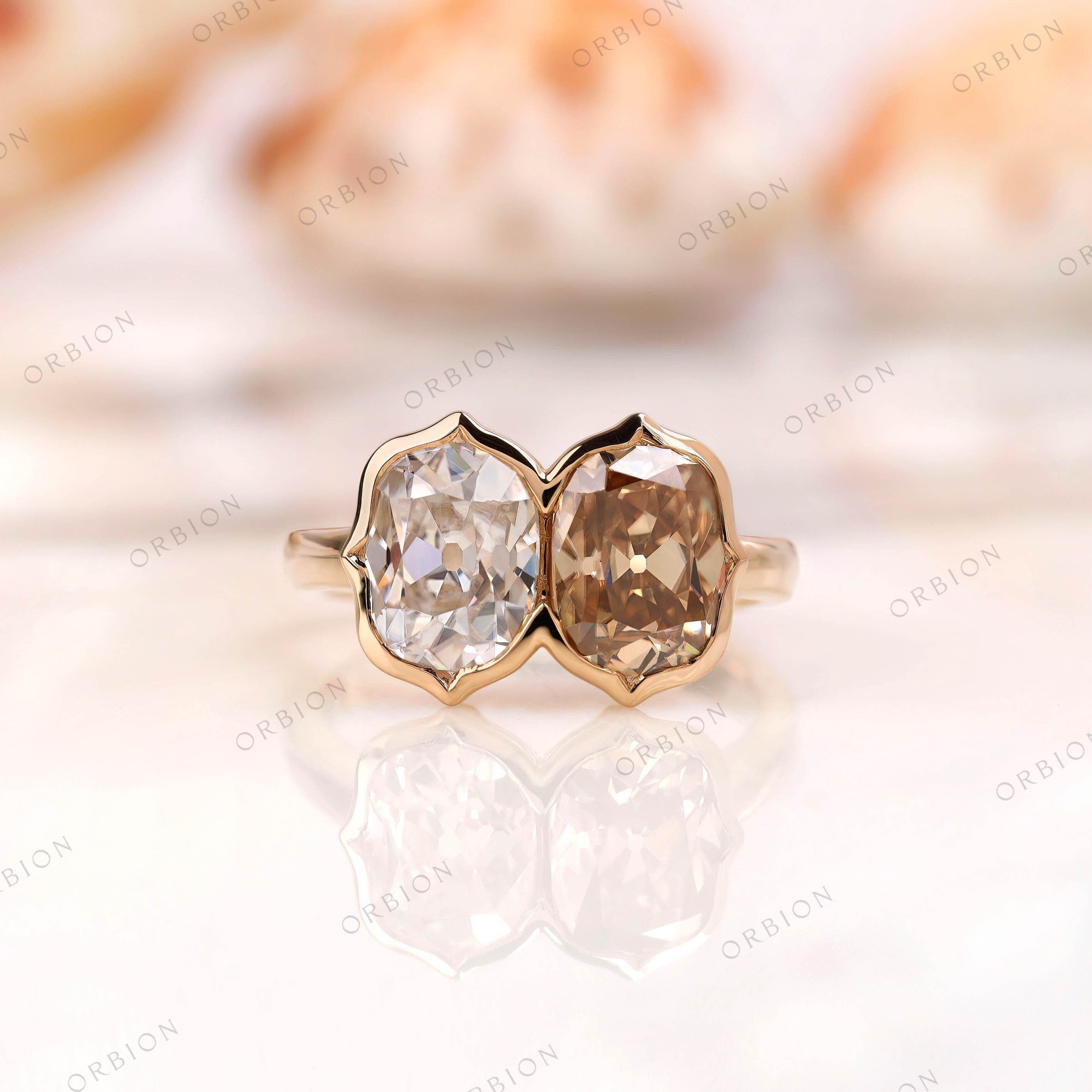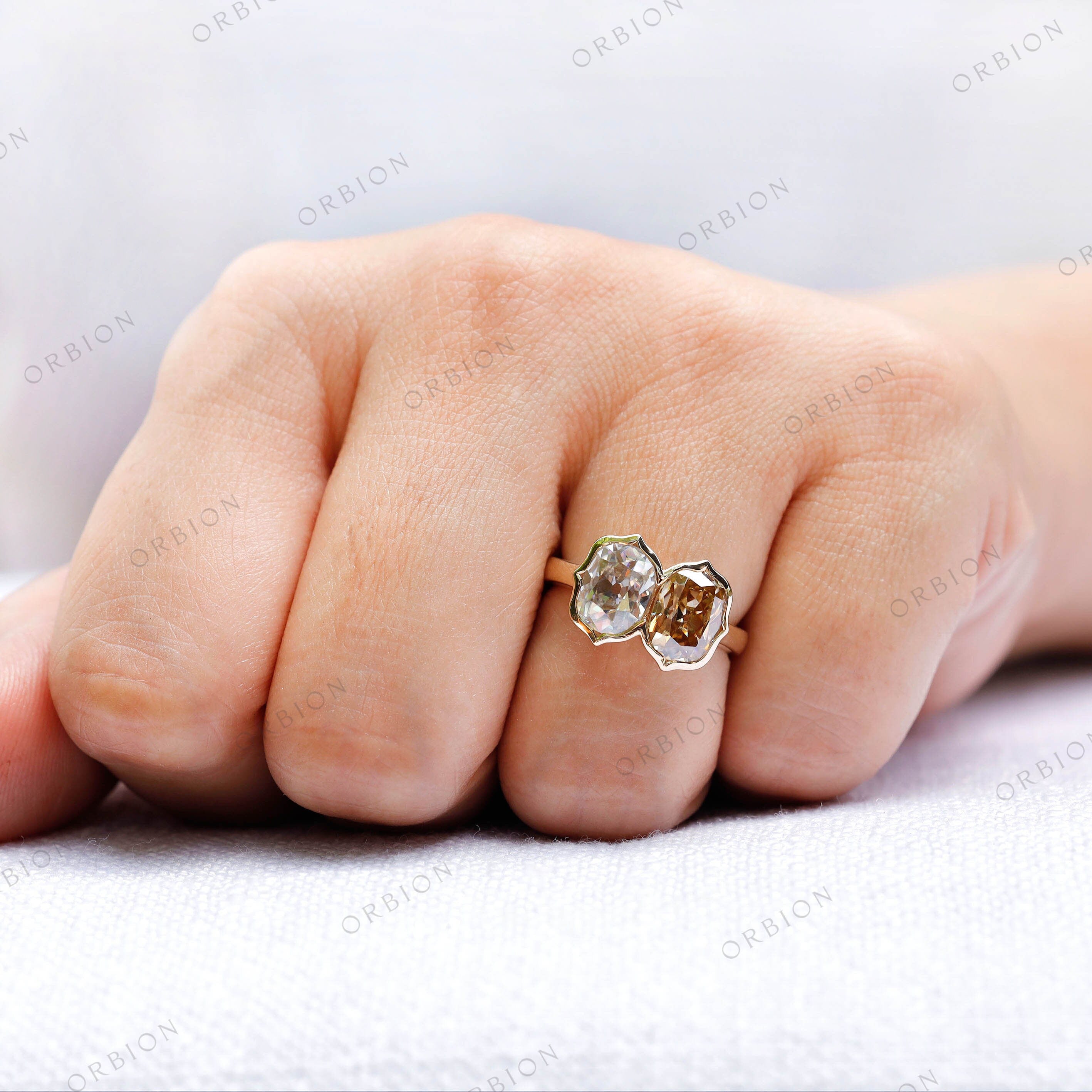 Double Stone Ring Unique, Old Mine Cut Elongated Cushion Champagne Colorless Moissanite Ring, Moi Et Toi Ring, Two Stone Engagement Ring, Antique Promise Ring, Yellow Gold Rings, Vintage Moissanite Ring, Vintage Wedding Ring, Brown Moissanite Ring, Color Moissanite Ring, You and Me Ring.