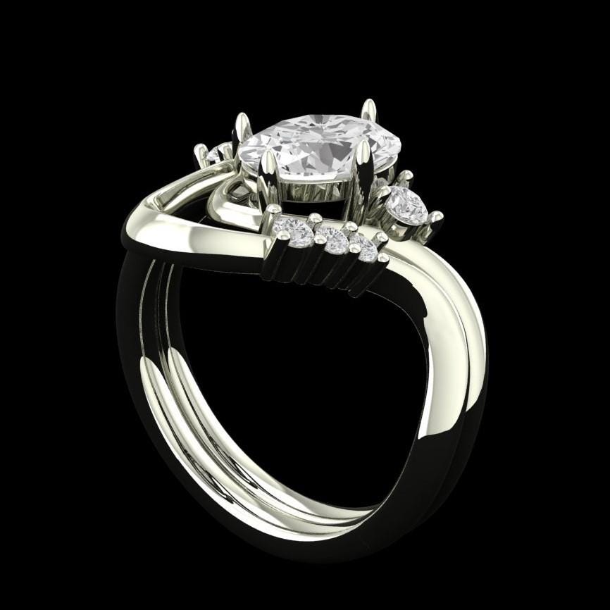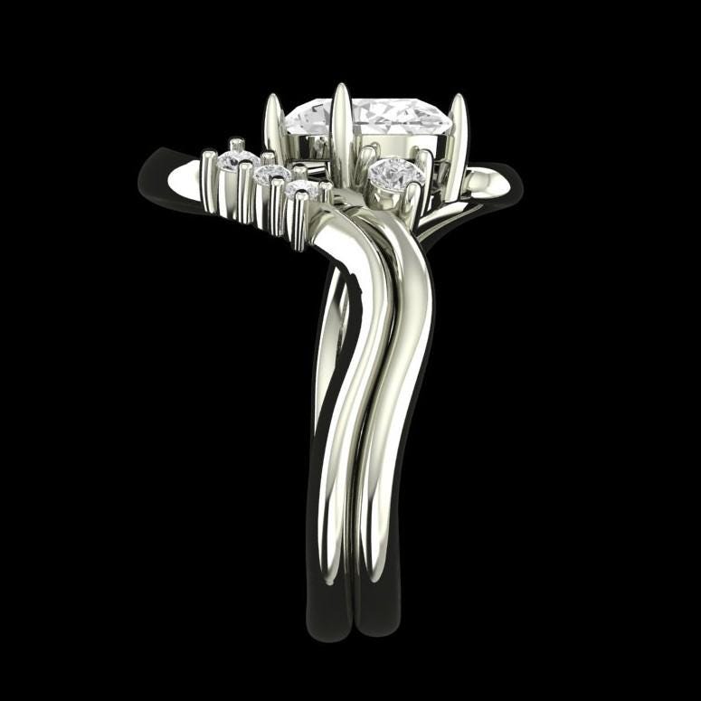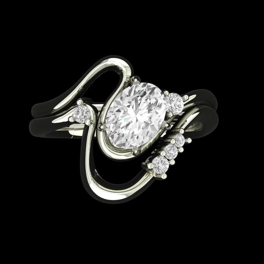 Oval Moissanite Curved Ring Set, 10K White Gold Ring with Stacking Wedding band, Wedding Ring Set, Bridal Ring Set