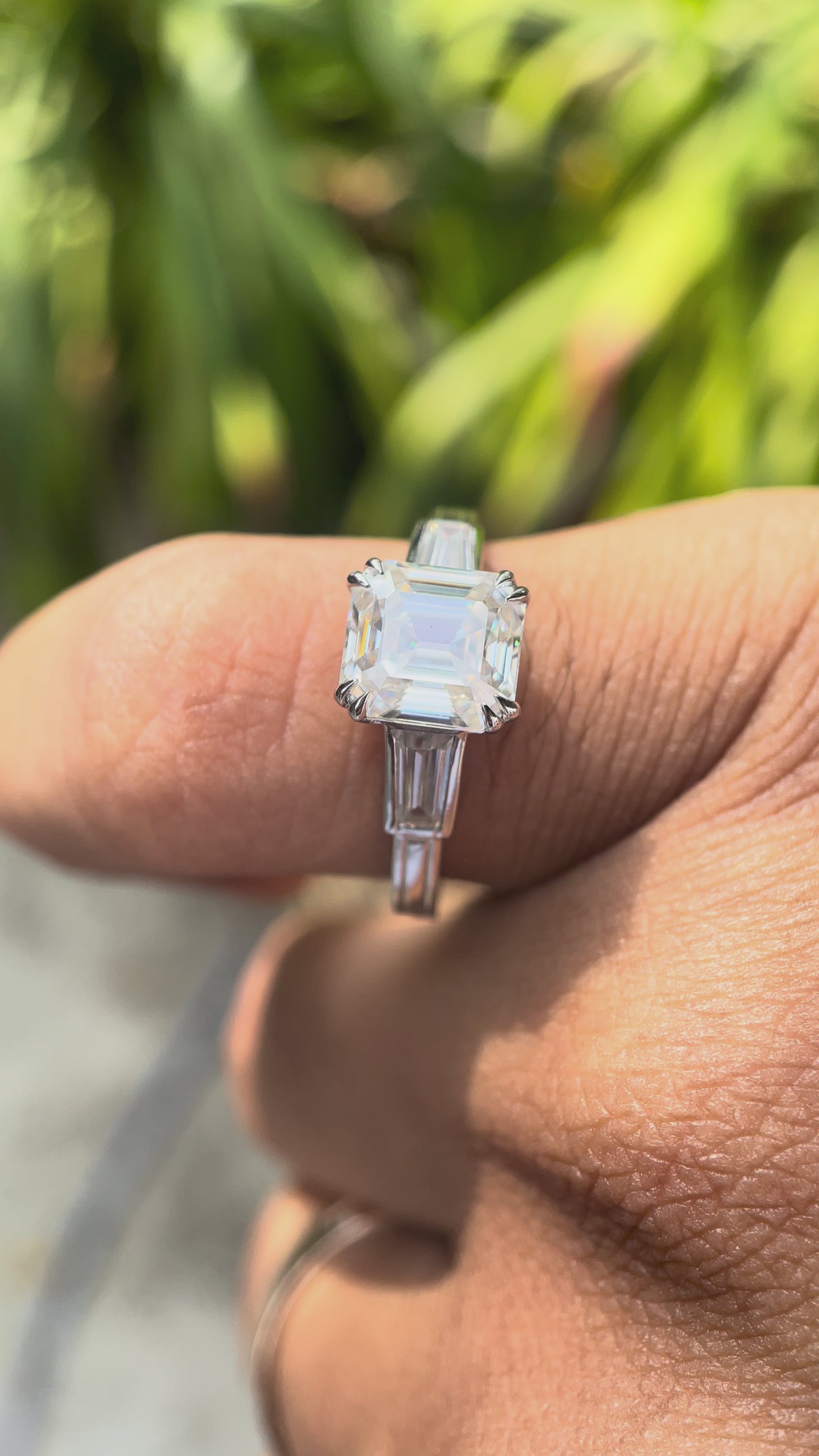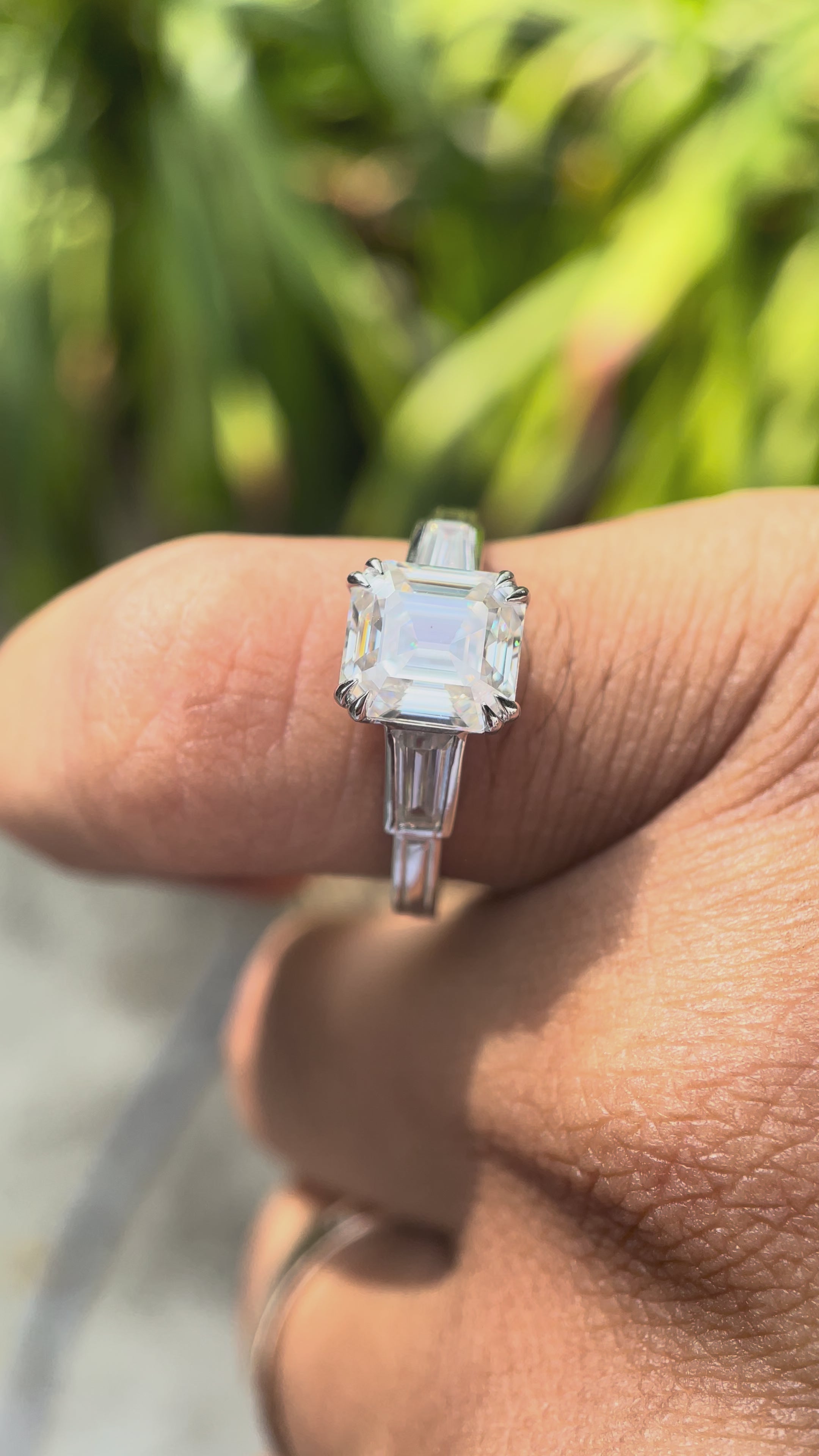Elegant, symbolic, and timeless this Old Mine Asscher Cut Three Stone Engagement Ring is a breathtaking representation of enduring love. Handcrafted in 14K solid gold, this trilogy-style ring features a dazzling Old Mine-inspired Asscher cut Moissanite center stone, flanked by two matching side stones. Designed for the modern woman with a love for vintage aesthetics, this ring is the perfect expression of past, present, and future romance.