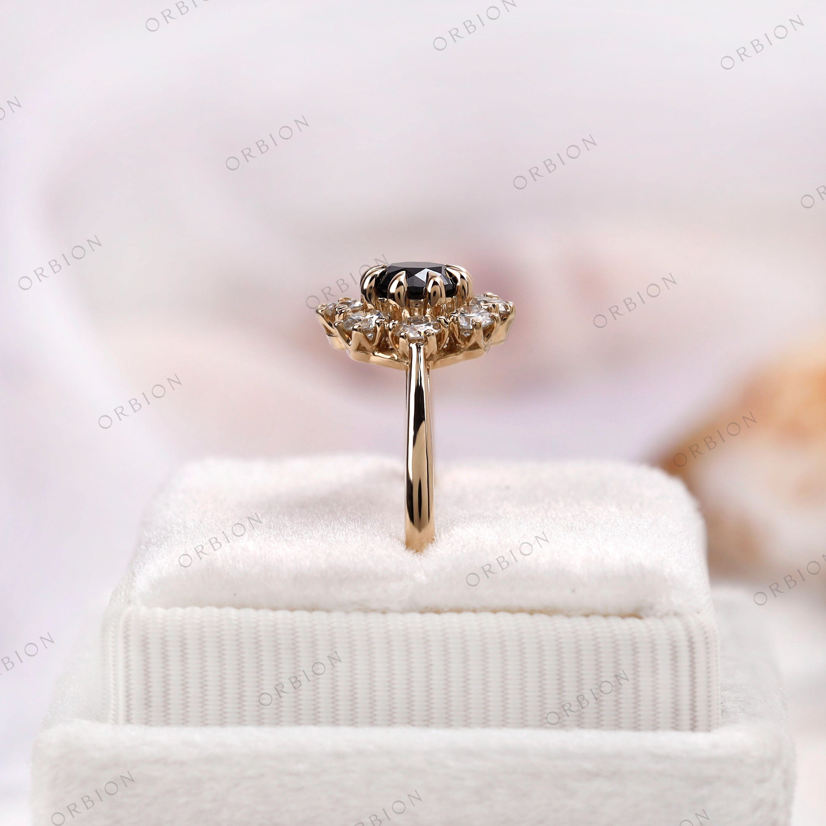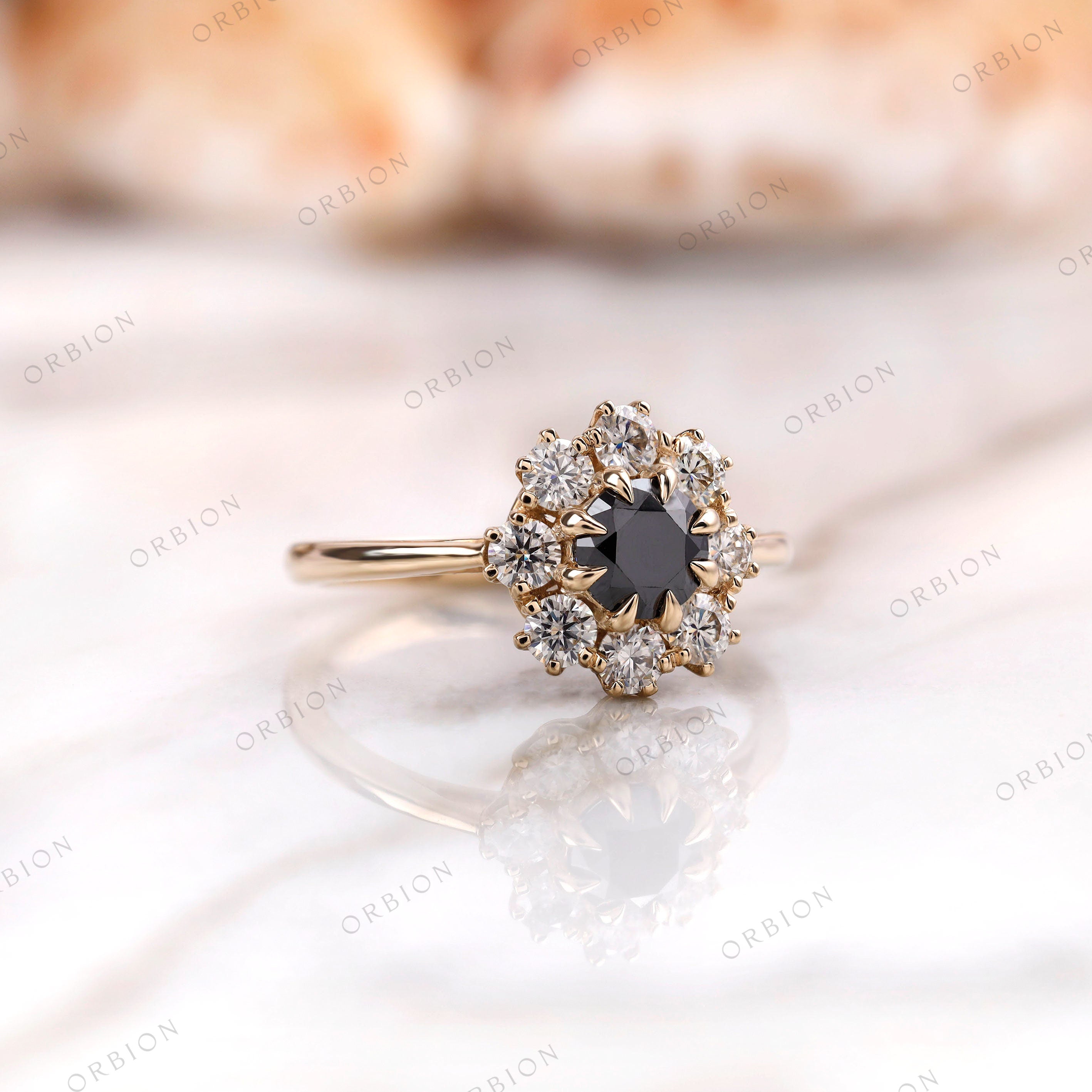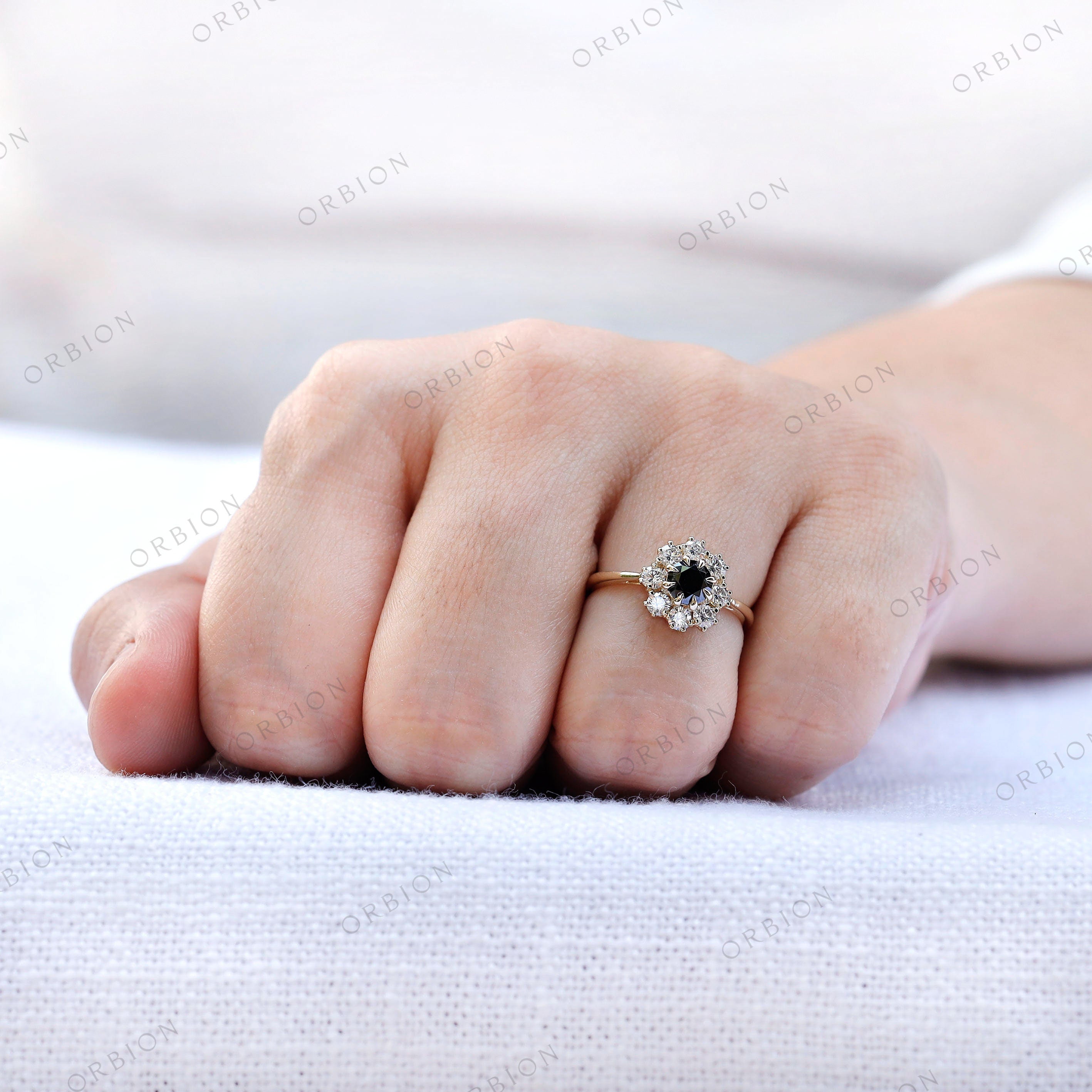 Vintage engagement ring, Black & white moissanite ring, Cluster wedding ring, 10k/14k/18k solid gold ring, Old european cut, Vintage jewelry, OEC wedding ring, Estate jewelry, Antique ring, Handmade jewelry, Unique engagement ring, Georgian ring, Old cut moissanite, Antique-style ring, Black moissanite, Halo ring.