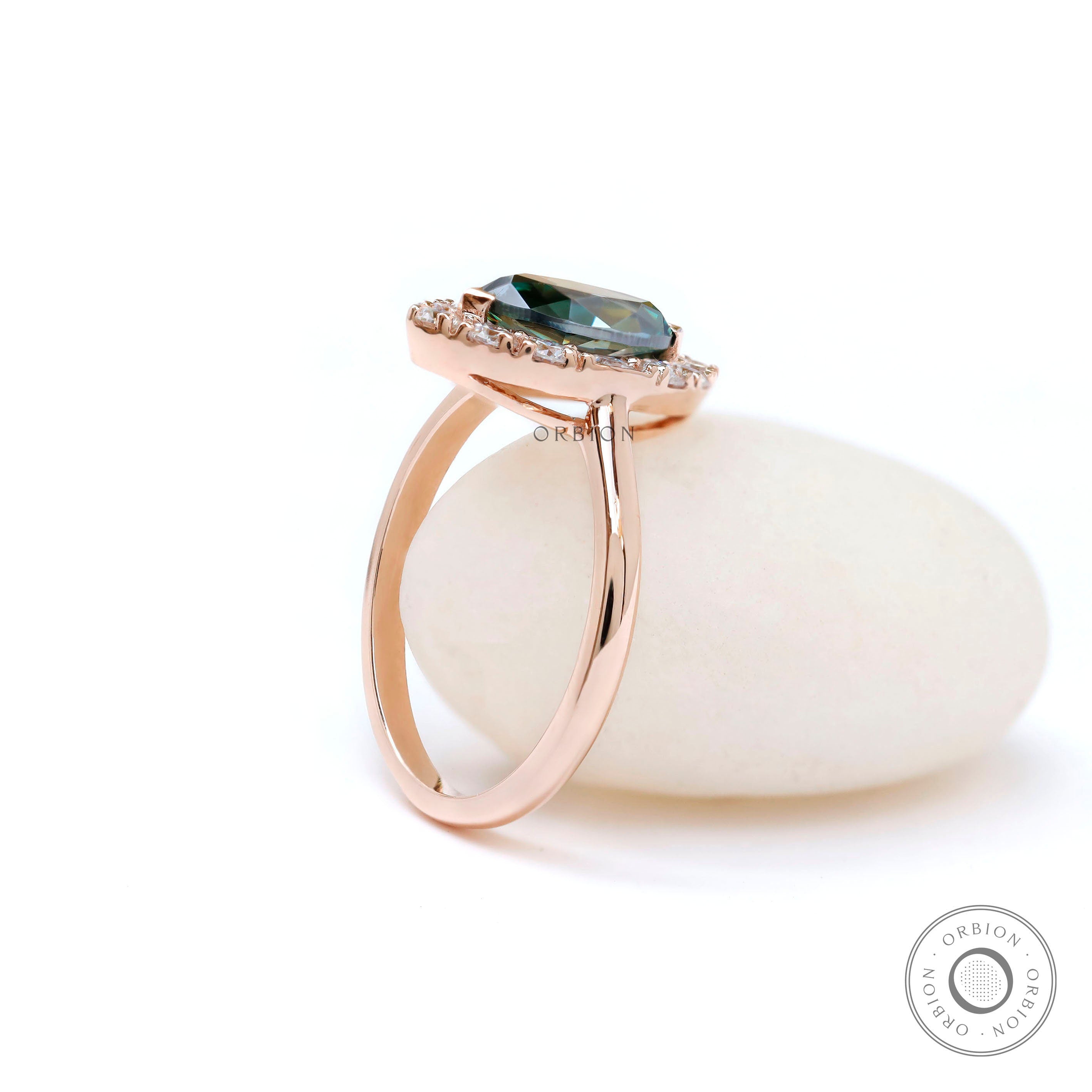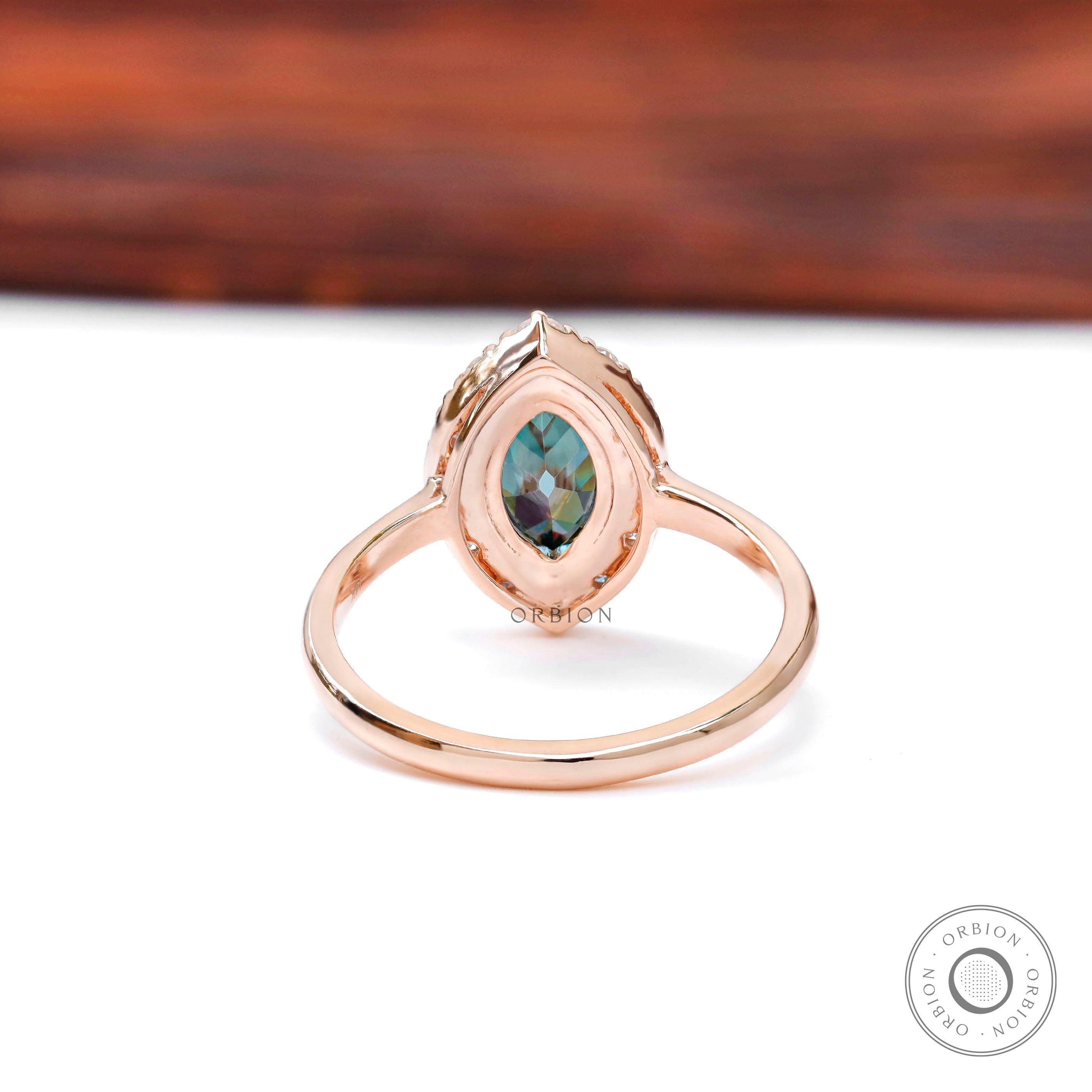 Modern Statement Ring, Halo Wedding Rings For Women, Dark Blue Green Marquise Moissanite Halo Engagement Ring, Teal Moissanite Jewelry, Color Moissanite Ring, 14K Solid Rose Gold Ring, Anniversary Gift For Her, Proposal Ring, Marquise Cut Ring, Handmade Jewelry, Promise Ring