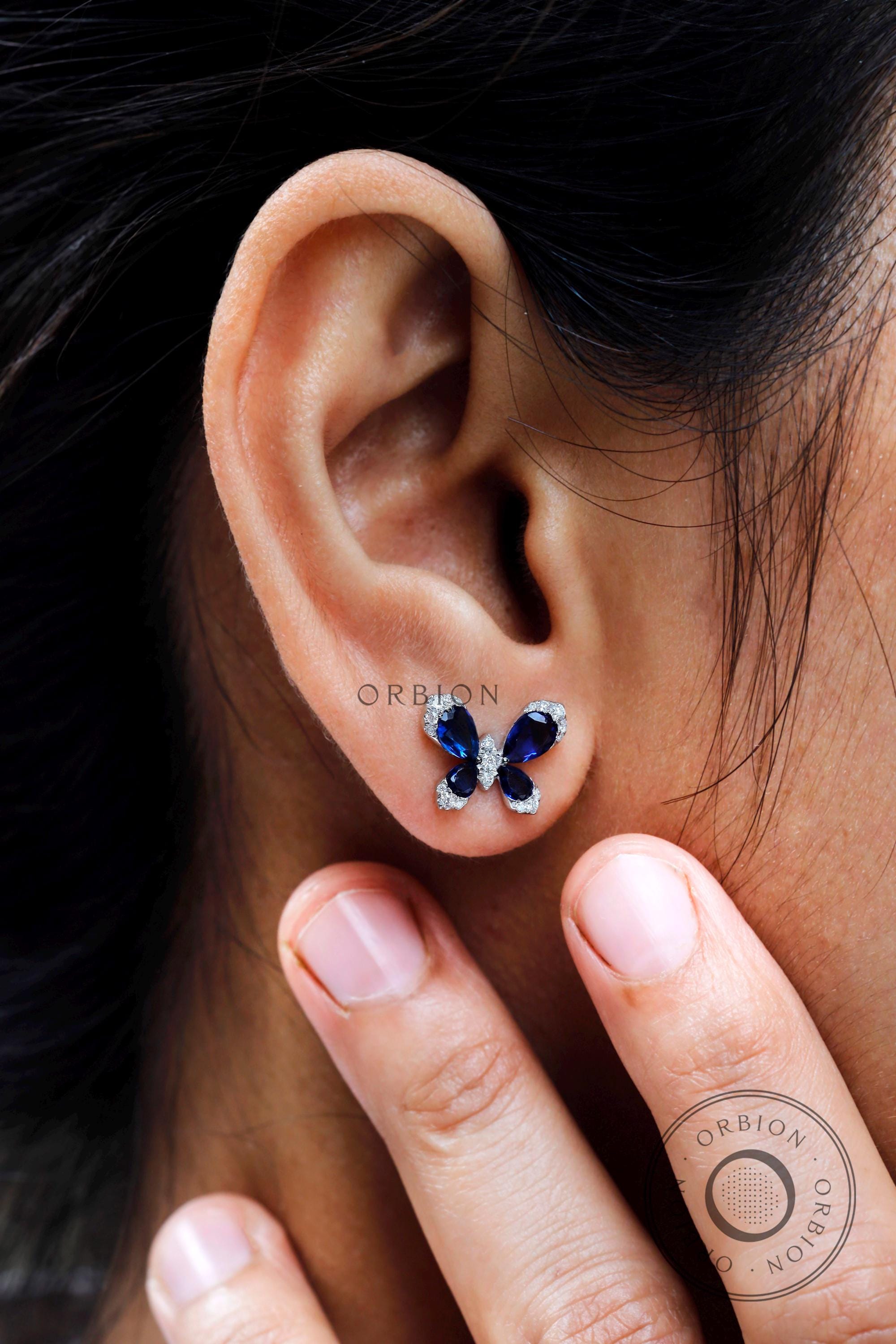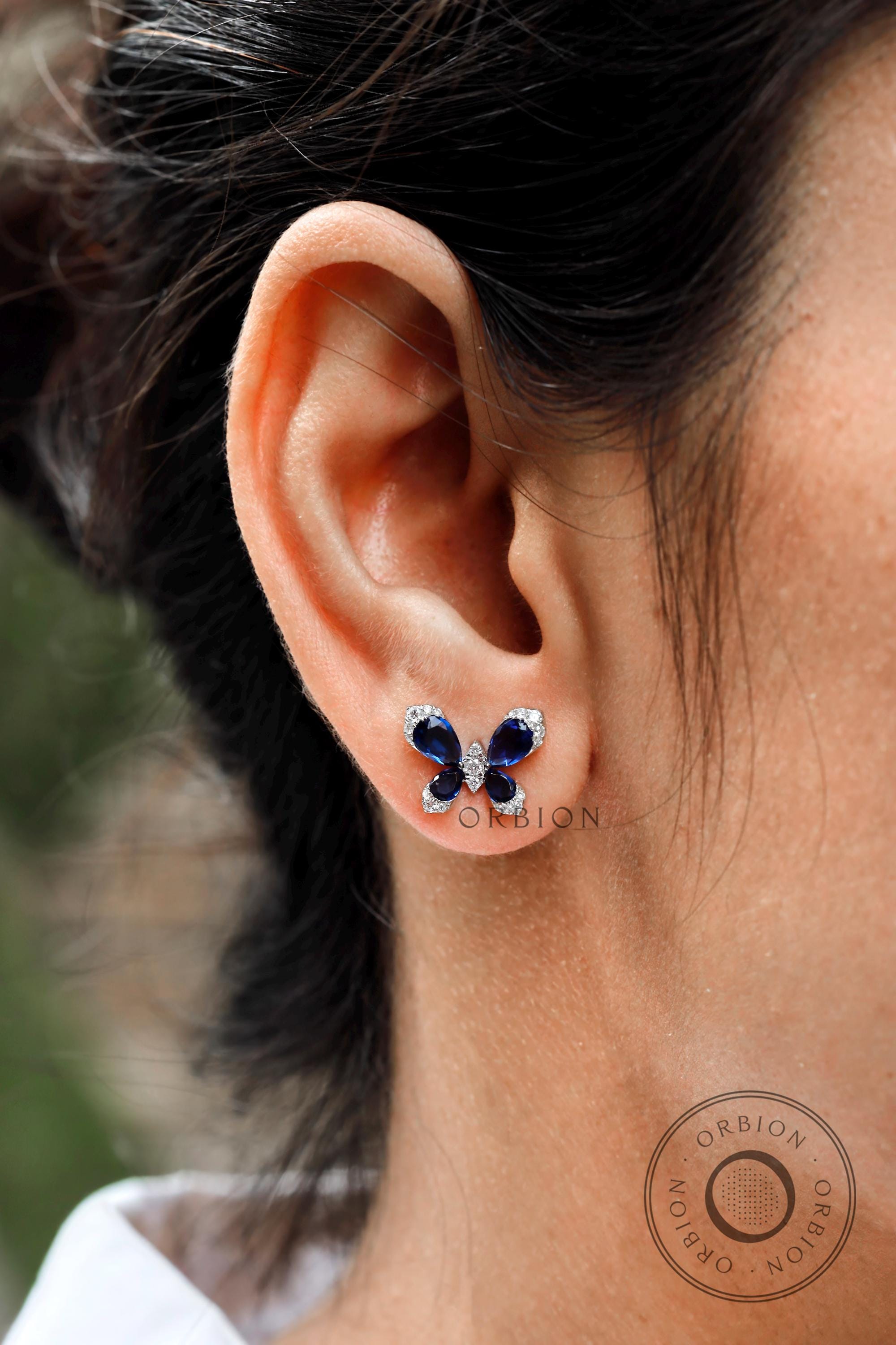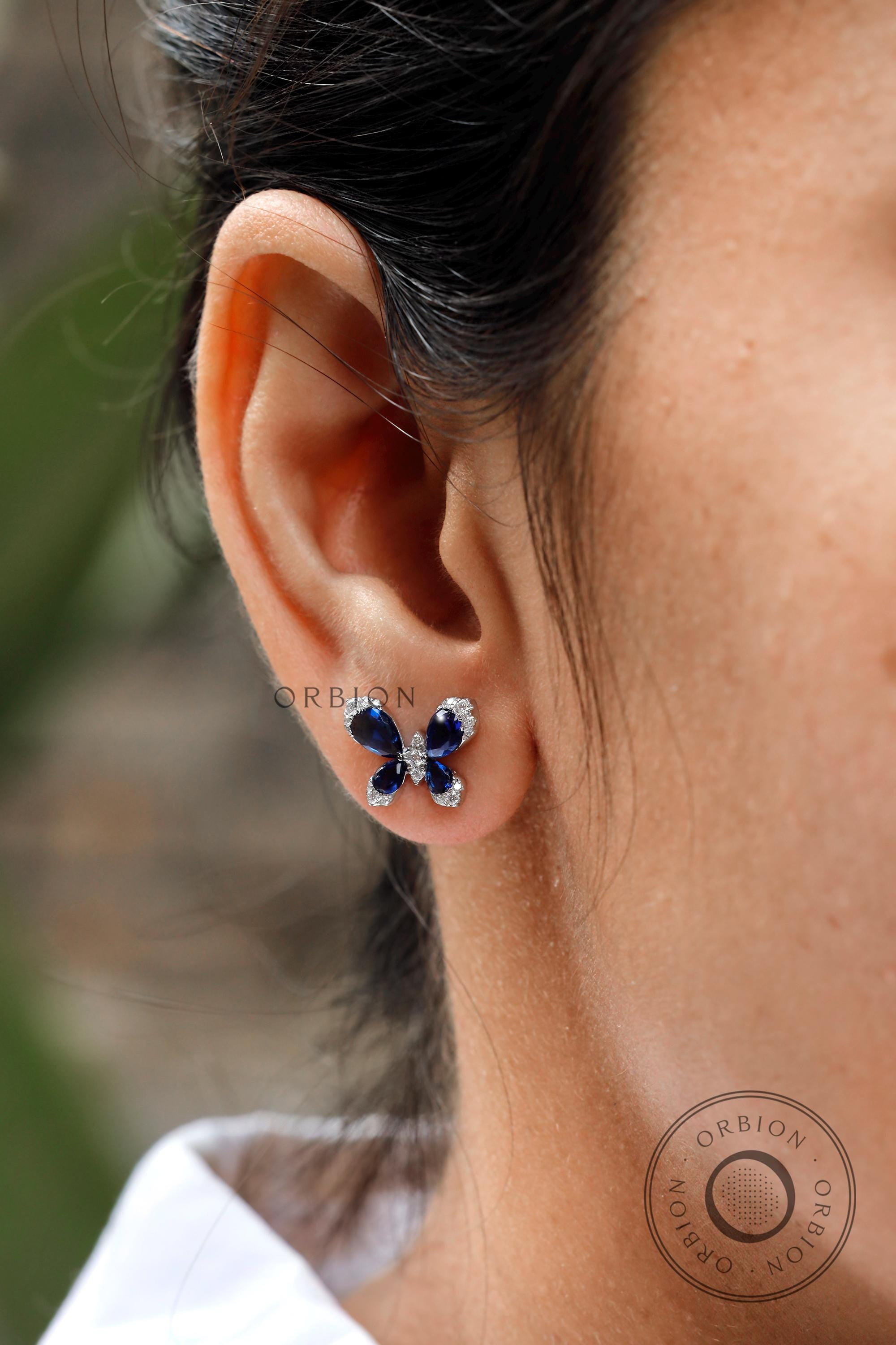 Butterfly shaped earrings, Blue sapphire earrings, 10k/14k/18k Solid gold earrings, Lab grown diamond earrings, Push/Screw back earrings, Stud earrings for women, Gemstone stud earrings, Blue stone earrings, Butterfly style earrings, Butterfly shaped earrings, Insect jewelry, Birthday gift for her
