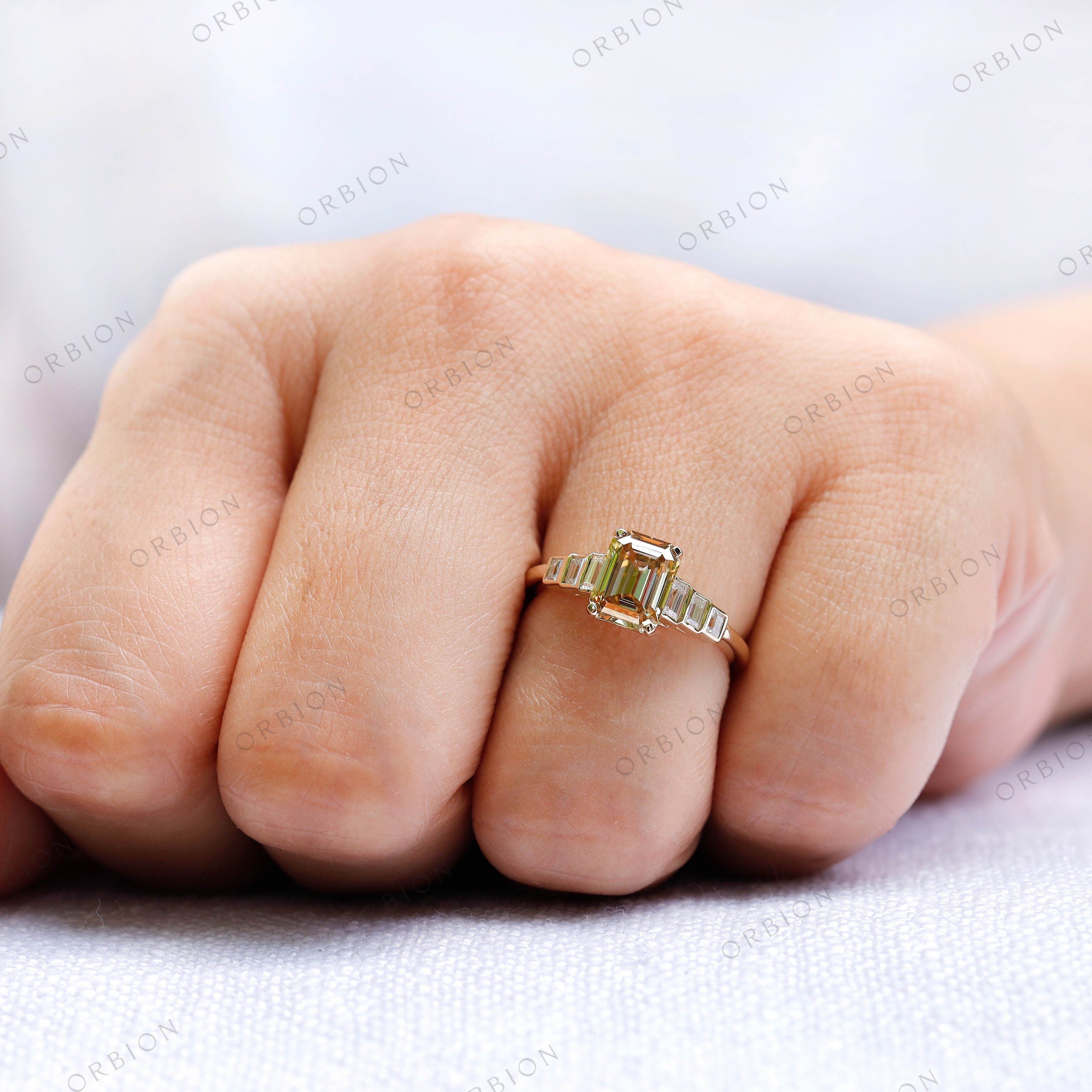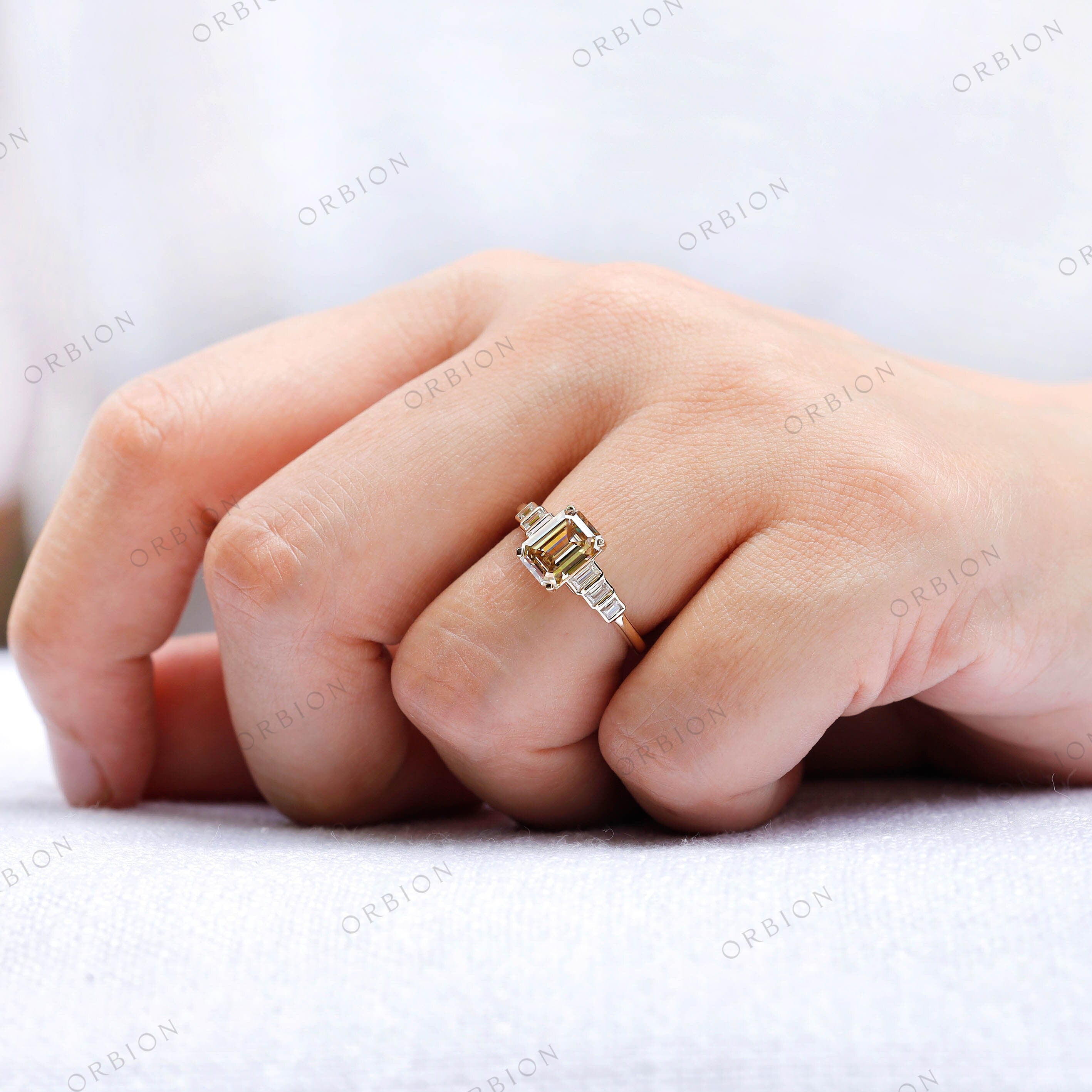 1.5 CT Emerald Cut Dark Champagne Moissanite Ring, 14K Gold Cluster Ring, Baguette Accent Ring, Unique Engagement Ring, Vintage Ring For Her, Antique Promise Ring, 1st Anniversary Gift, Multi Stone Ring