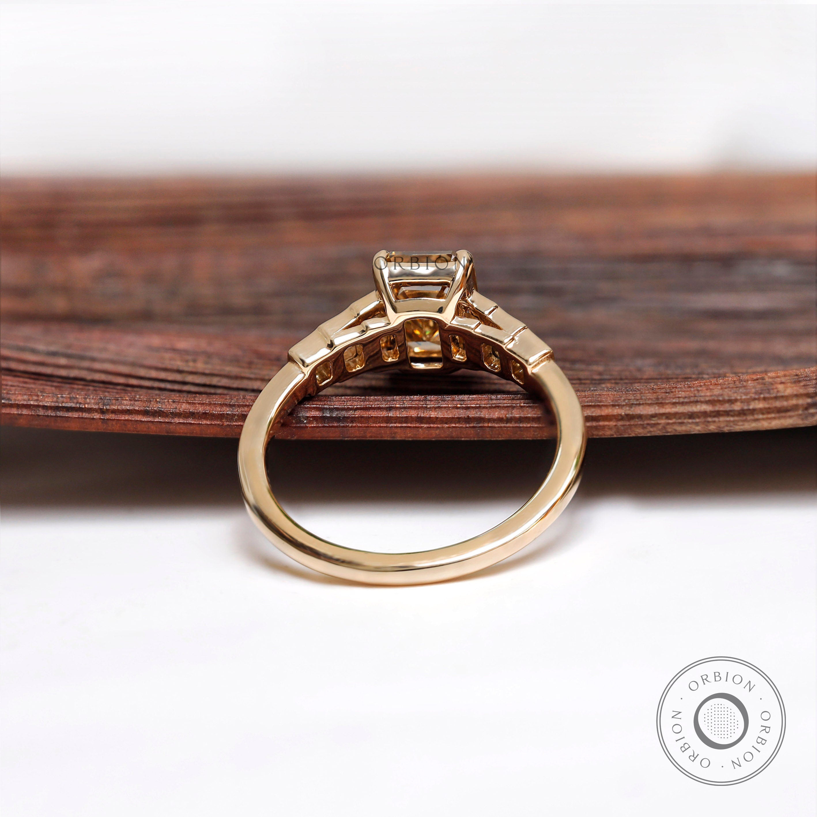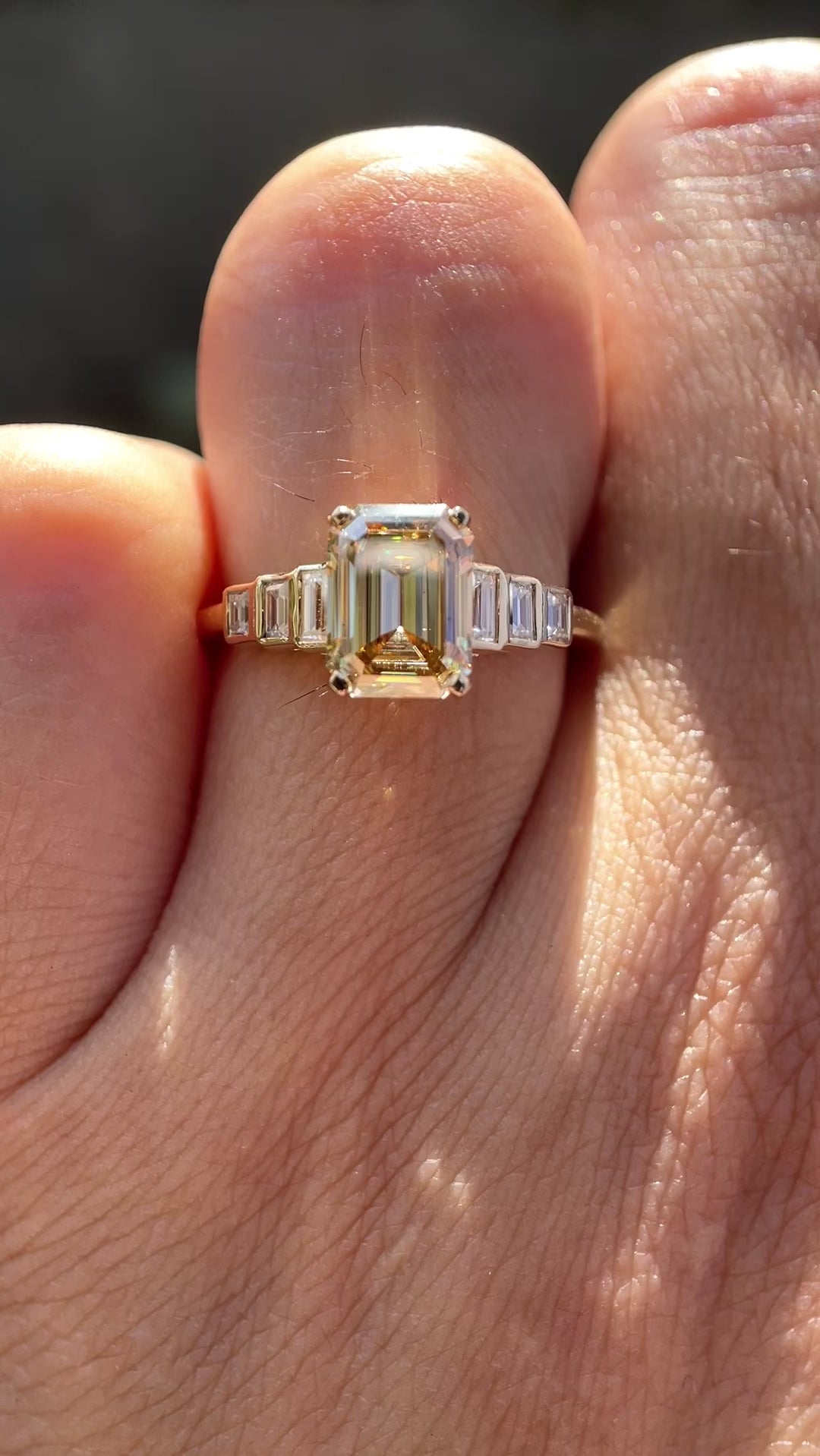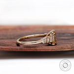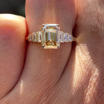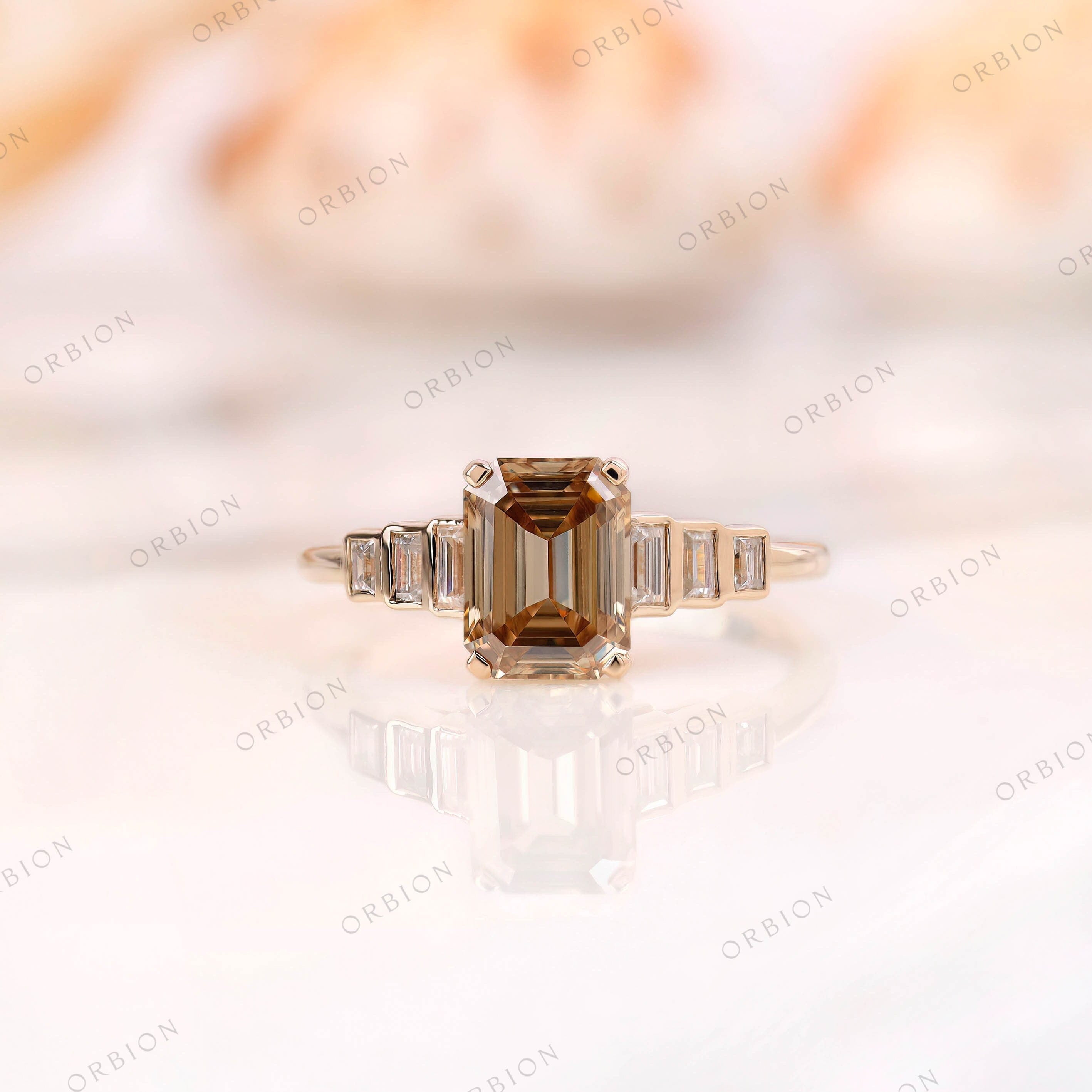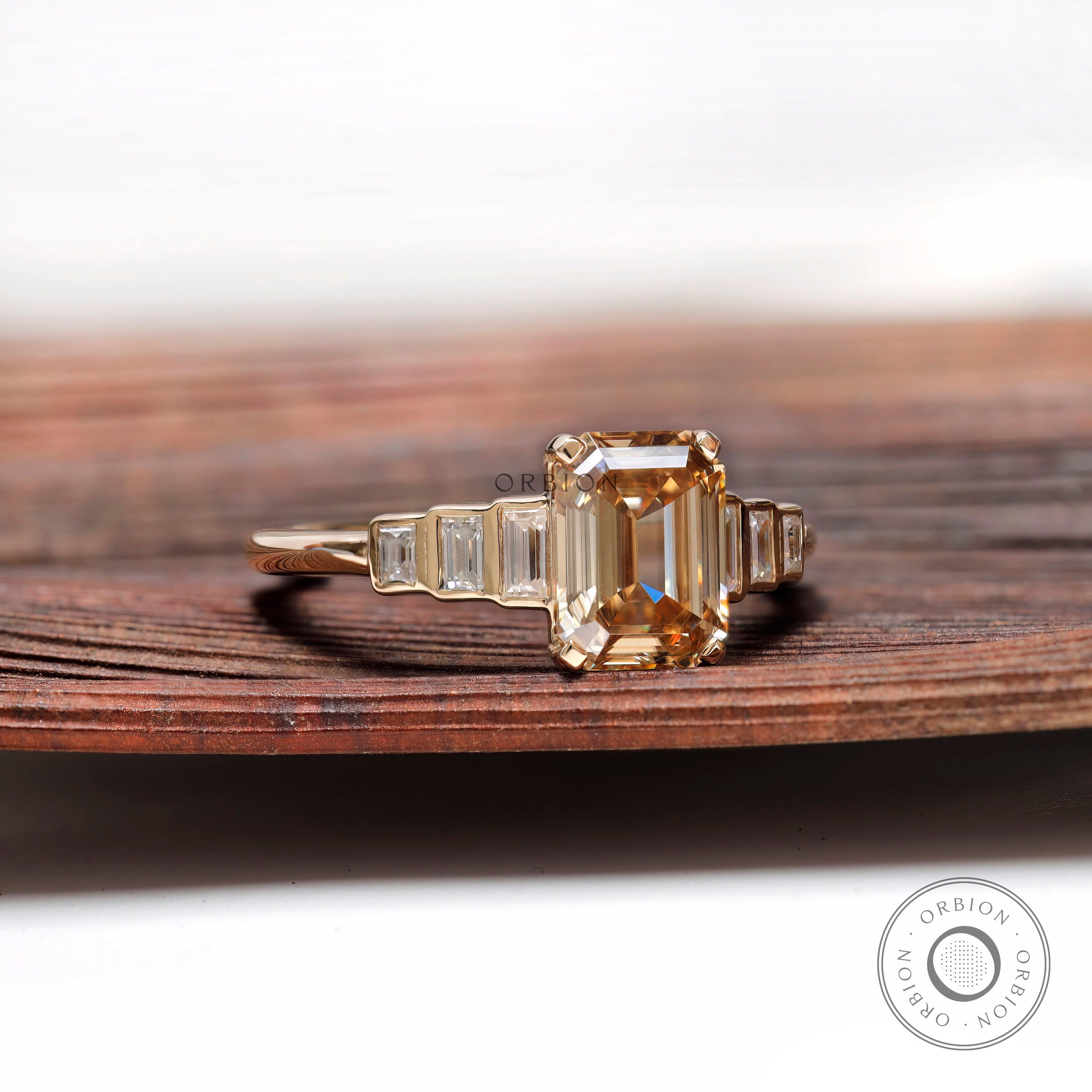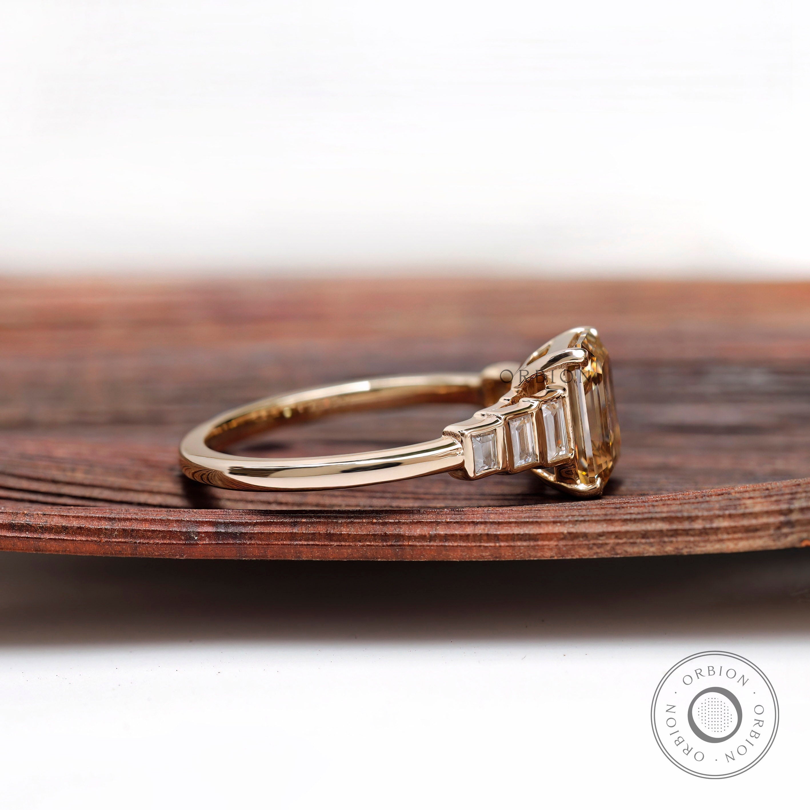 Champagne Moissanite Ring Cluster, Emerald Cut Champagne Ring, 14K Gold Cluster Ring, Baguette Accent Ring, Step Cut Ring, Anniversary Ring
