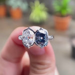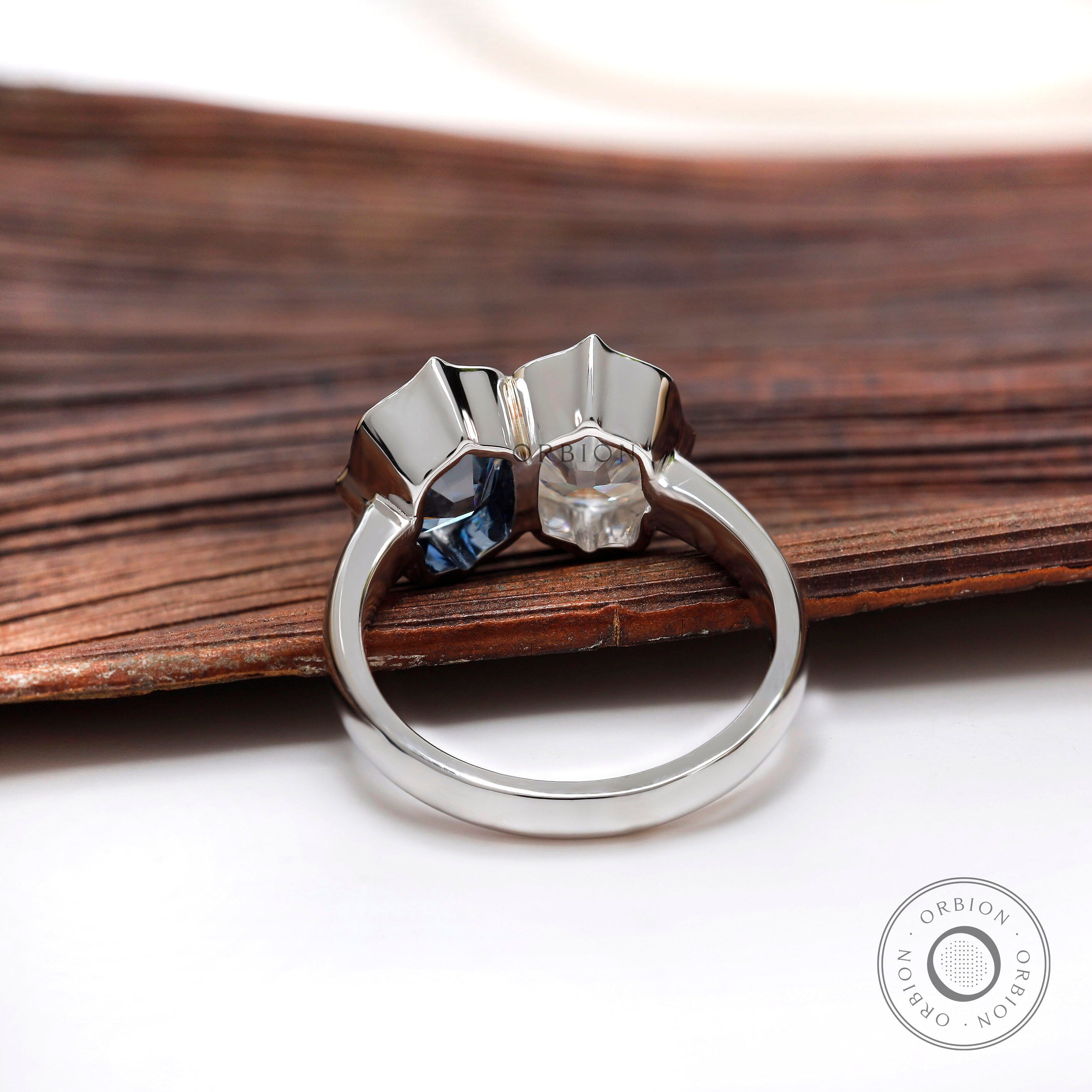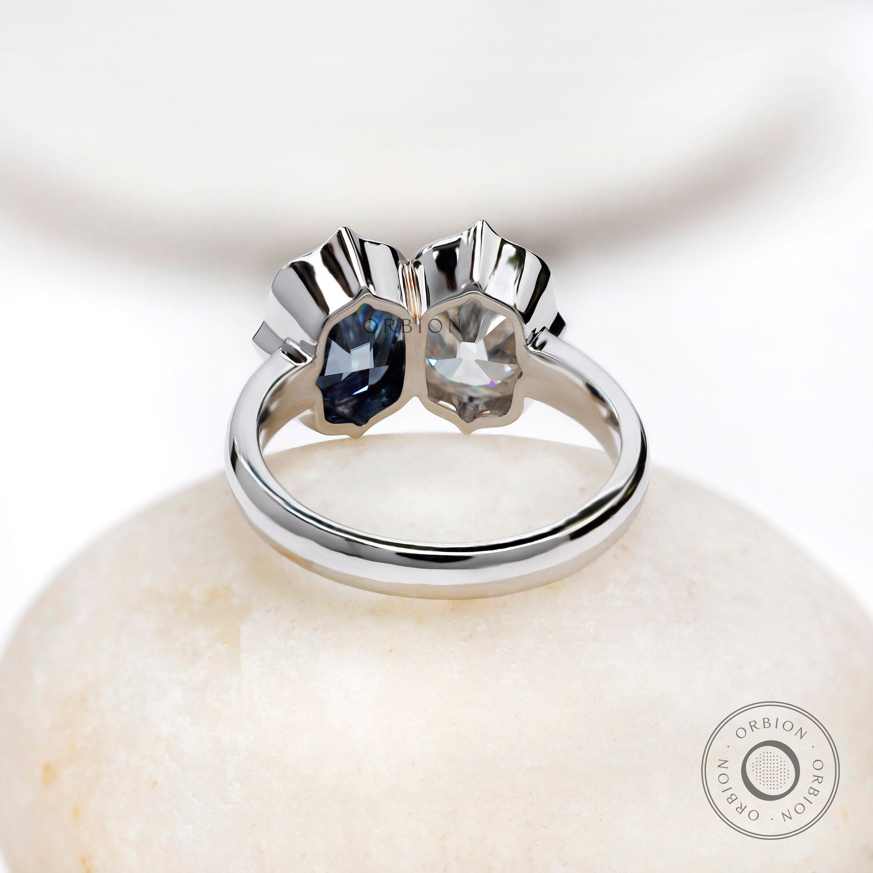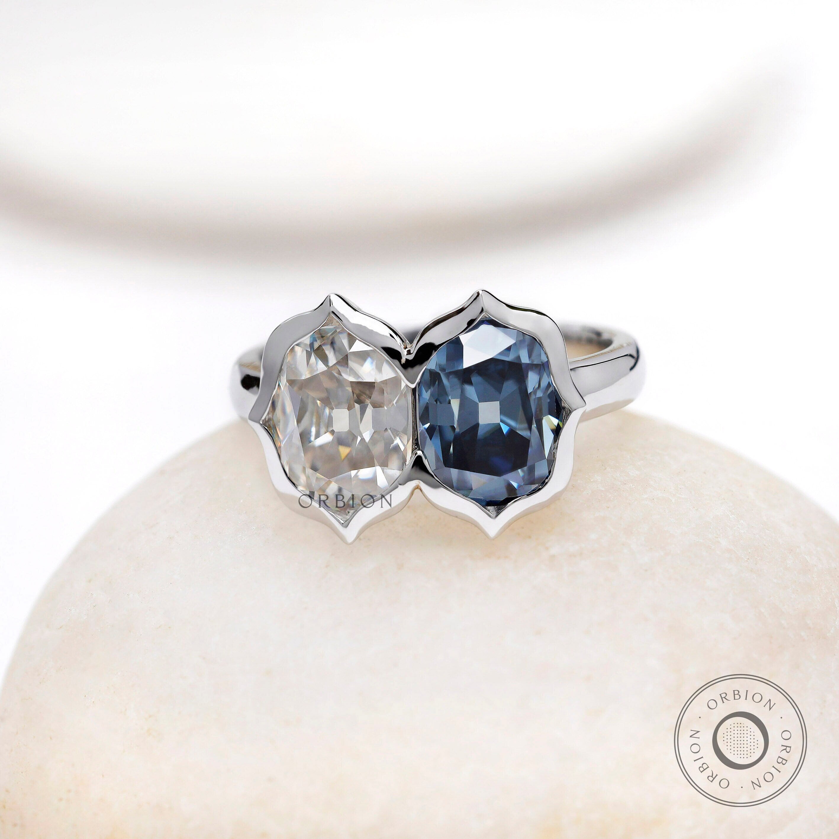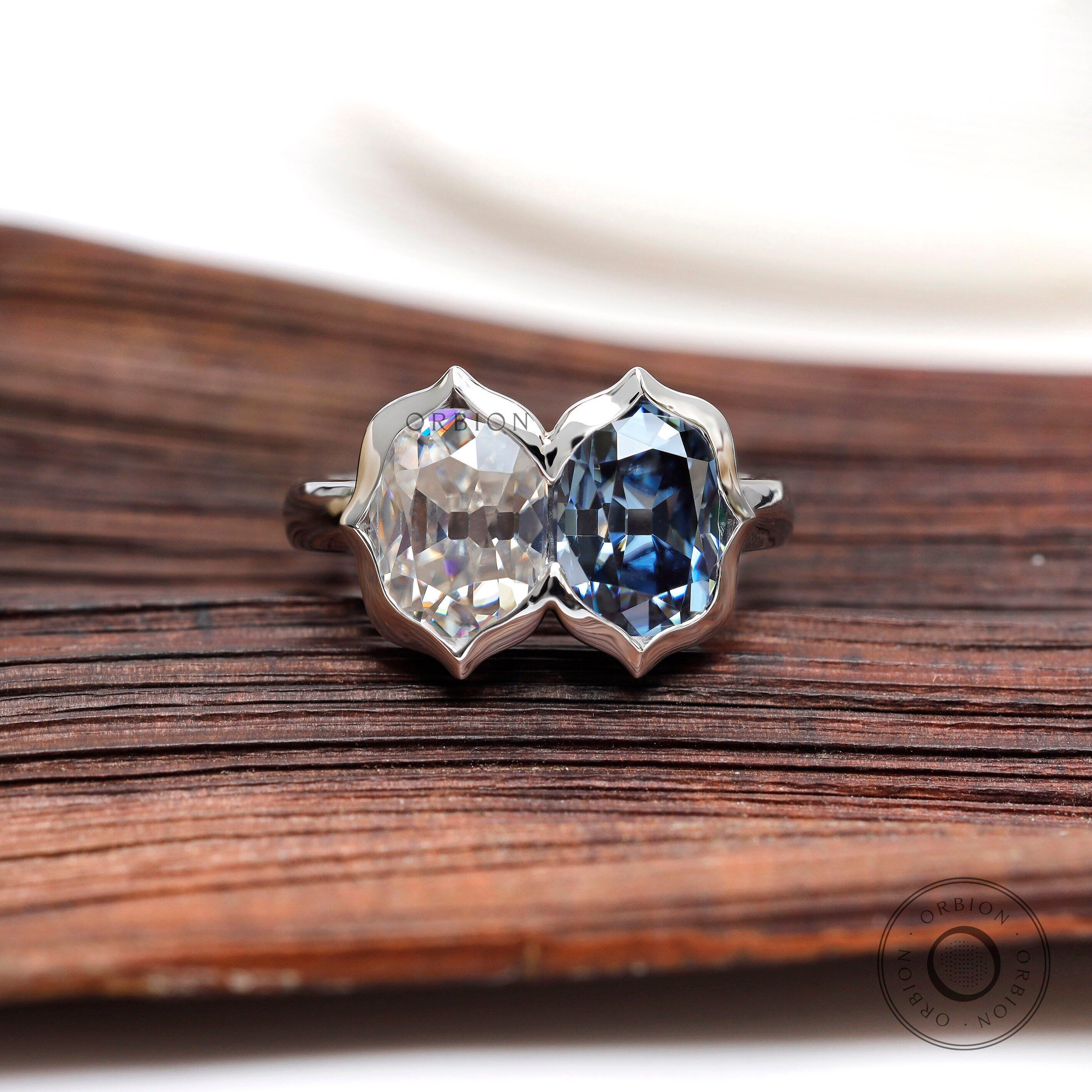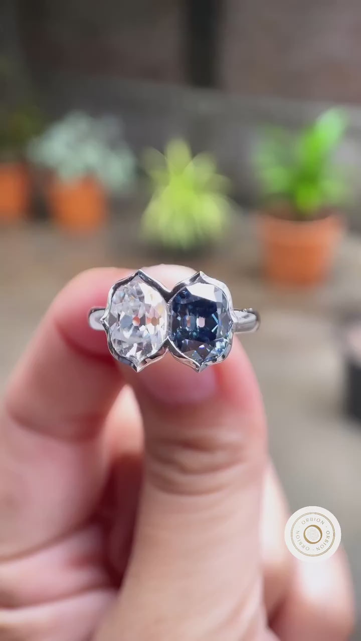 Deep Blue Elongated OMC Moissanite Toi Et Moi Ring, Double Stone Ring, Two Stone Engagement Ring, Antique Bezel 14K White Gold Ring