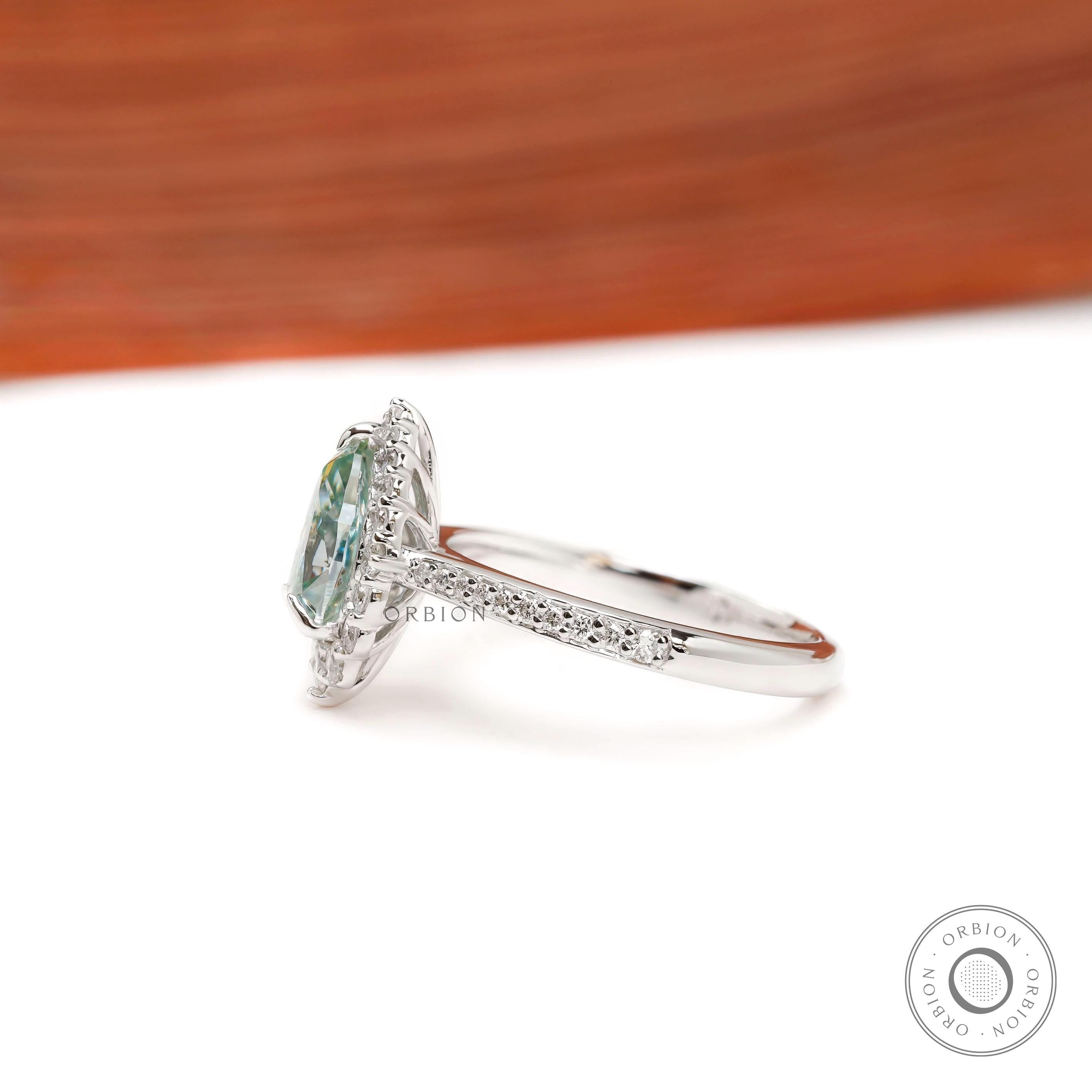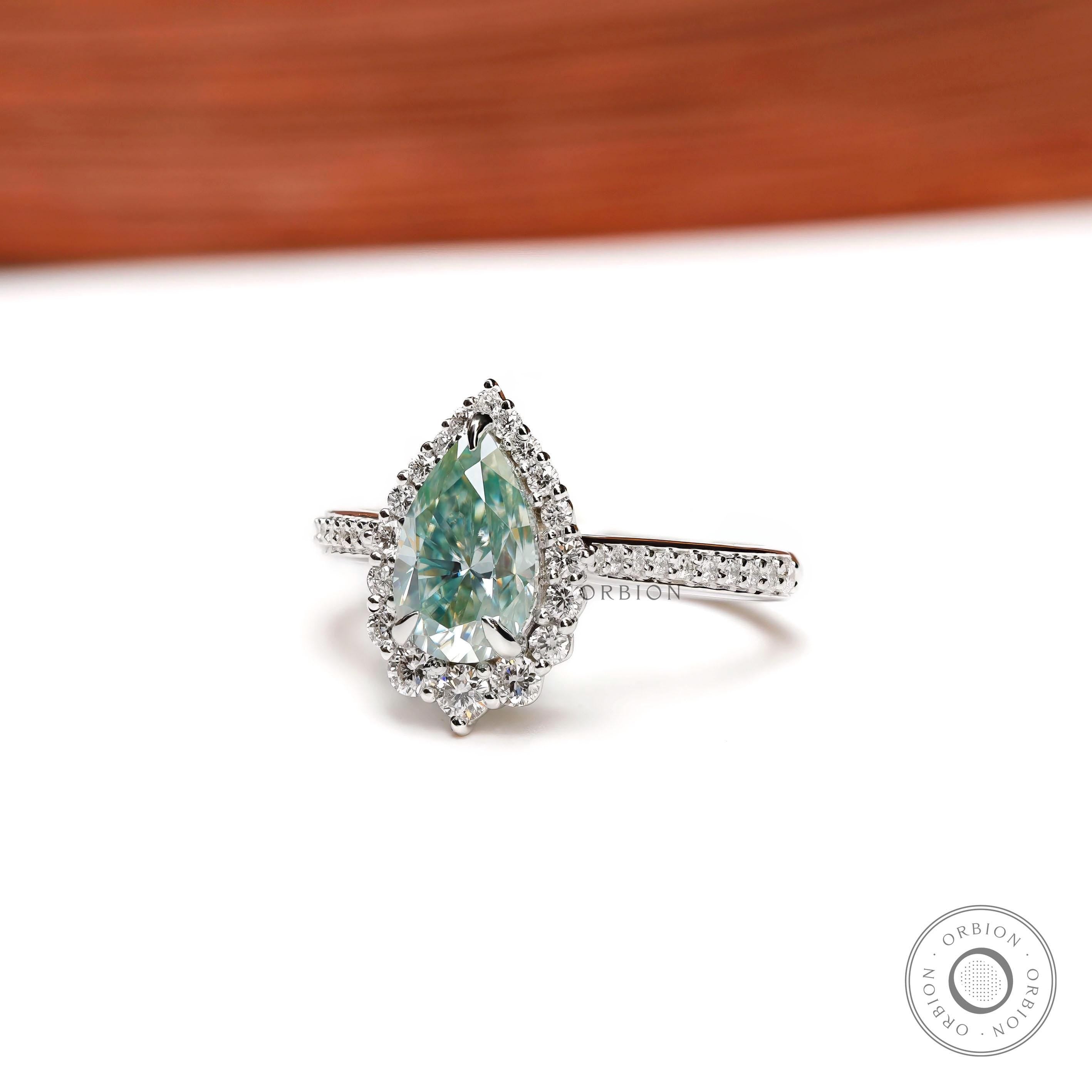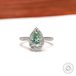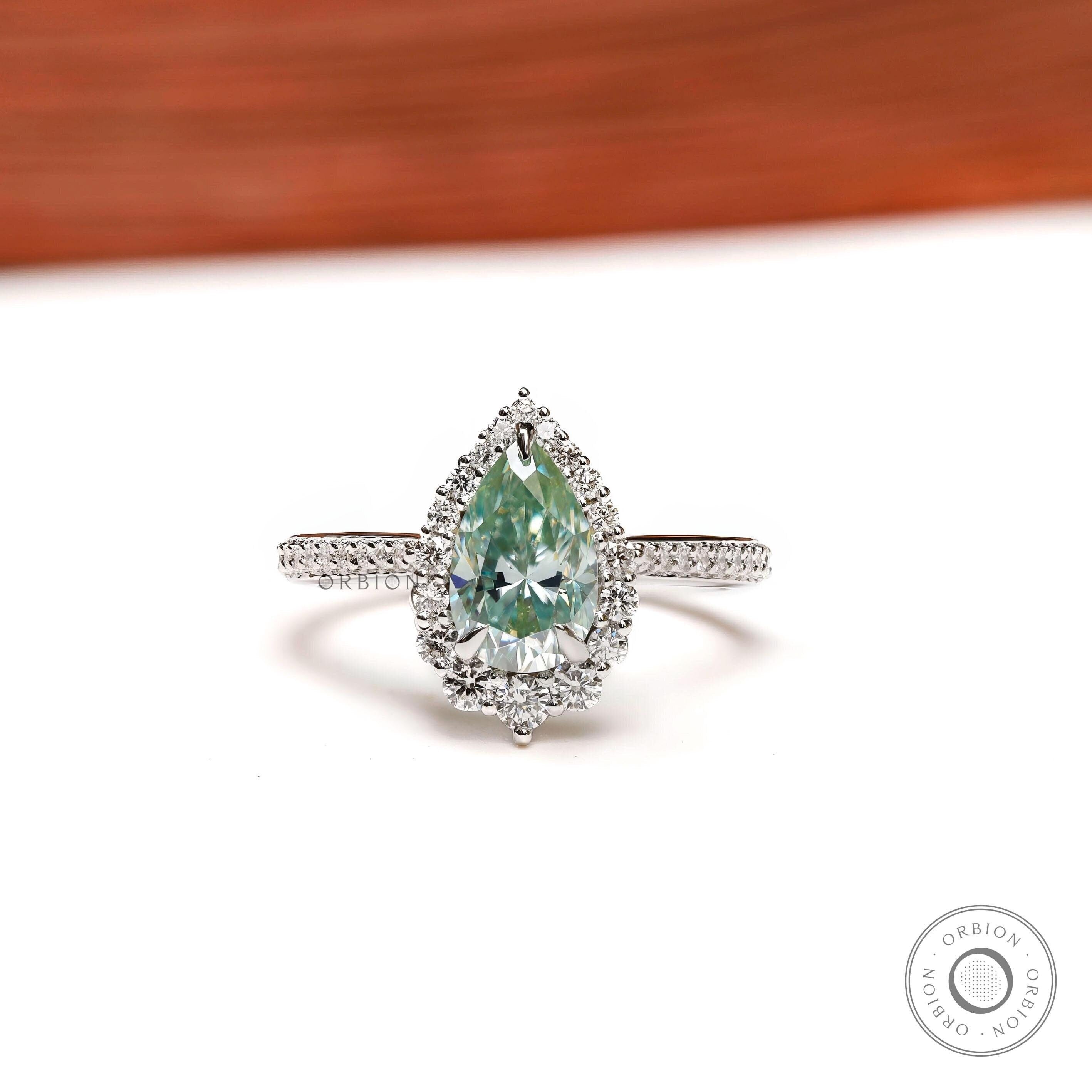 Elegant Light Green Moissanite Halo Ring in White Gold - Perfect for Proposals Unique and Sparkling Pear Cut Design, A Timeless Choice