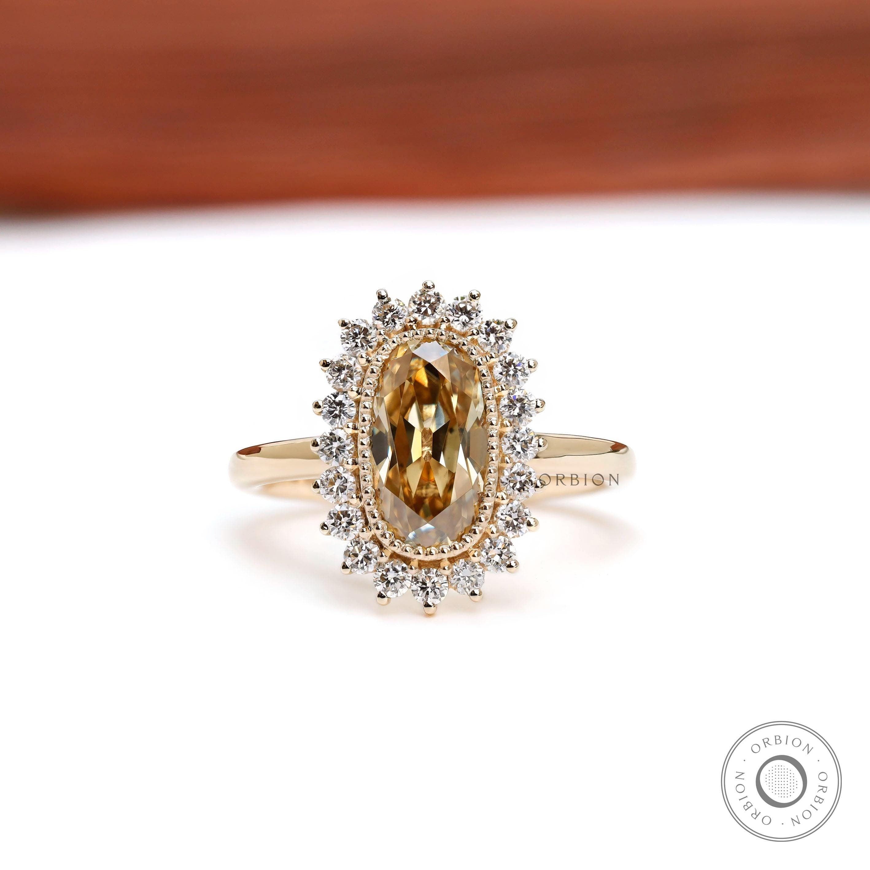 Vintage-inspired Champagne Moissanite Ring in Yellow Gold - Handcrafted Bezel Setting, Milgrain Halo Engagement Ring with Old Mine Cut