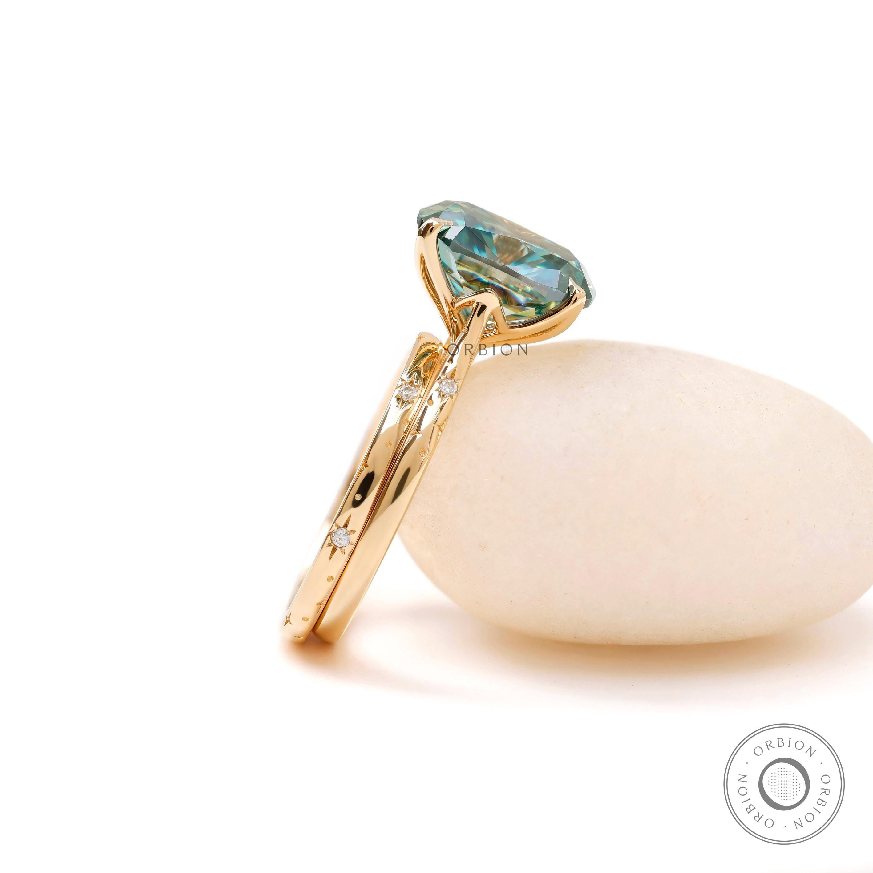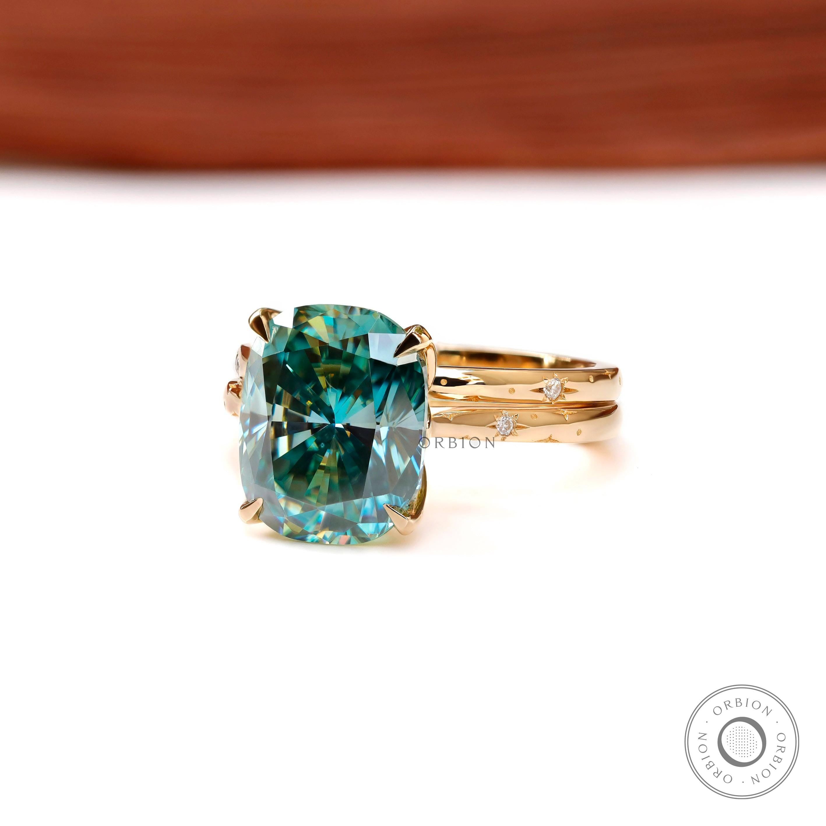 Elongated Cushion Dark Blue Green/Cyan Moissanite Starburst Ring Set, Tulip Engagement Ring With Matching Celestial Band, 18K Yellow Gold
