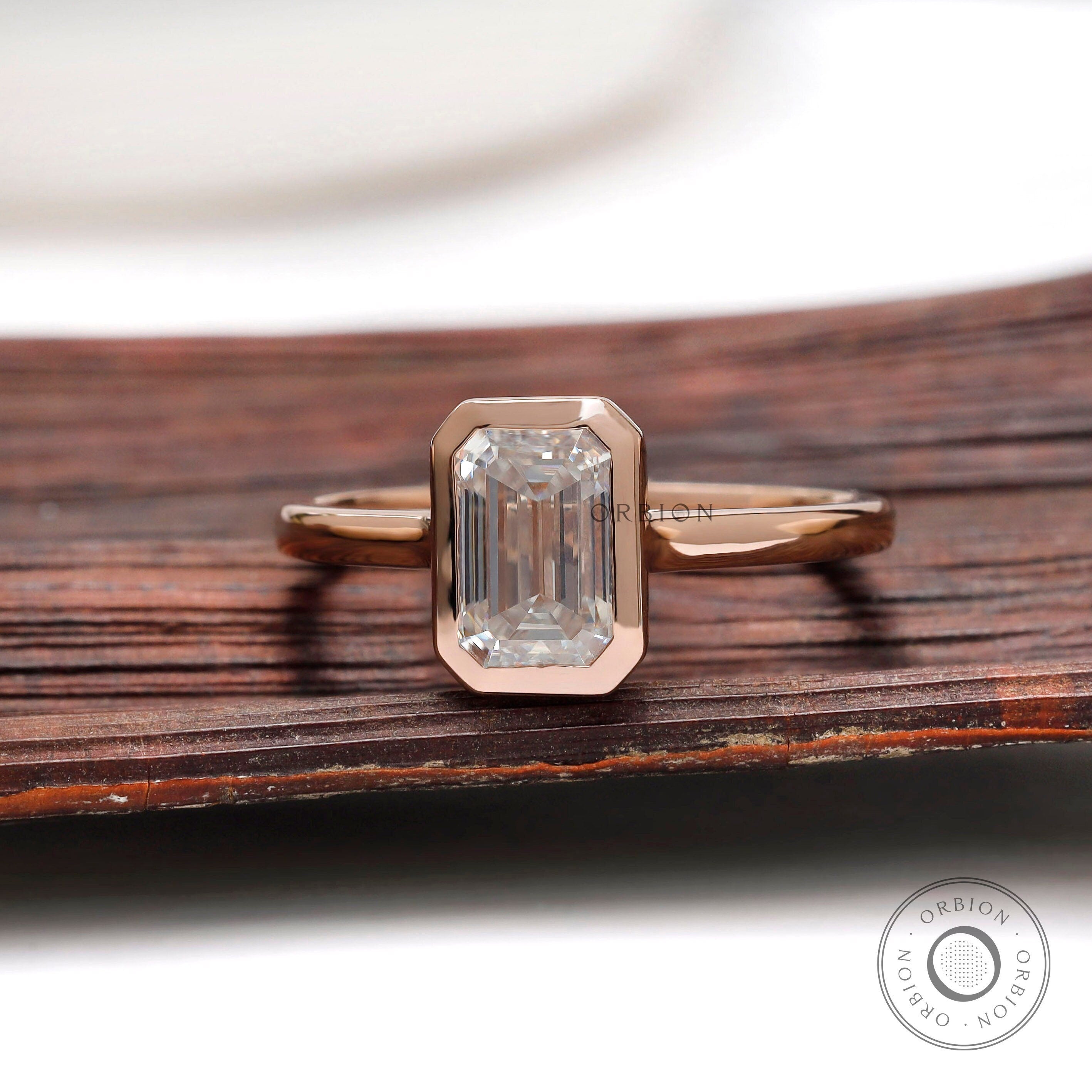 Emerald Cut Moissanite Bezel Engagement Ring, Solitaire Wedding Ring for Her, Classic Comfort Fit Ring, Yellow/White/Rose Gold Handmade Ring