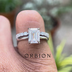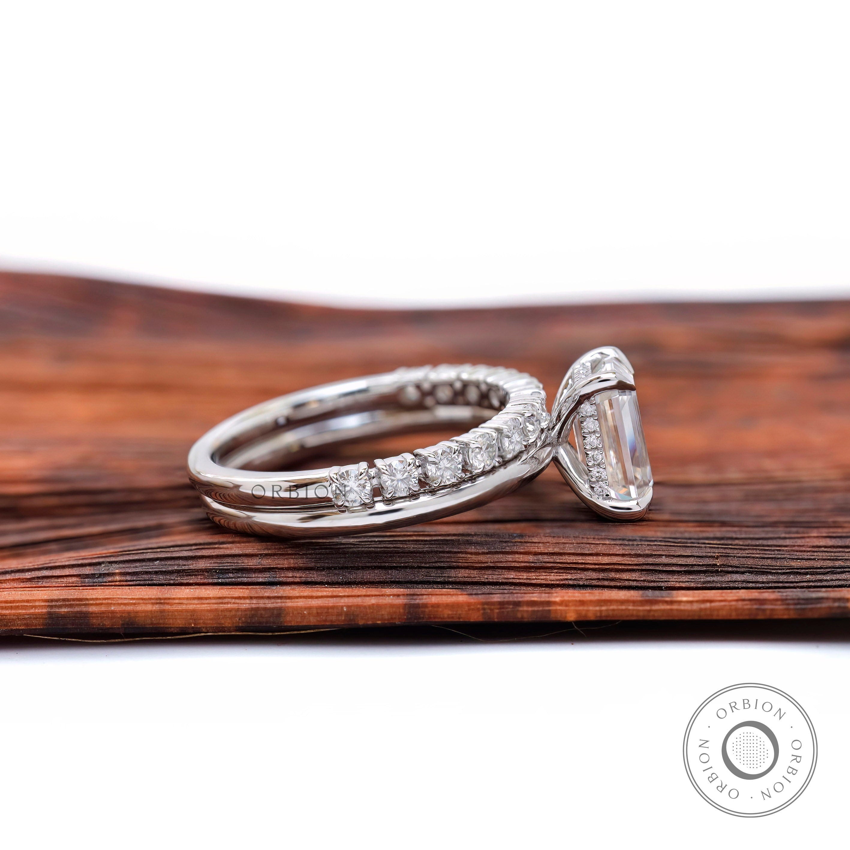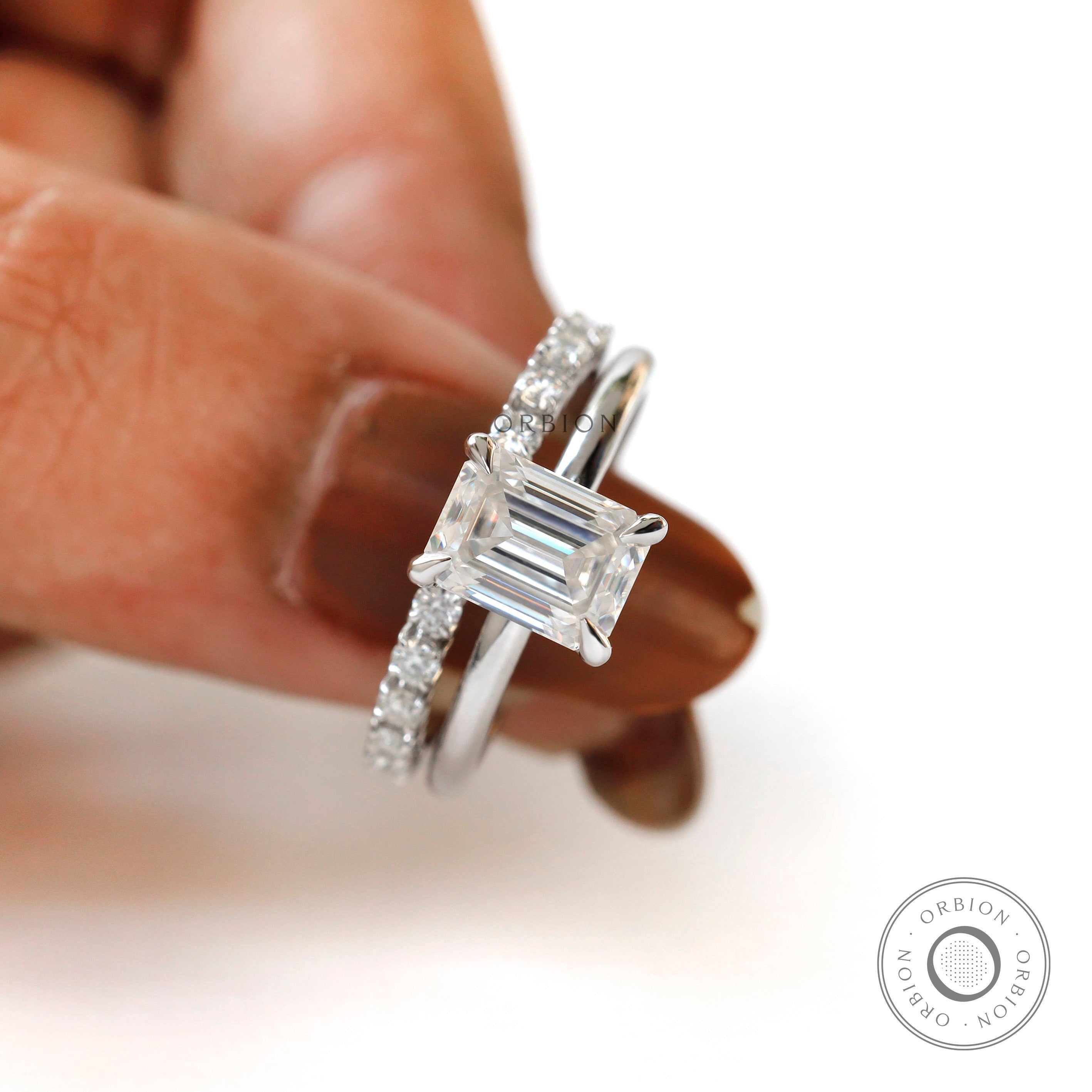 Emerald Cut Moissanite Engagement Ring Set, Emerald Cut Ring Set, 14k White Gold Ring Set, Hidden Halo Ring Set, Wedding Ring Set