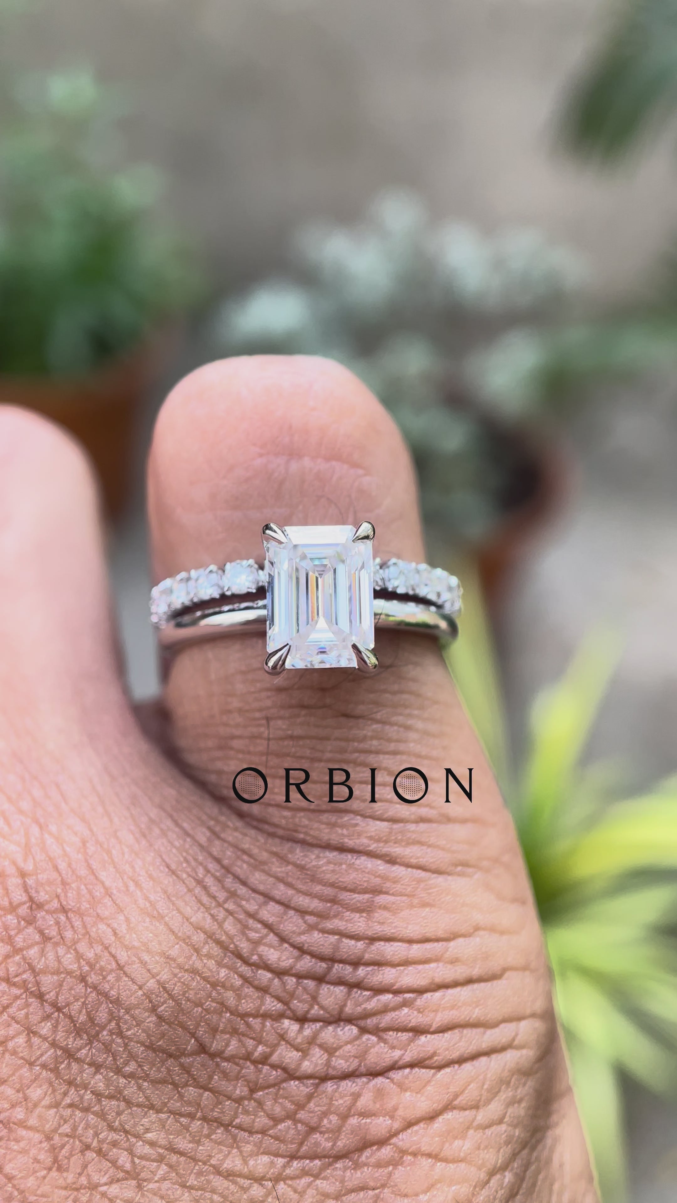 Celebrate your forever love with this stunning 2-piece bridal ring set featuring a 1.7 carat emerald cut moissanite center stone, expertly set in a claw prong setting for maximum brilliance and elegance. This handcrafted engagement ring is paired with a round moissanite matching band, creating a timeless and romantic wedding set.