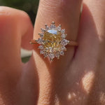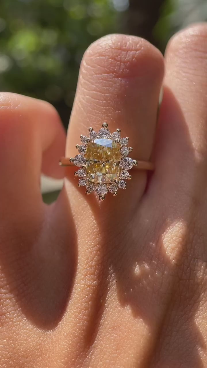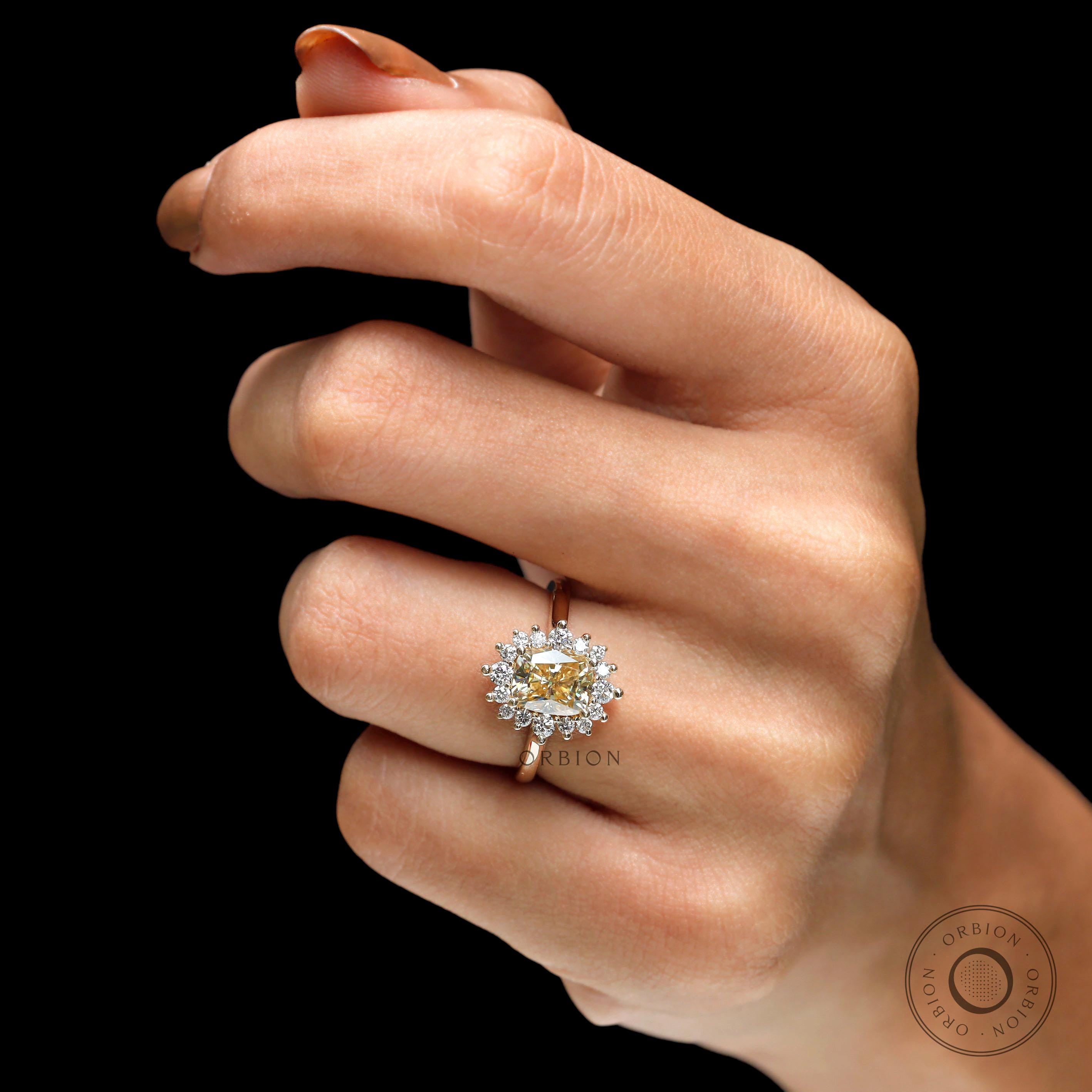 Elongated Cushion Yellowish Champagne Moissanite Ring, Halo Wedding Ring, Color Moissanite Ring, Solitaire Cluster Ring, Unique Cathedral Rings, Fancy Color Stone Ring, 10k/14k/18k Solid Gold Ring, November Birthstone Ring, Wedding Ring For Her, Statement Ring For Women, Bridal Ring, Anniversary Gift