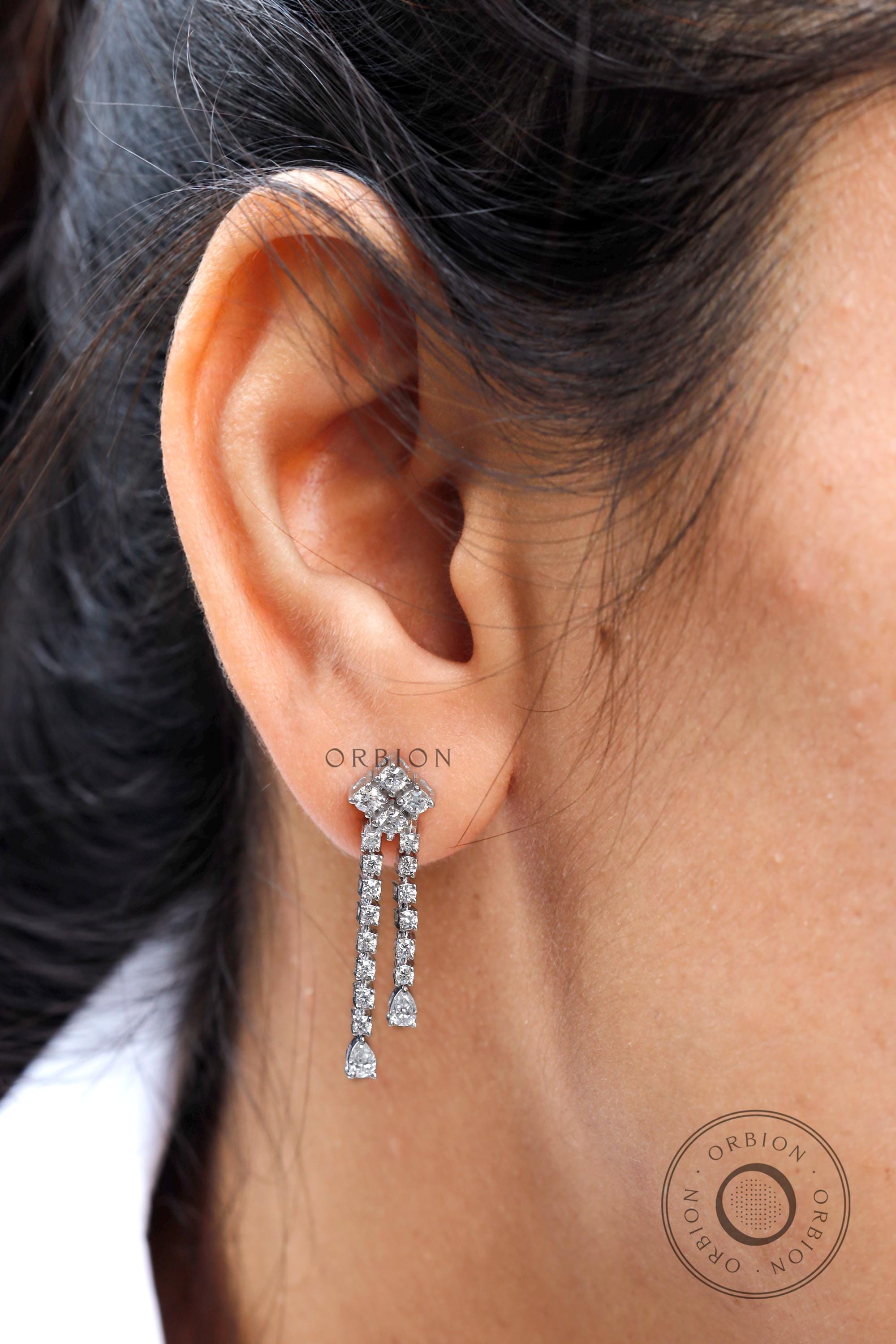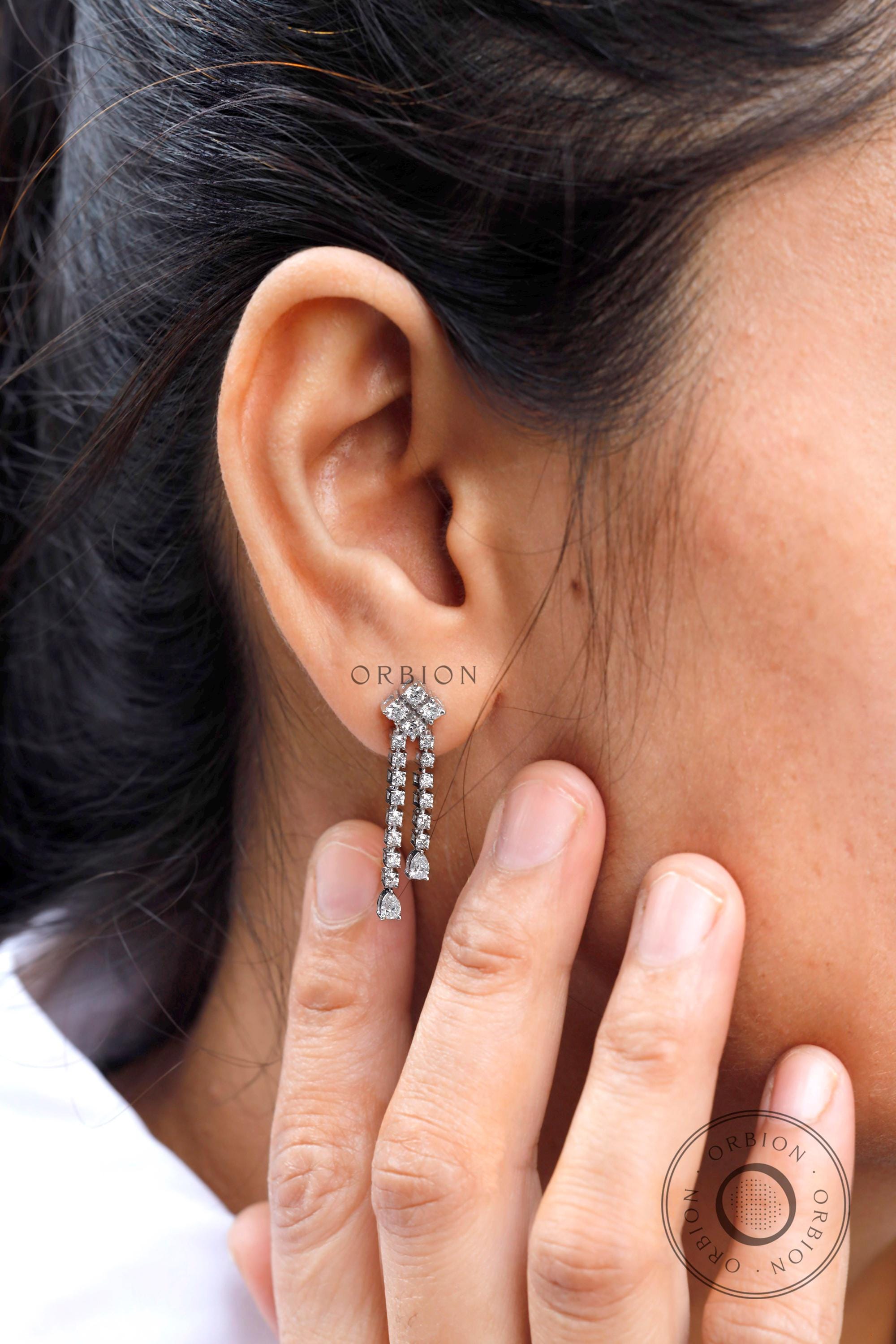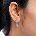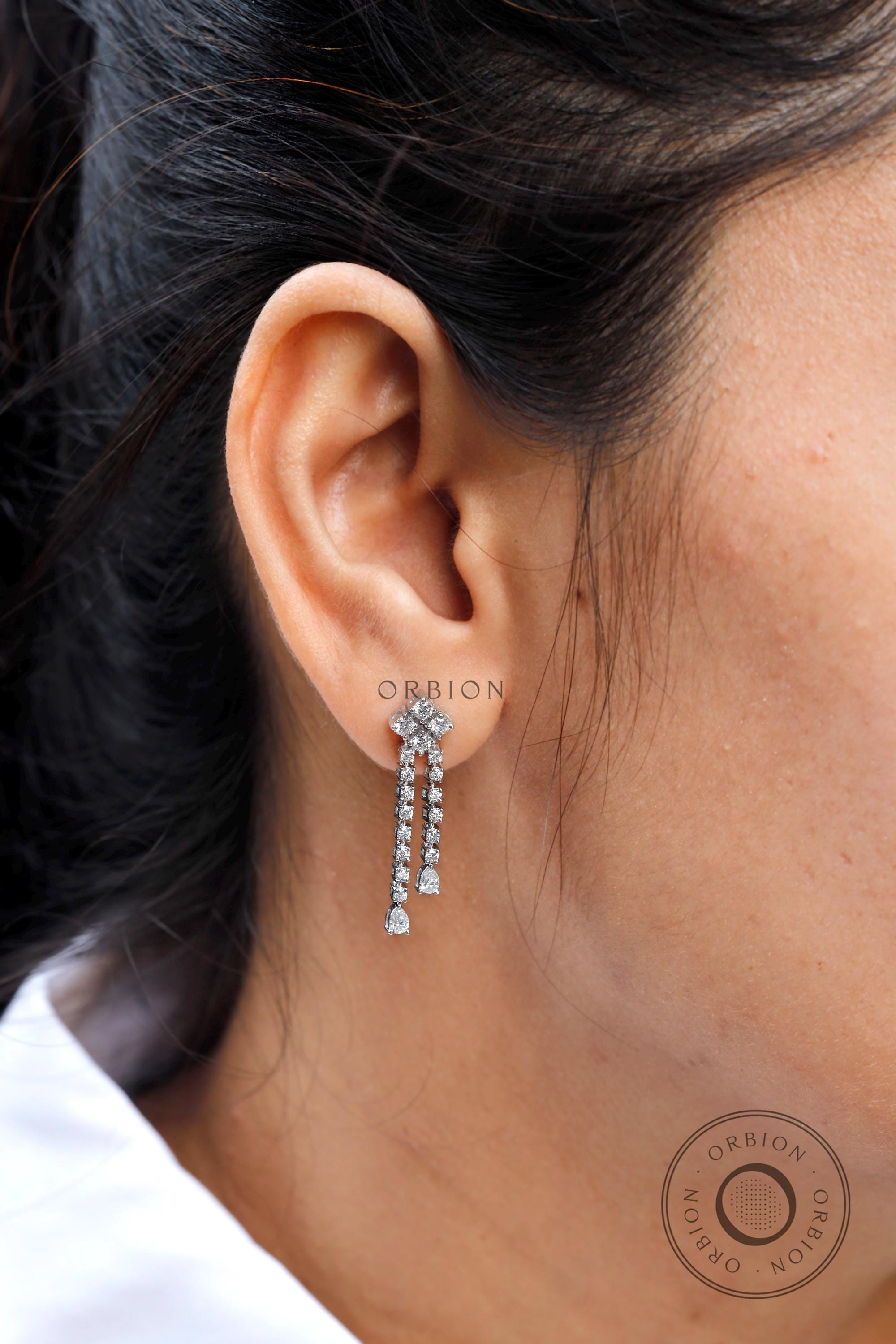Lab Grown Diamond Dangle Drop Earrings, Round & Pear Cut Diamond Flexible Double Strand Hanging Dangler Solid Gold Statement Earrings