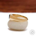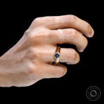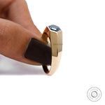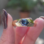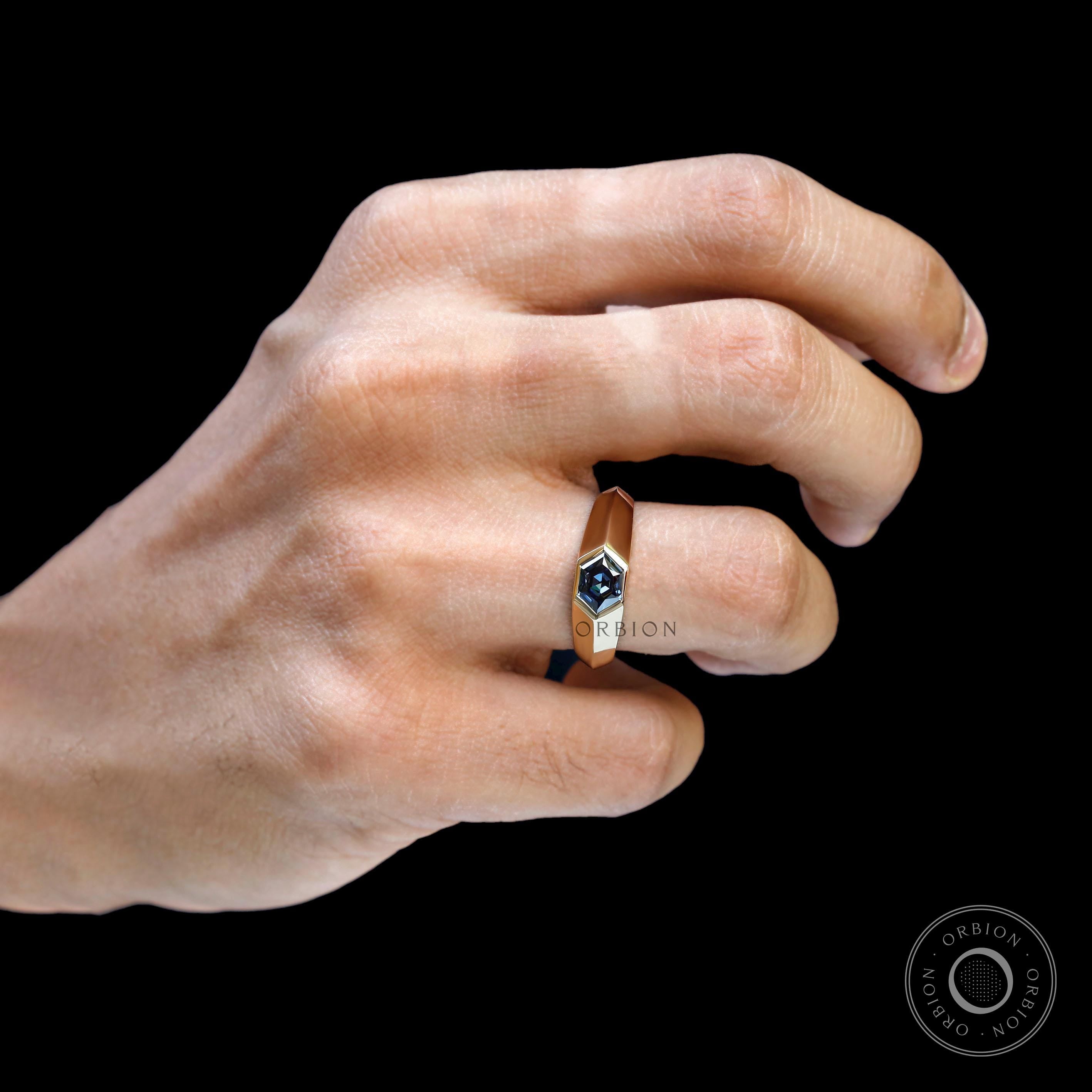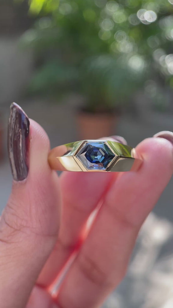 At its center, a striking Blue Hexagon Moissanite sits securely in a bezel setting, adding a touch of contemporary flair. The unique hexagonal shape of the Moissanite creates a mesmerizing contrast against the lustrous gold band, making this ring an eye-catching statement piece.