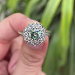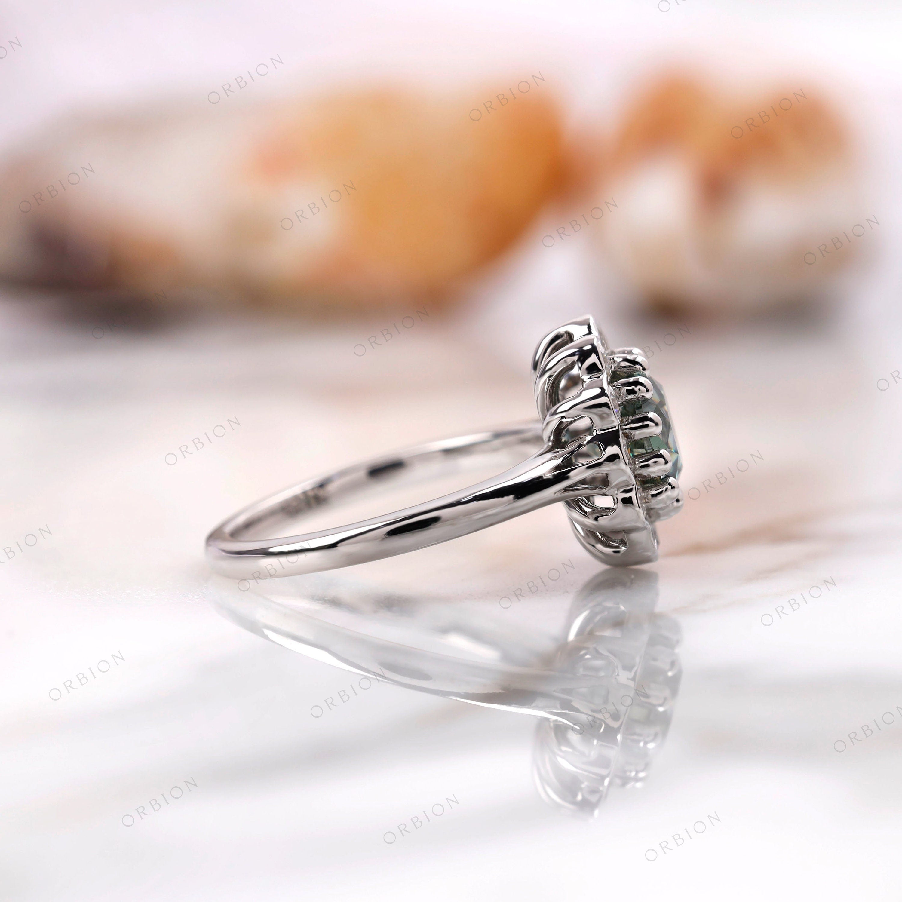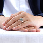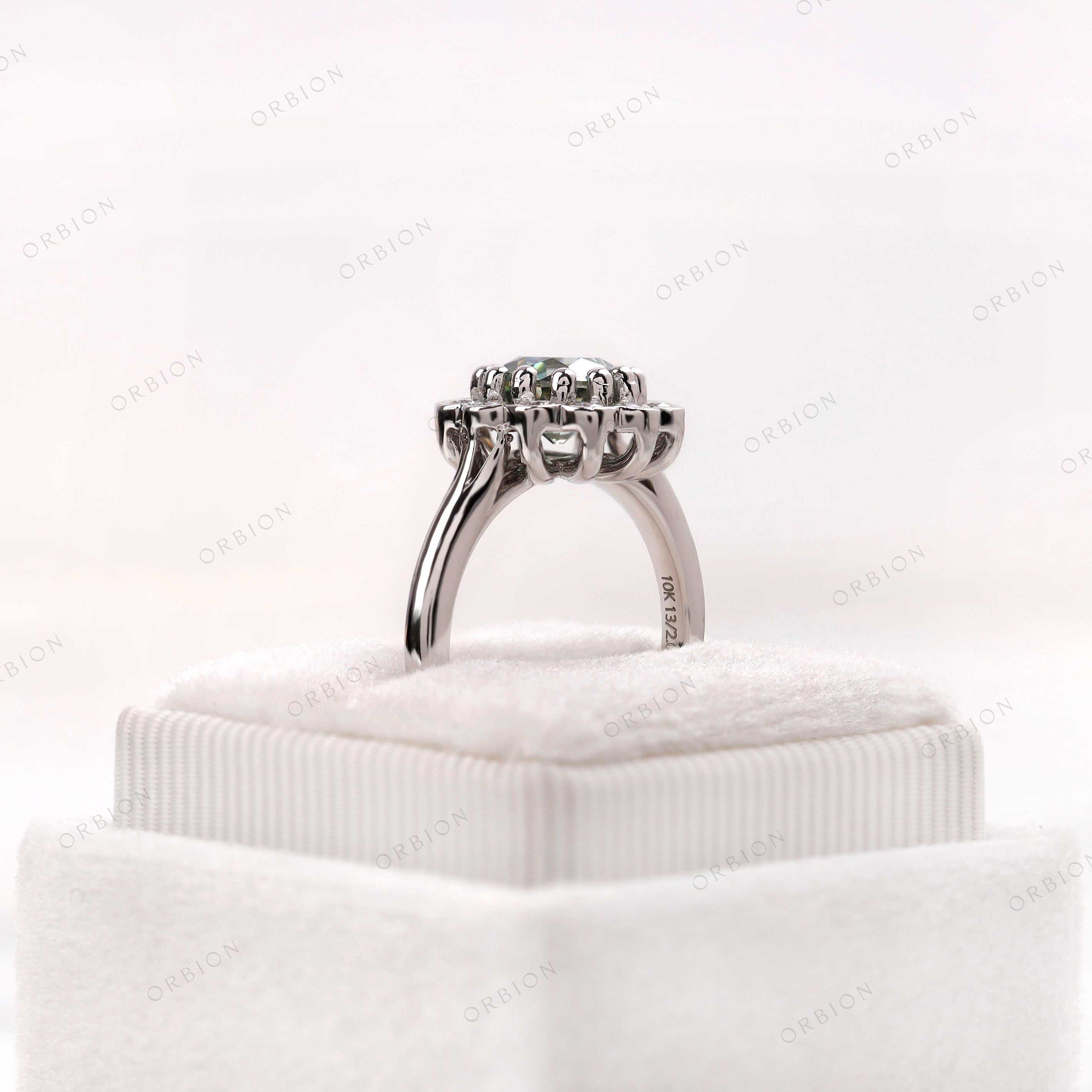 A beautiful Blue Green Old European cut Moissanite is set in a halo style with 10k white gold to create a stunning Art Deco-inspired engagement ring. The timeless design and high-quality materials make it a lasting symbol of your love and commitment. Perfect for those who appreciate vintage elegance, this ring is sure to become a cherished heirloom. Order now to add a touch of old-world charm to your special day.