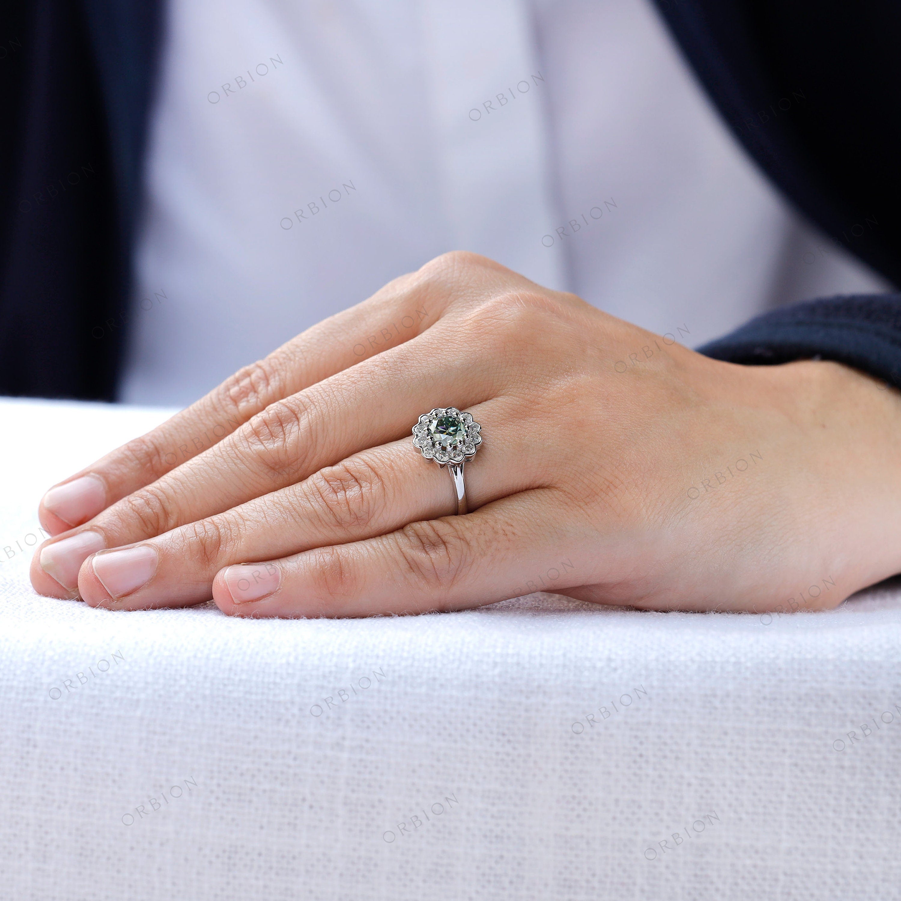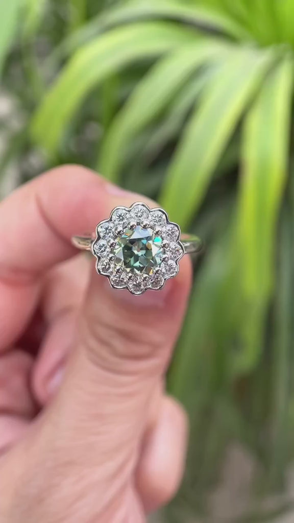 OEC Blue Green Moissanite Ring, Halo Bezel Set Ring, Cluster Wedding Ring, Floral Statement Ring, Antique Floral Ring, Art Deco Gold Ring