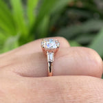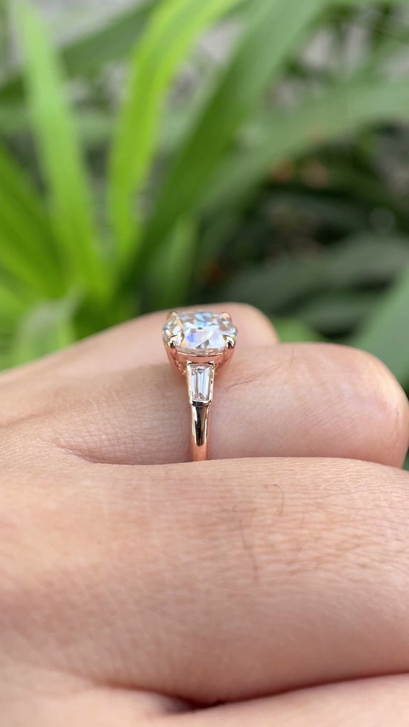 Vintage Old European Cut Moissanite Ring, Side Stone Tapered Baguette, Three Stone Engagement Ring, Four Prong Setting, Rose Gold Ring