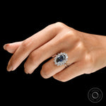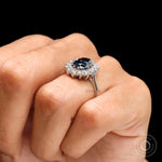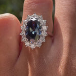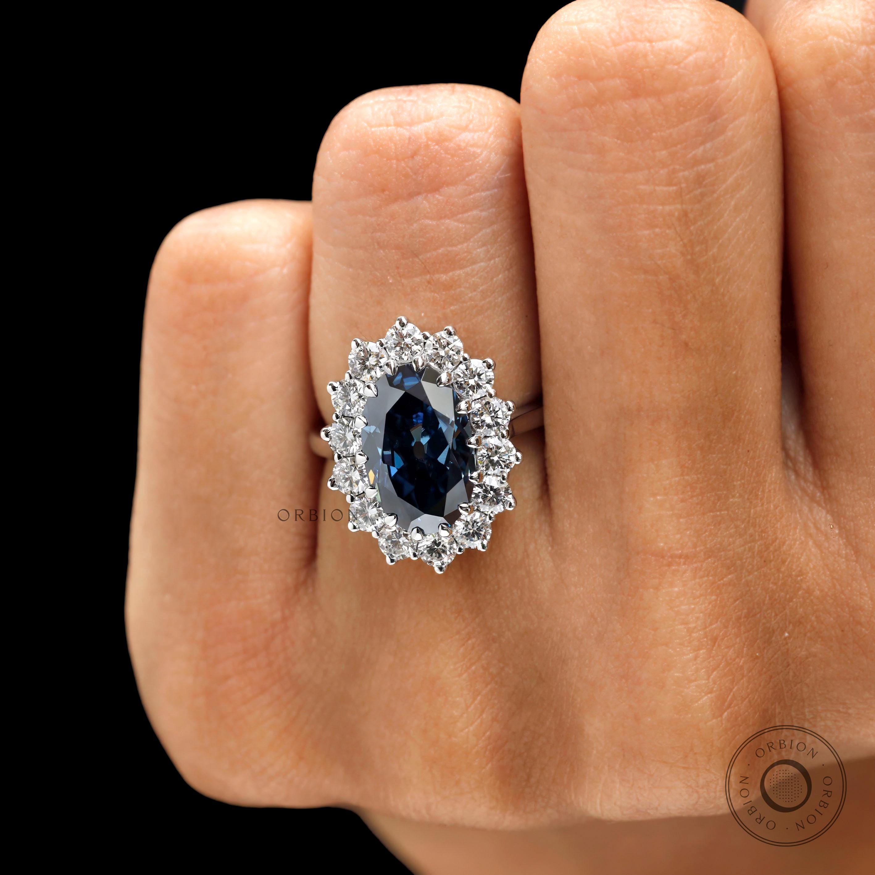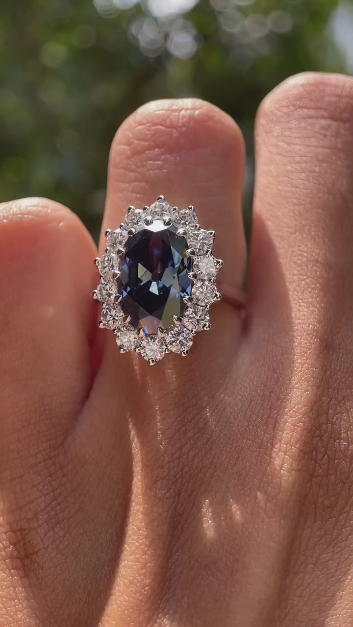 Old Mine Cut Oval Deep Blue Moissanite Ring, Princess Diana Ring, 18K White Gold Cluster Halo Engagement Ring, Statement Ring For Women